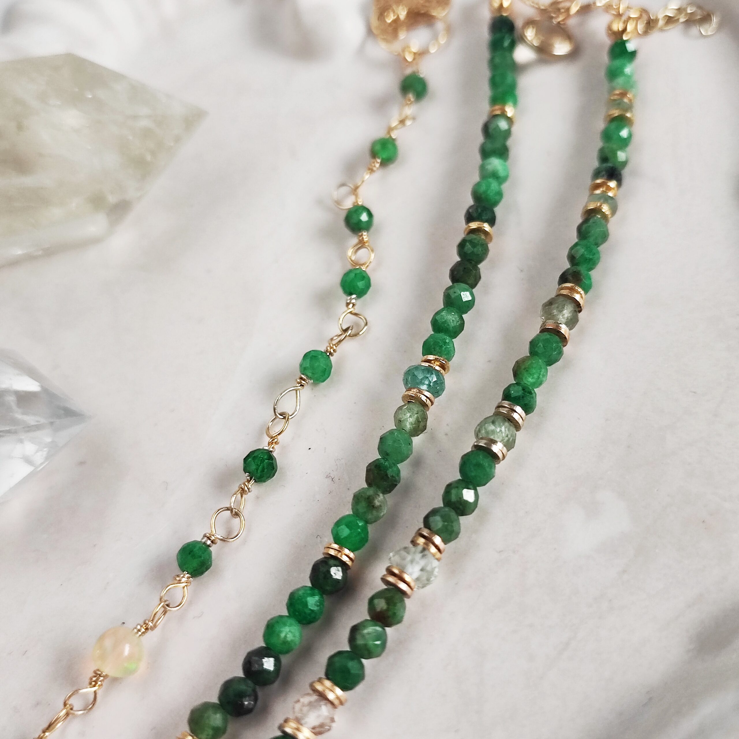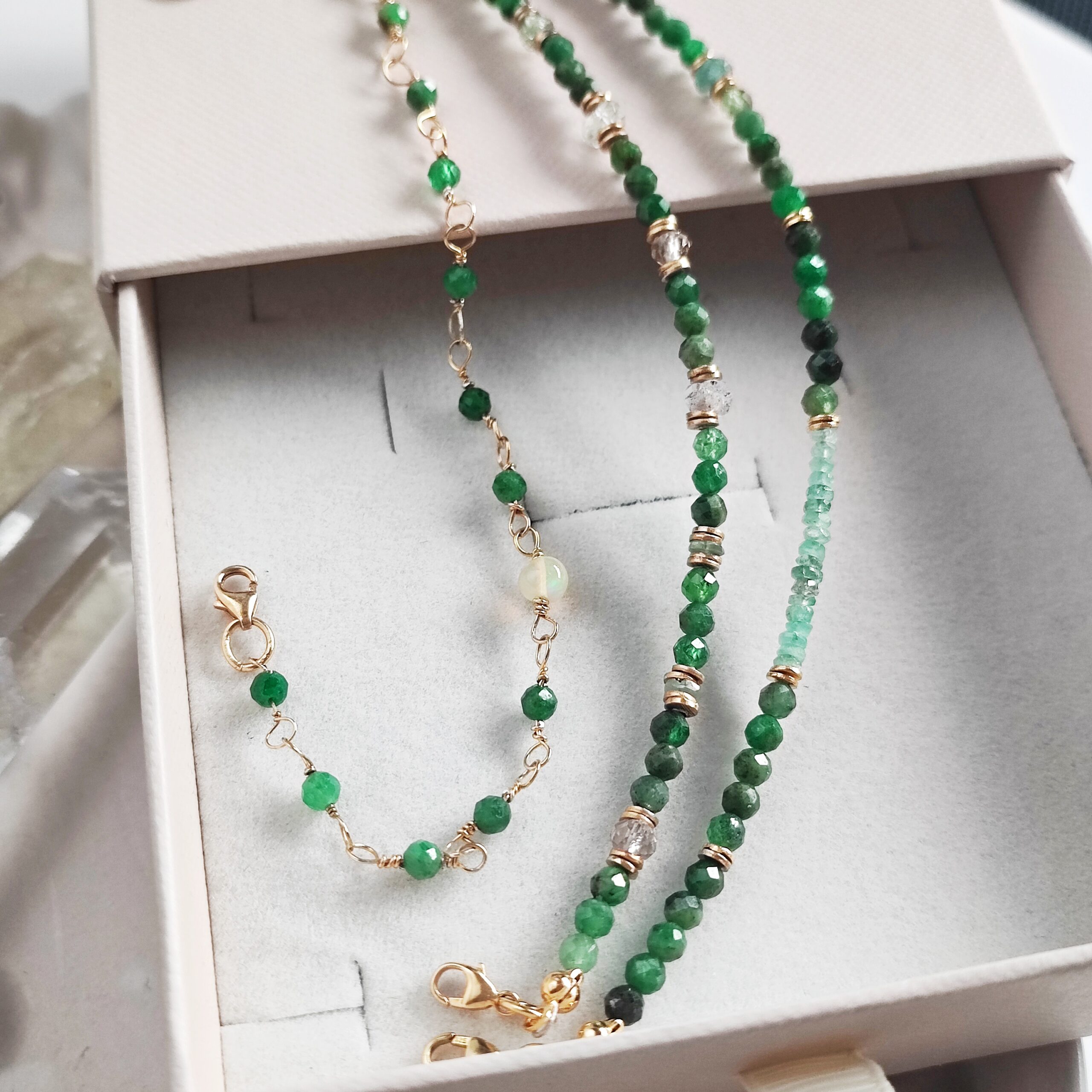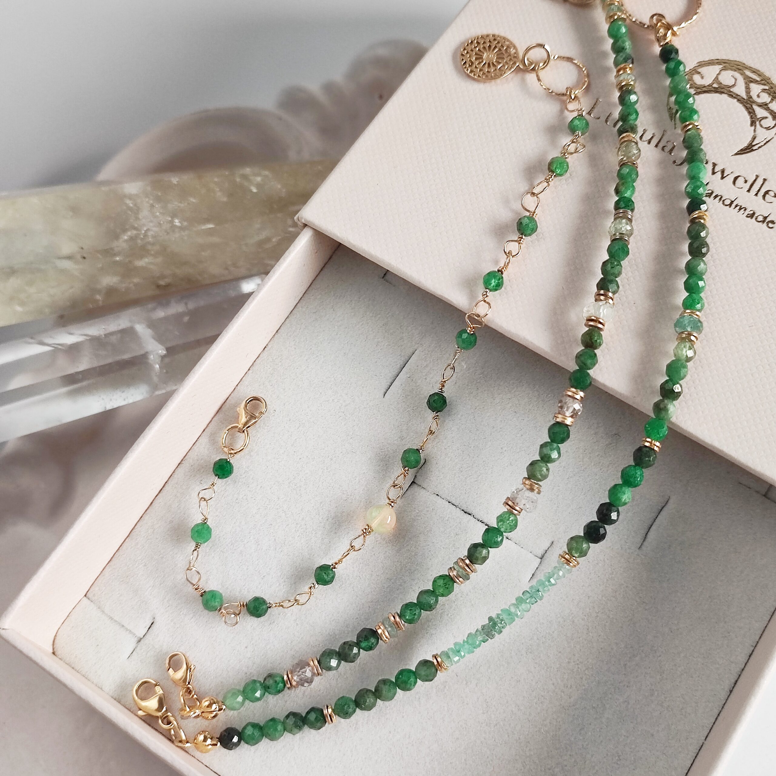 Tsavorit (3 mm) kombiniert mit einer Reihe feiner, facettierter Smaragd-Rondellen (1 × 2 mm) sowie einem größeren, besonders schönen Smaragd (4 × 2 mm).