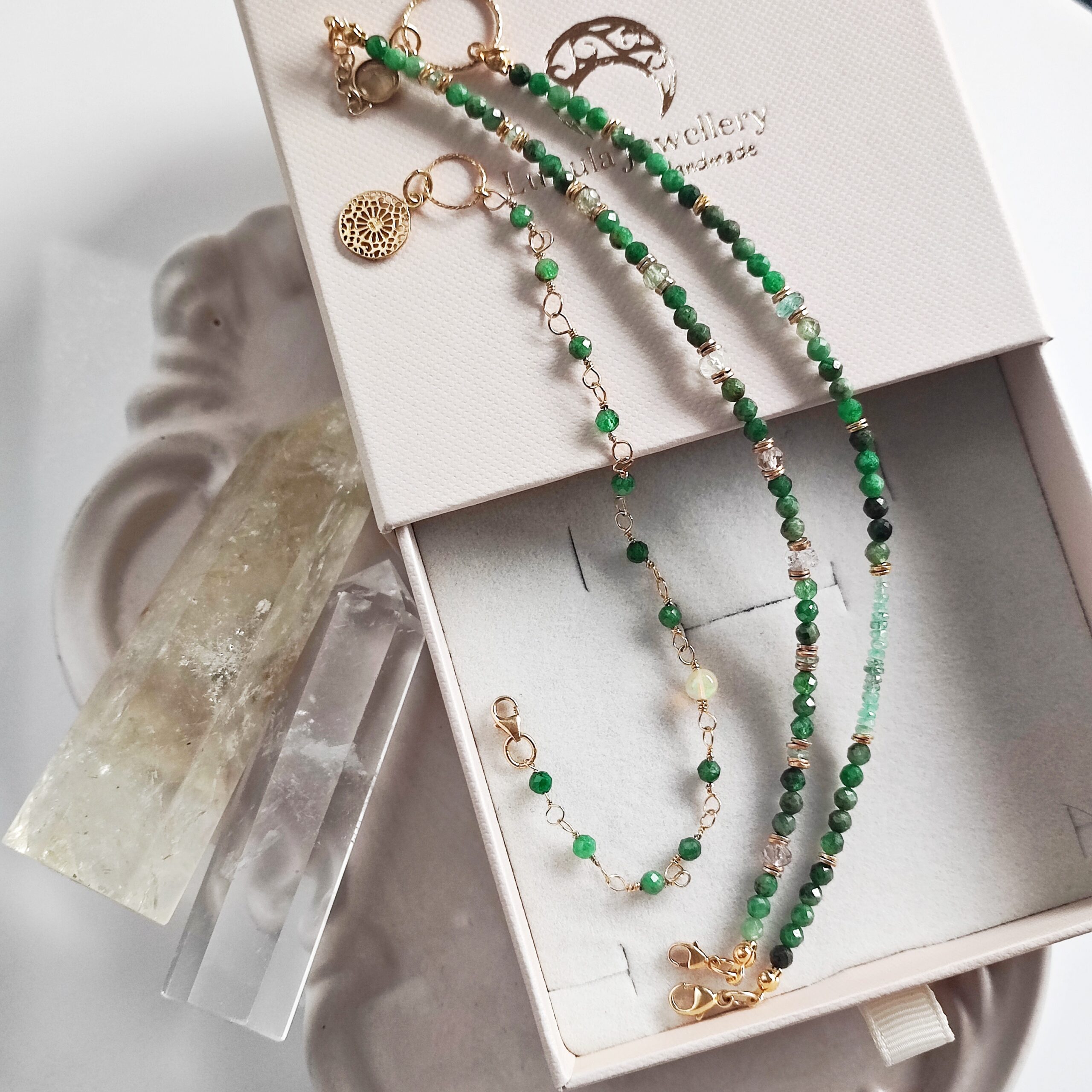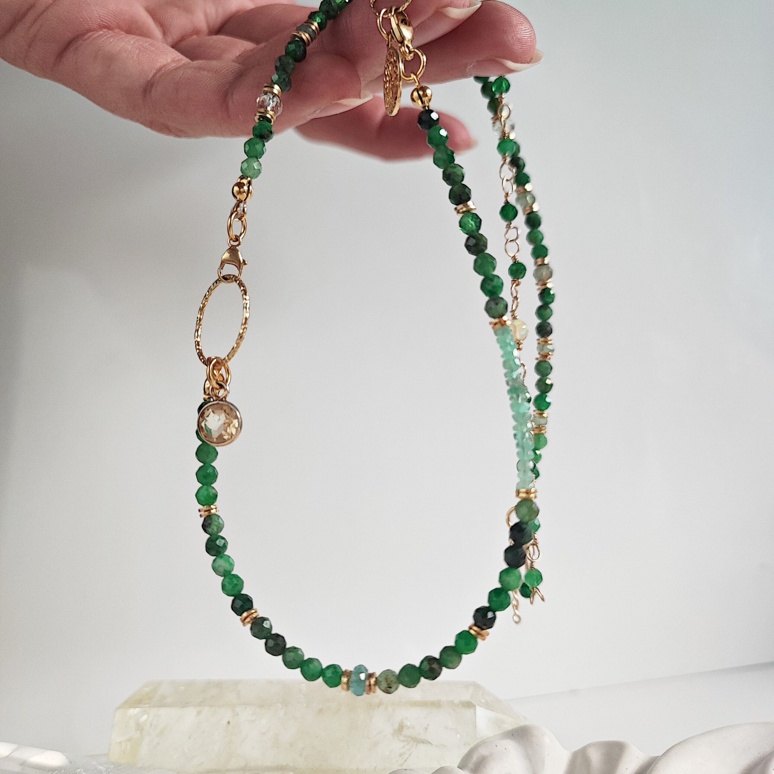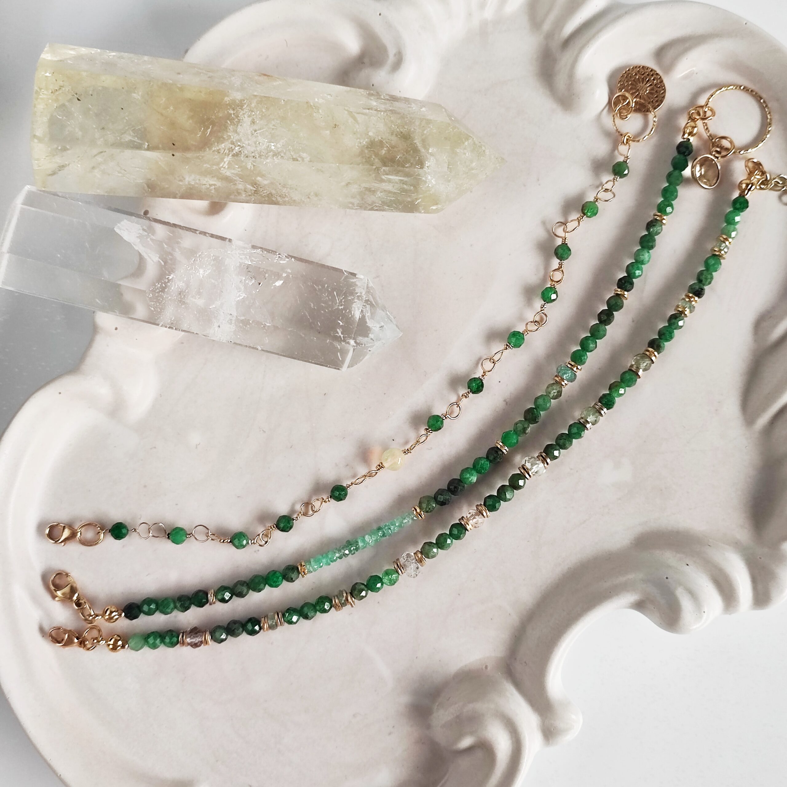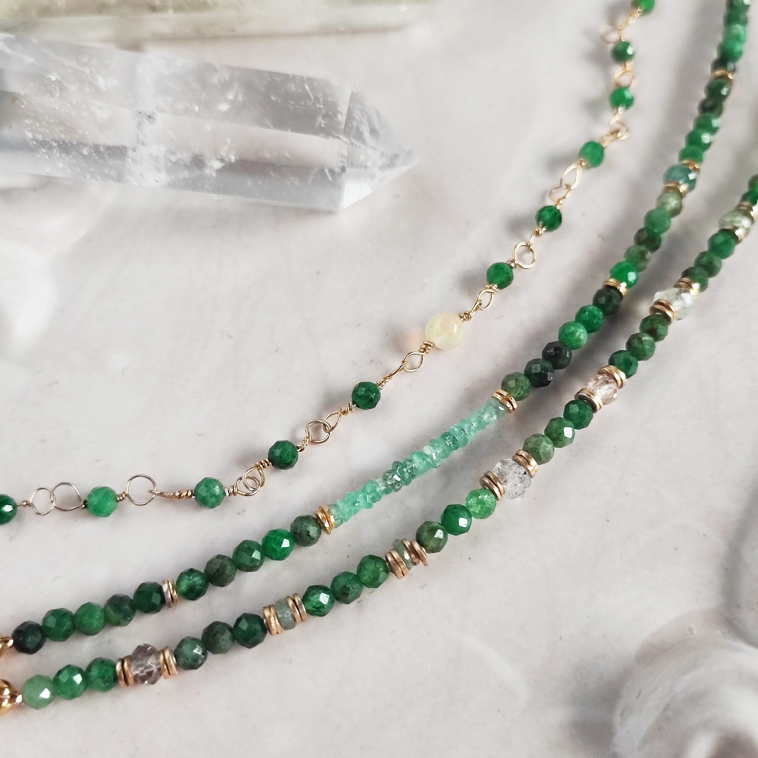 Tsavorit (3 mm) kombiniert mit einer Reihe feiner, facettierter Smaragd-Rondellen (1 × 2 mm) sowie einem größeren, besonders schönen Smaragd (4 × 2 mm).