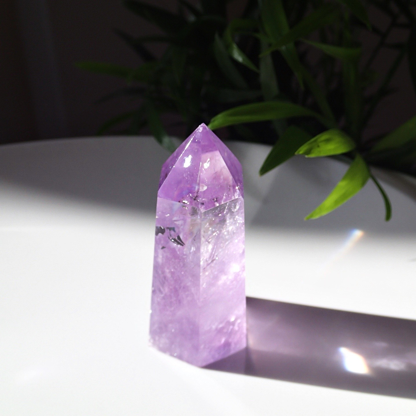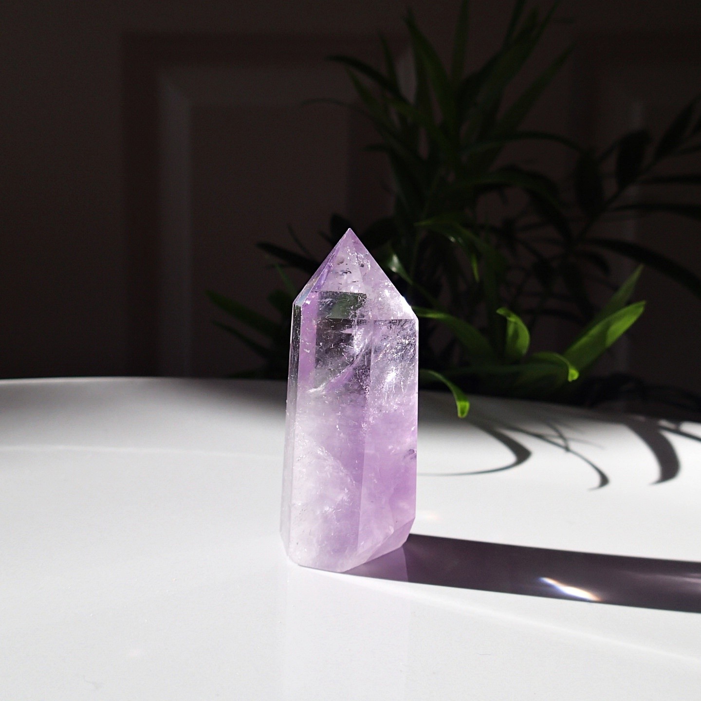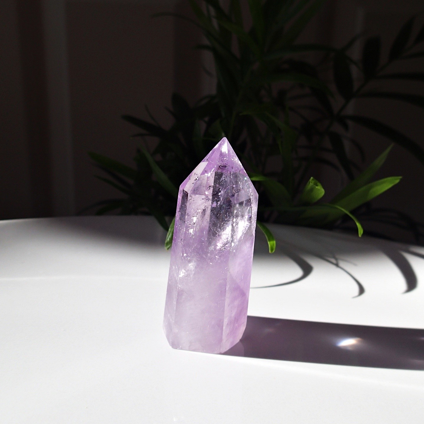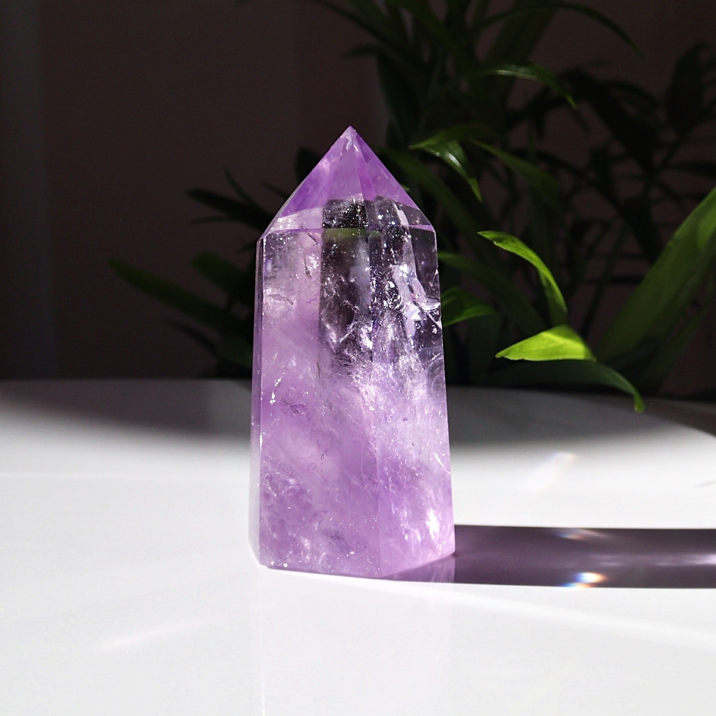 Der hochwertige, klare Amethyst – ausgezeichnete scharfe Spitze und glatte Wände. Steht dank der flachen Basis von alleine aufrecht.