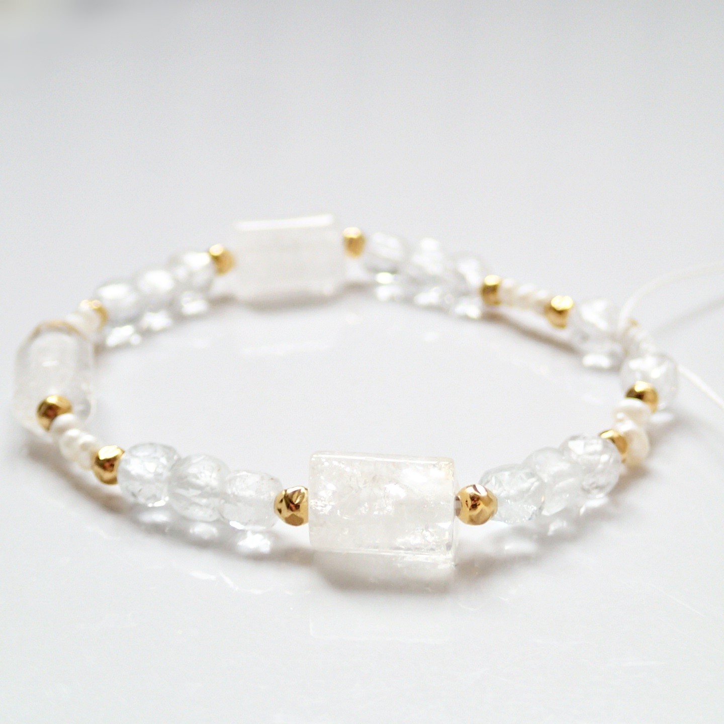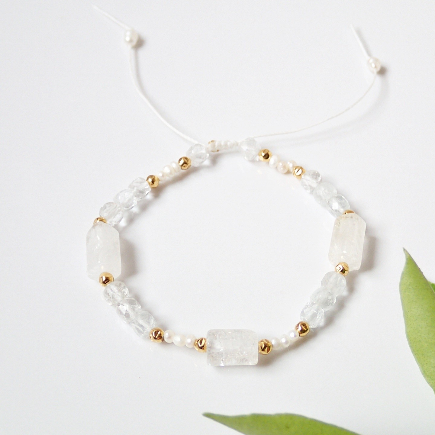 Ein einzigartiges, handgefertigtes Armband an einer weißen Schnur. Bestehend aus drei Steinen – Quarz, Süßwasserperlen und transparenten Topaswürfeln. Verziert mit Silber (925) vergoldeten Kugeln mit gehämmerter Struktur. Mit dem richtigen Licht können schöne Einschlüsse (weiße und mehrfarbige Reflexe) in Quarz und Topas beobachtet werden.