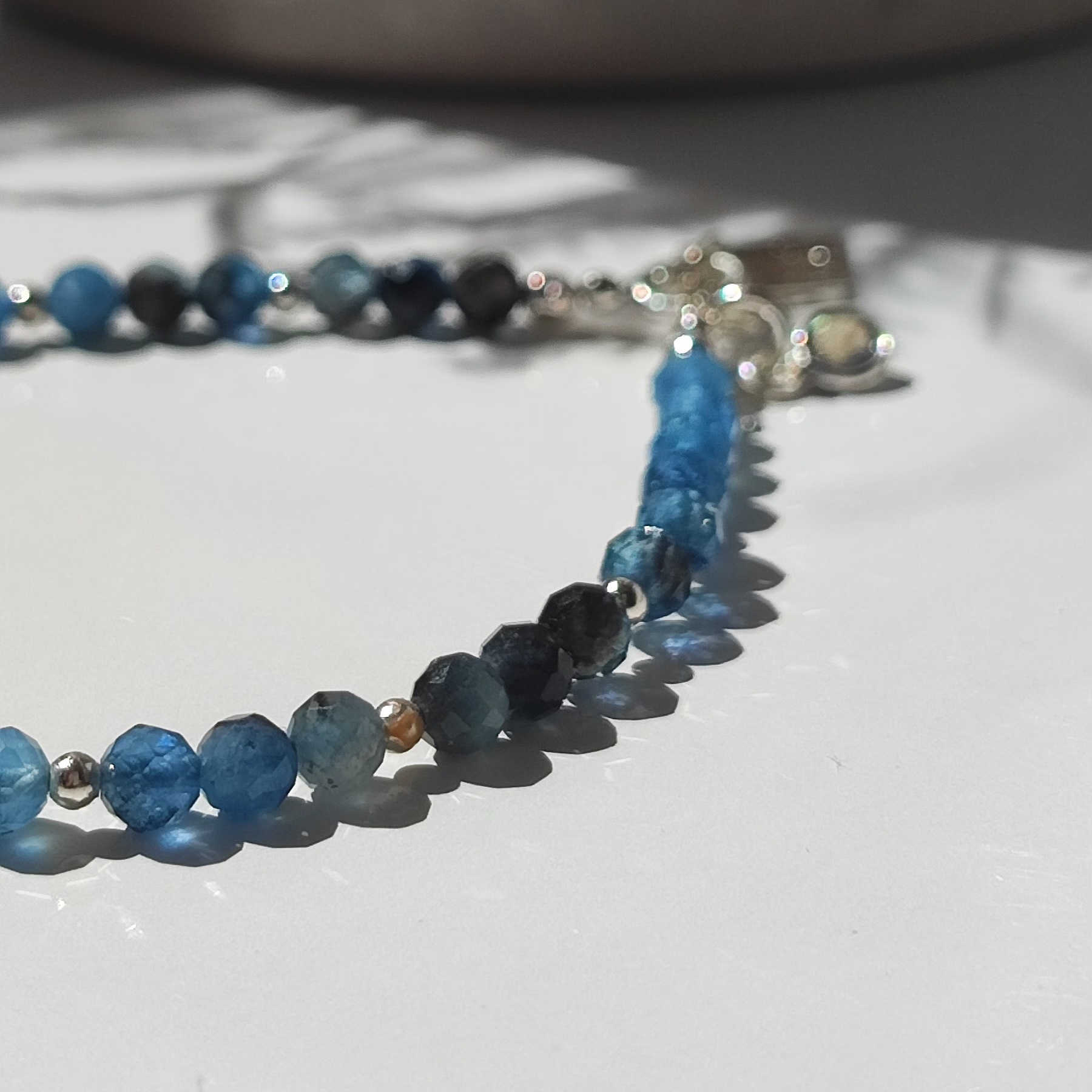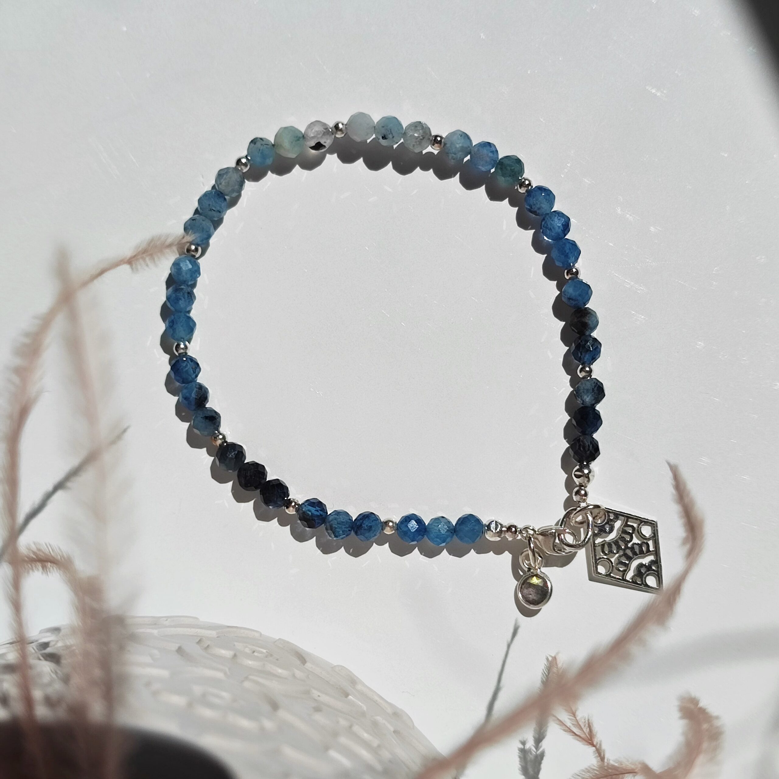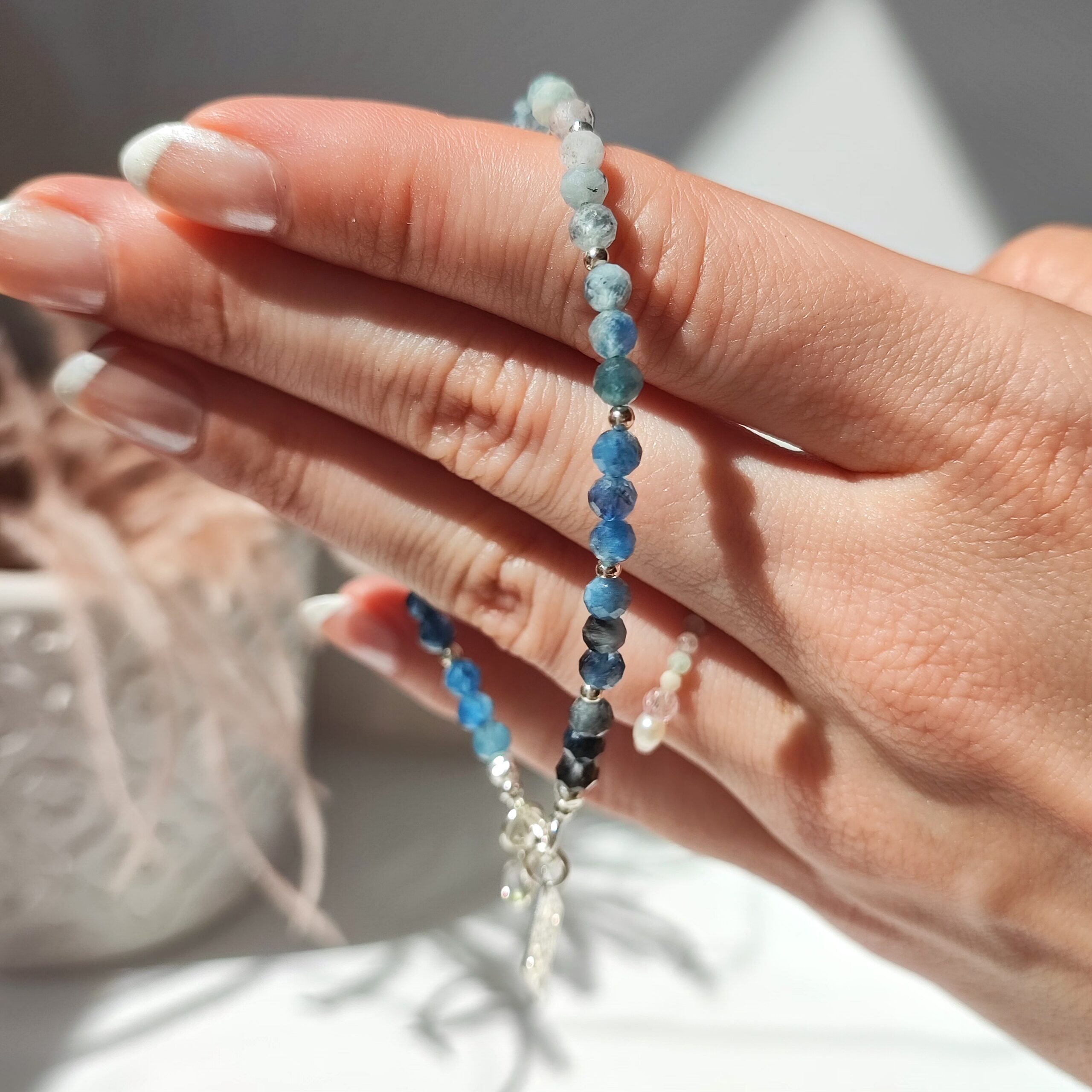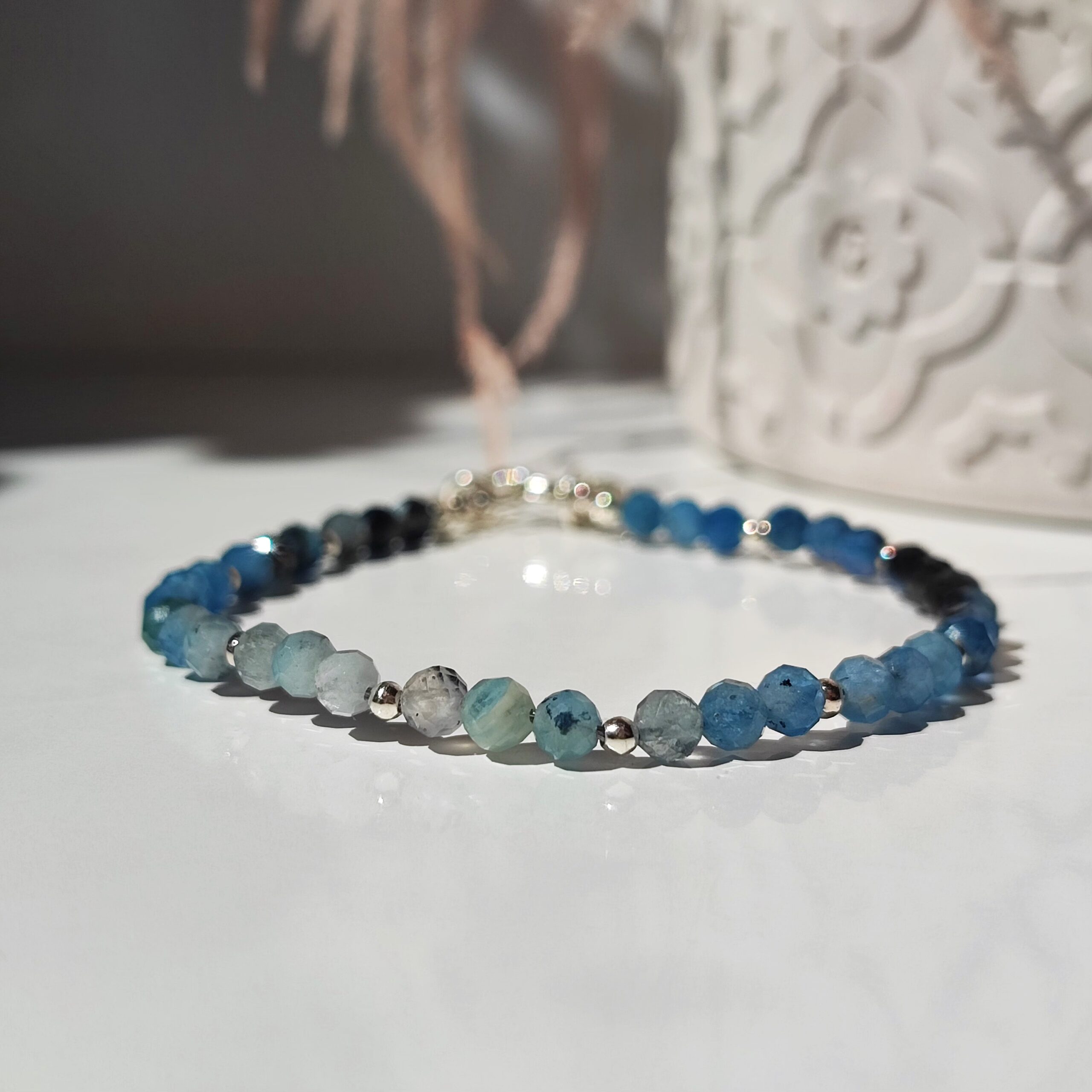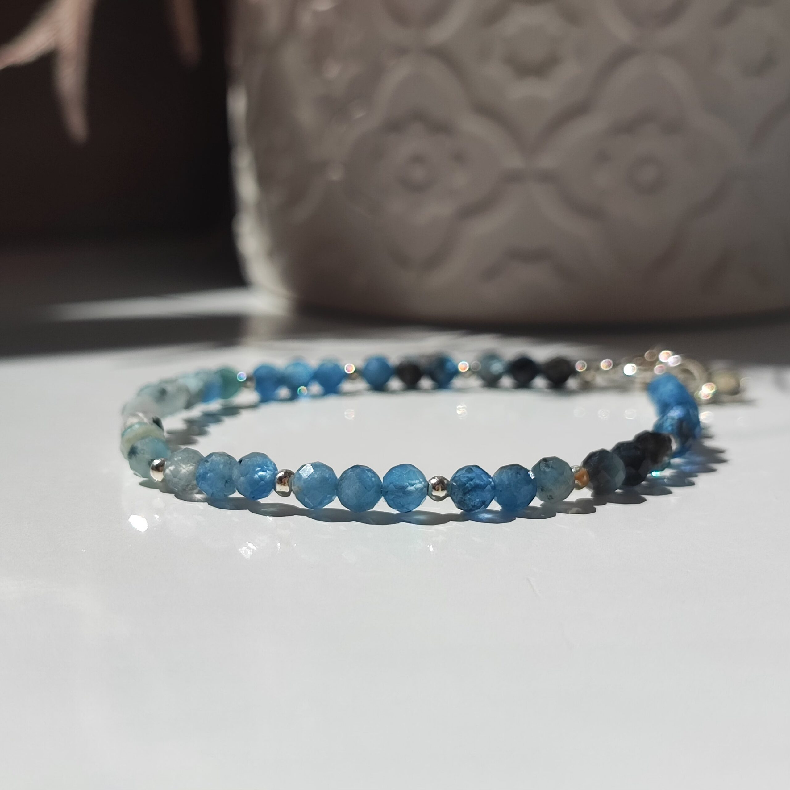 Handgefertigtes Armband aus natürlichem Aquamarin, genannt “Devil’s Blue Aquamarine”. Die Steine sind so angeordnet, dass sie einen harmonischen Farbverlauf bilden. Die Farbe des Steins ist natürlich und zeigt wunderschöne Blautöne von sehr hell bis intensiv blau bis hin zu sehr dunkel, fast schwarz. In der Option mit Anhänger am Verschluss sind zwei Anhänger enthalten: einer mit Labradorit und einer filigran gearbeitet, in der vergoldeten Version ein etwas anderer, aber ebenso schöner Anhänger (ein Foto wird bald hinzugefügt). Das Armband hat eine Verlängerung von 2 cm.