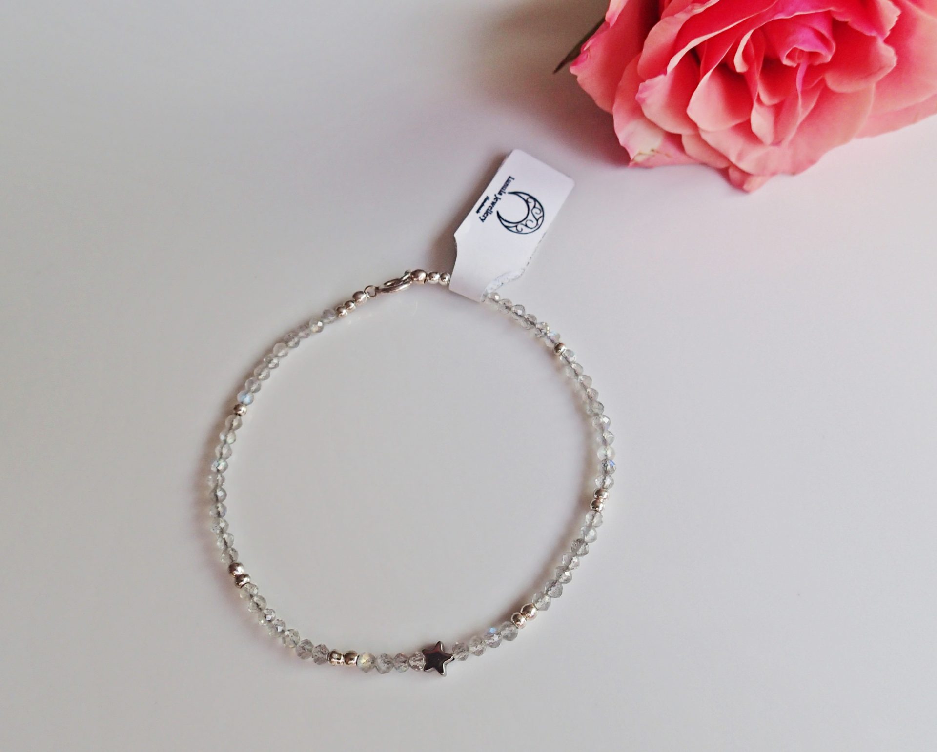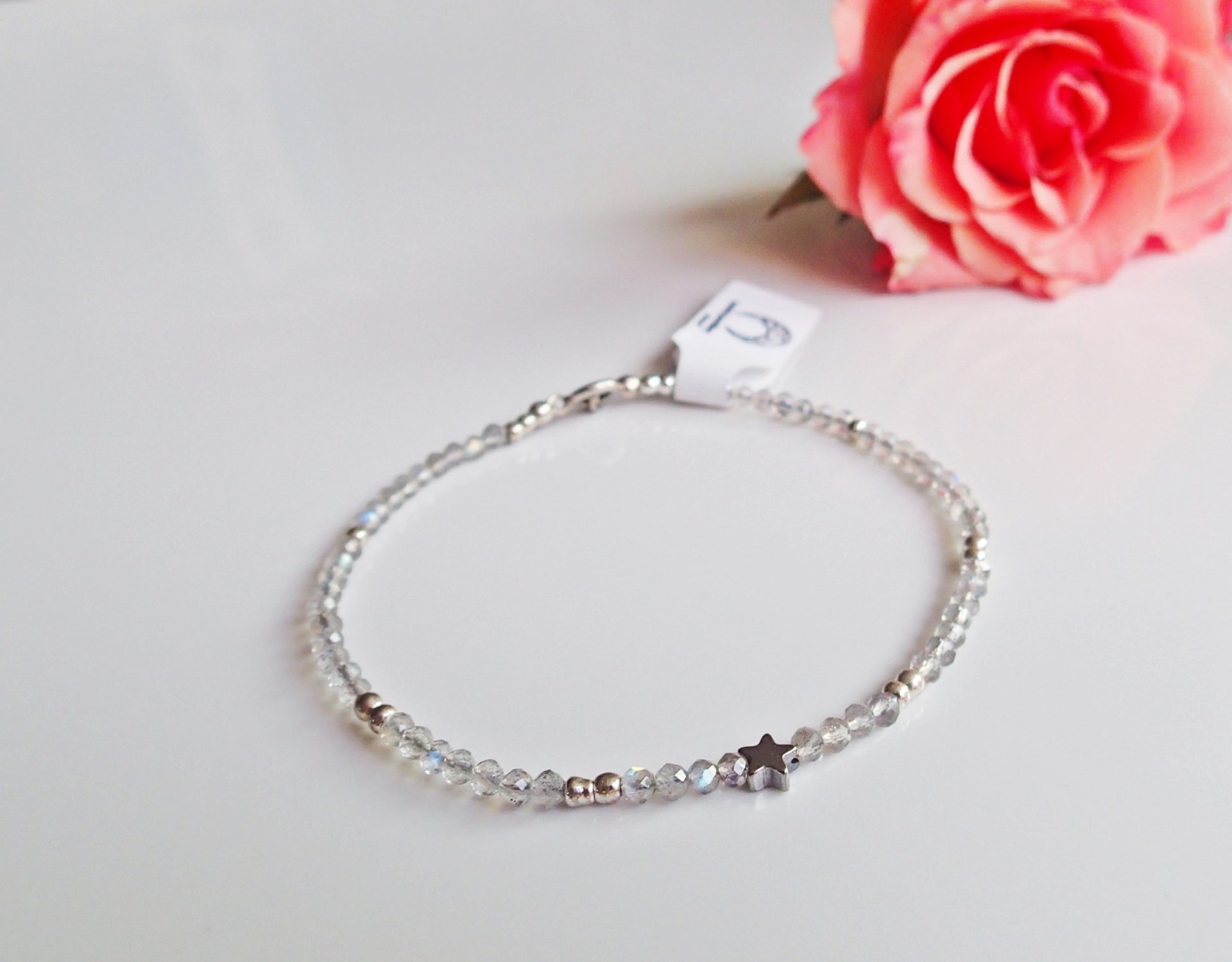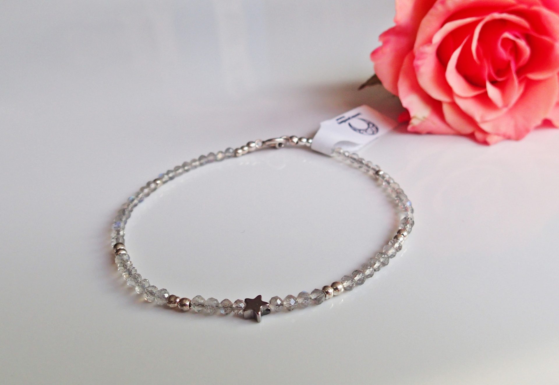 Handgefertigtes Armband aus natürlichen Labradorit- und silbernen Hämatitperlen. In der Mitte wird es von einem Hämatitstern geschmückt. Der Verschluss ist komplett aus 925er Silber gefertigt.