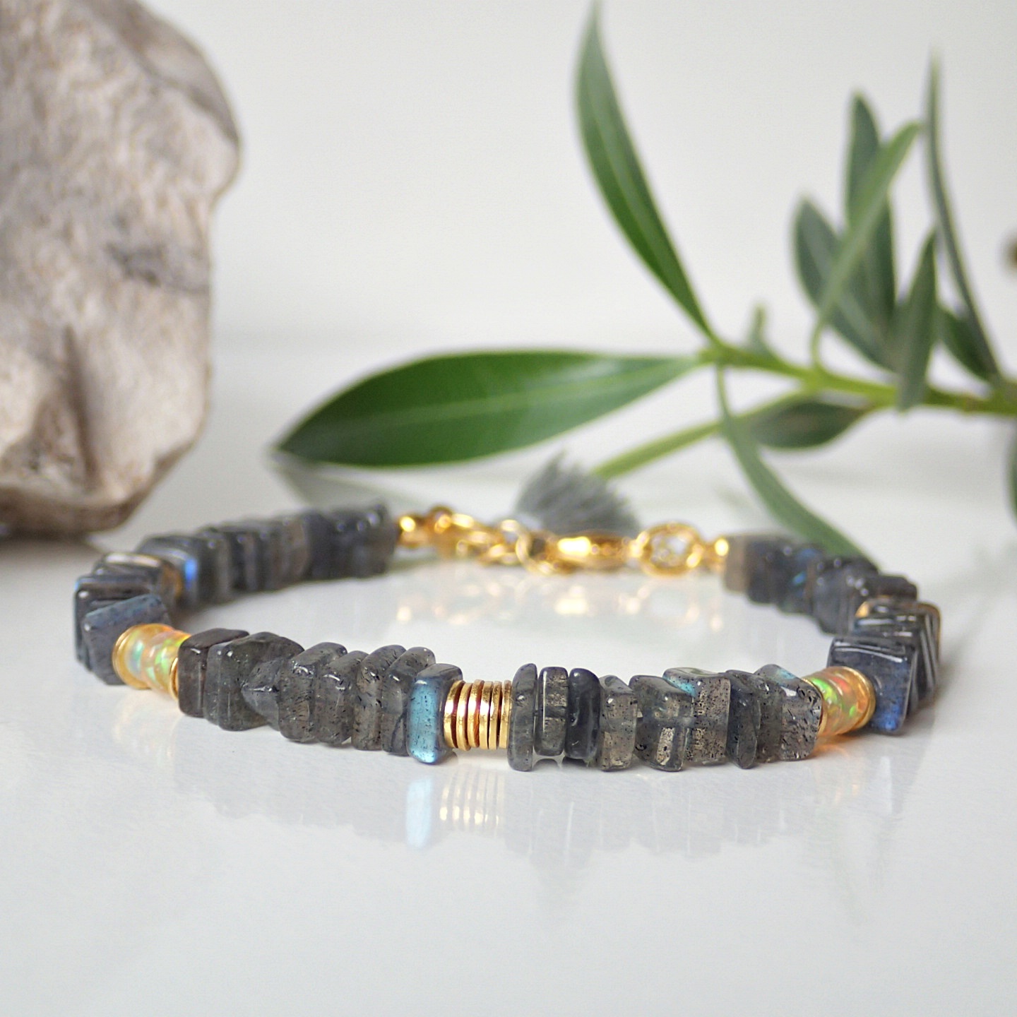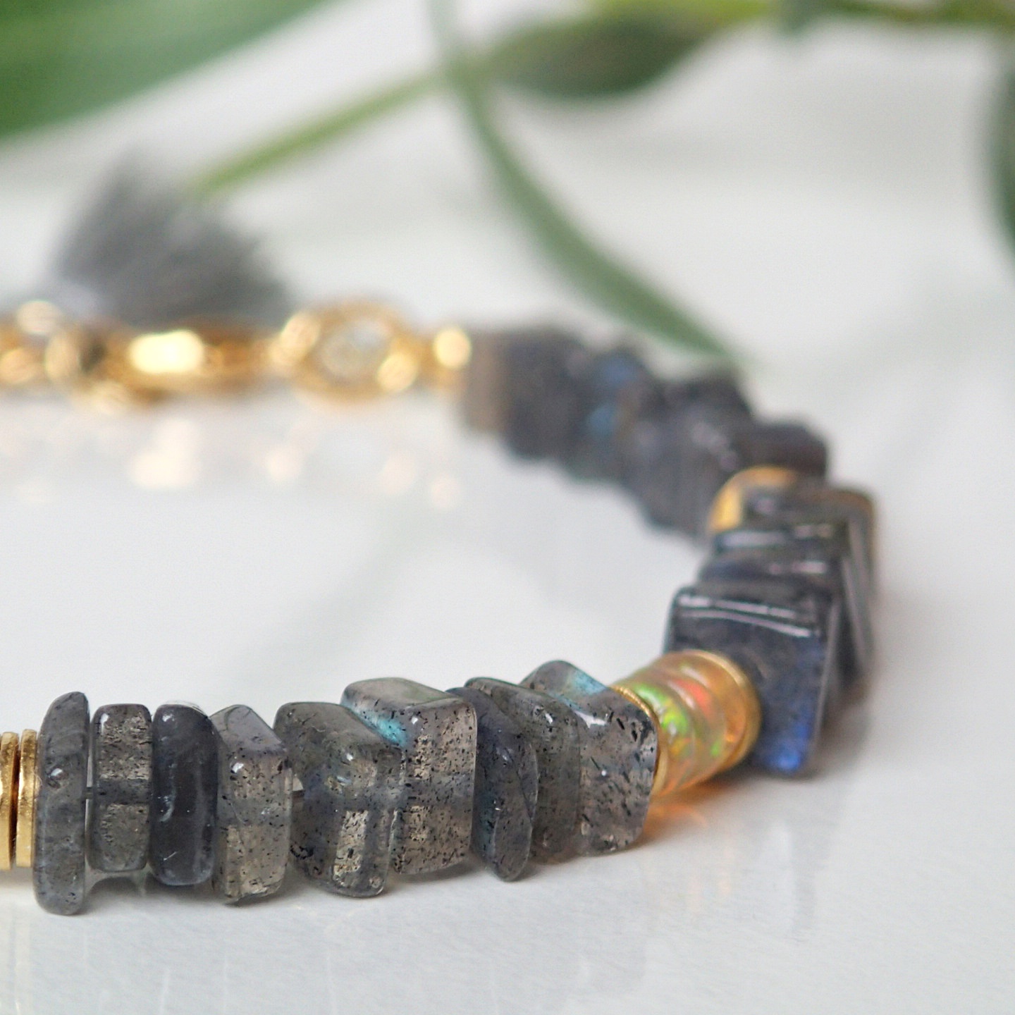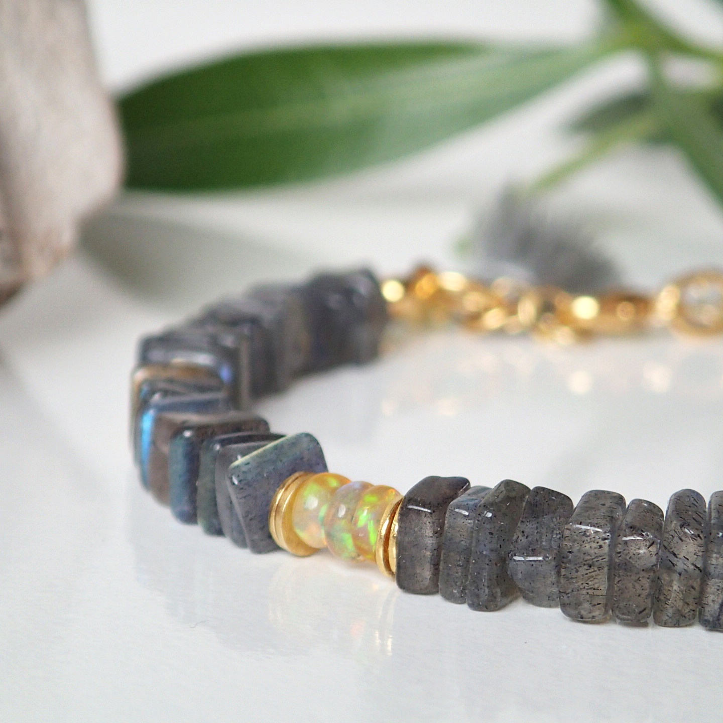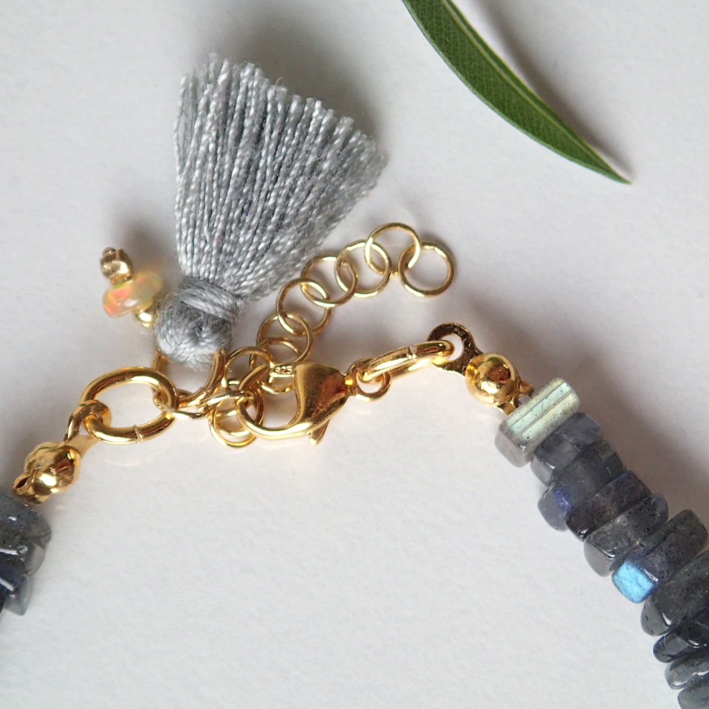 Handgefertigtes Armband aus natürlichem Labradorit und edlem Welo-Opal in erdigen Farben. Alle dekorativen Elemente und Verschlüsse sind aus 925er Silber gefertigt und mit 24-karätigem Gold überzogen. Verziert mit einem grauen Quaste und Opal am Verschluss.