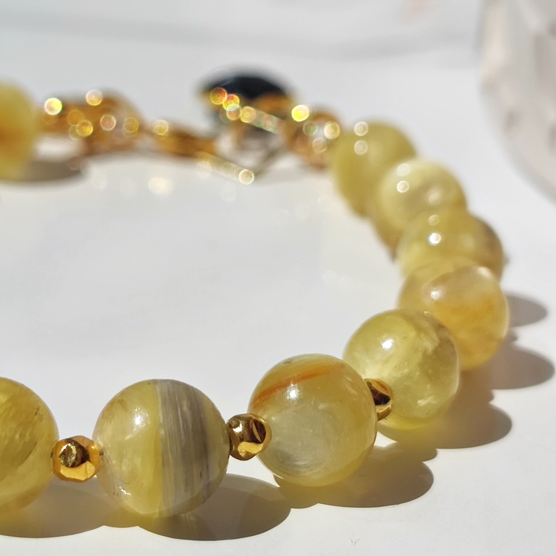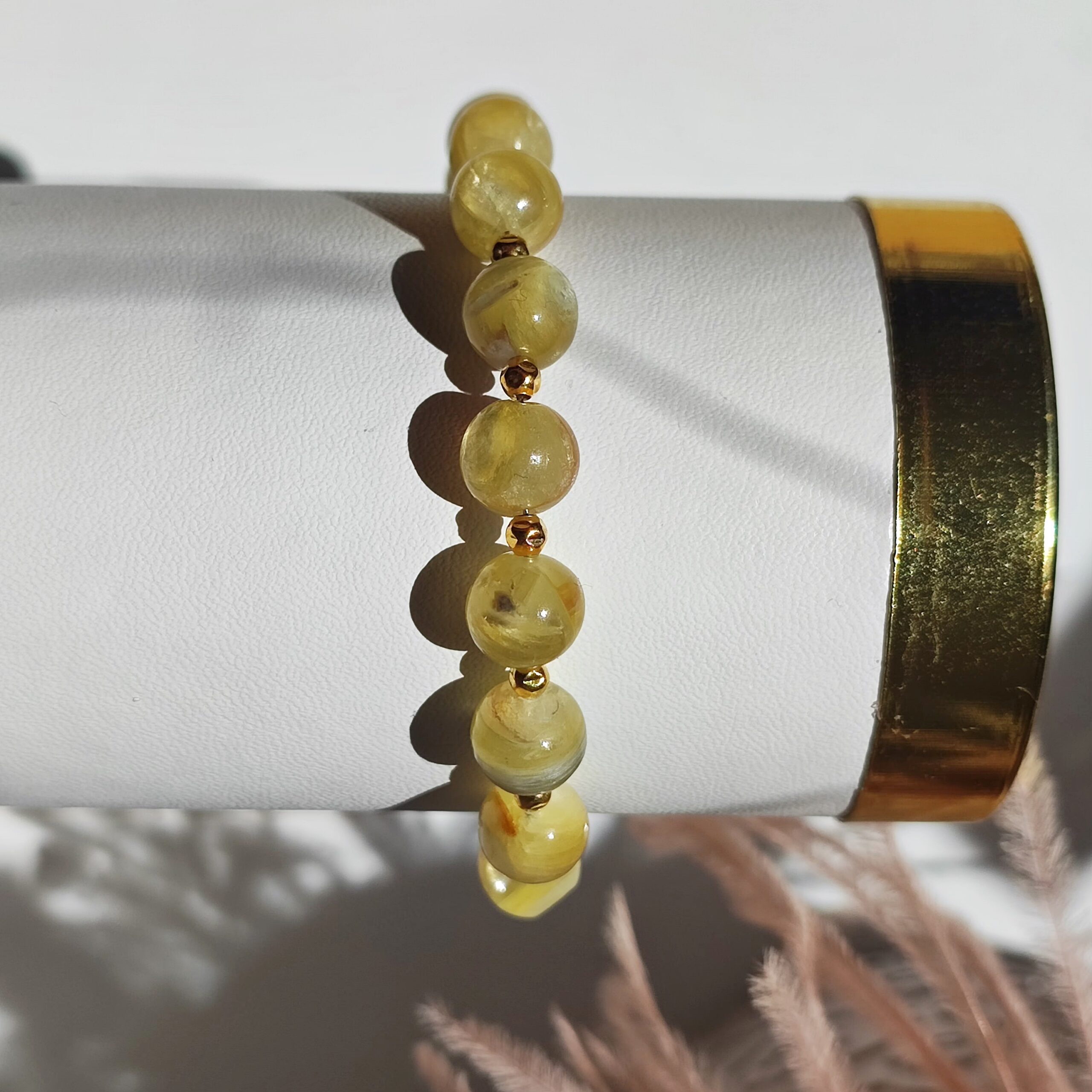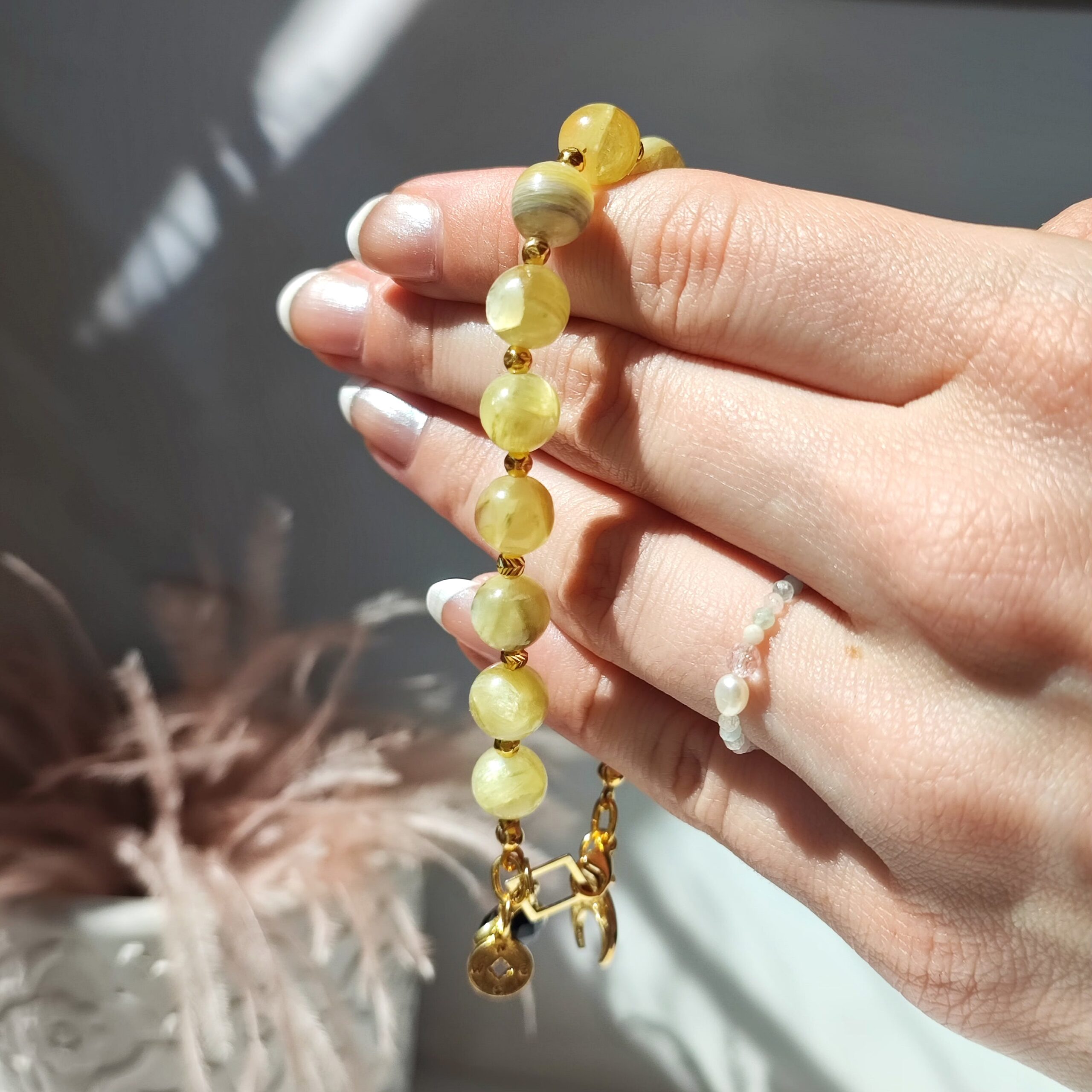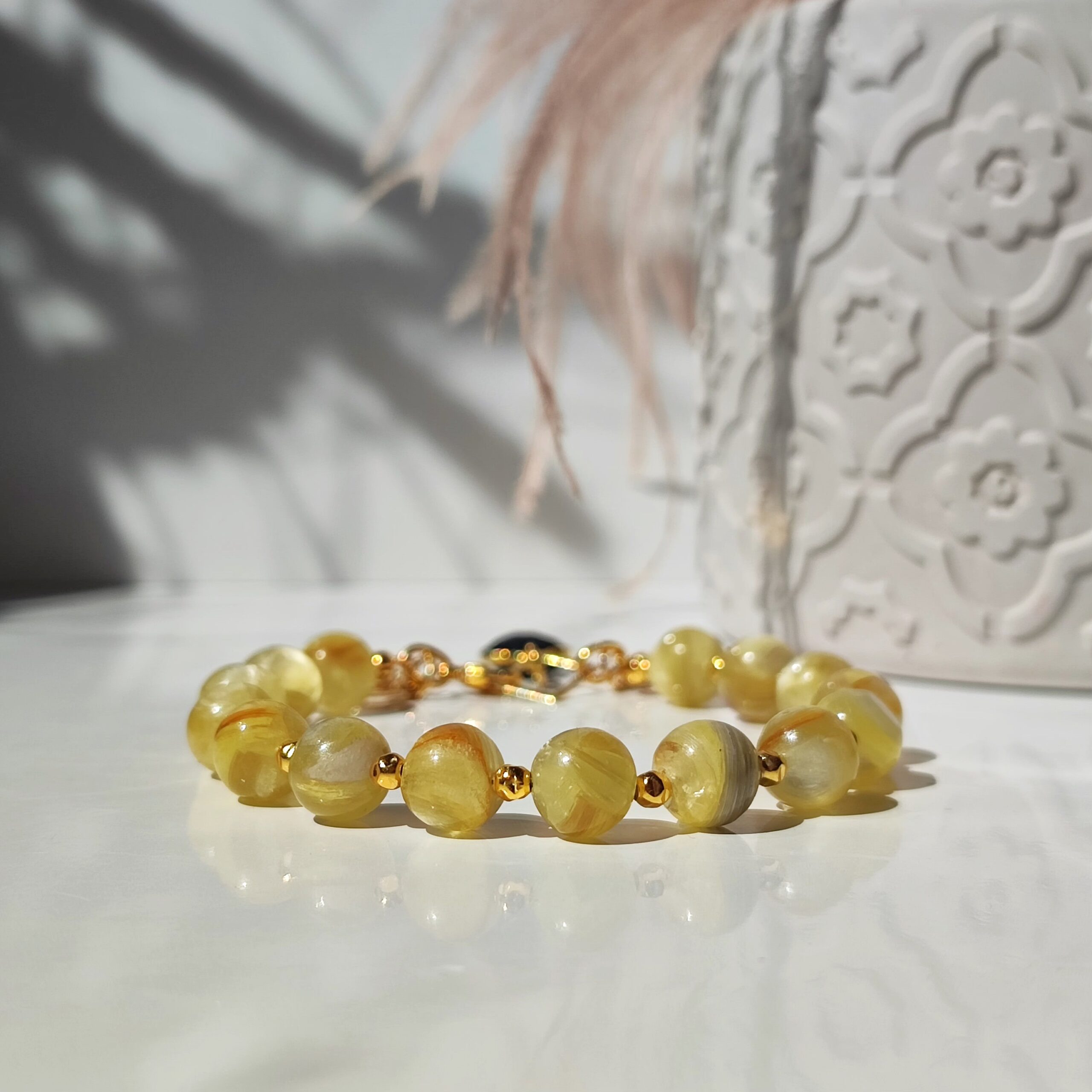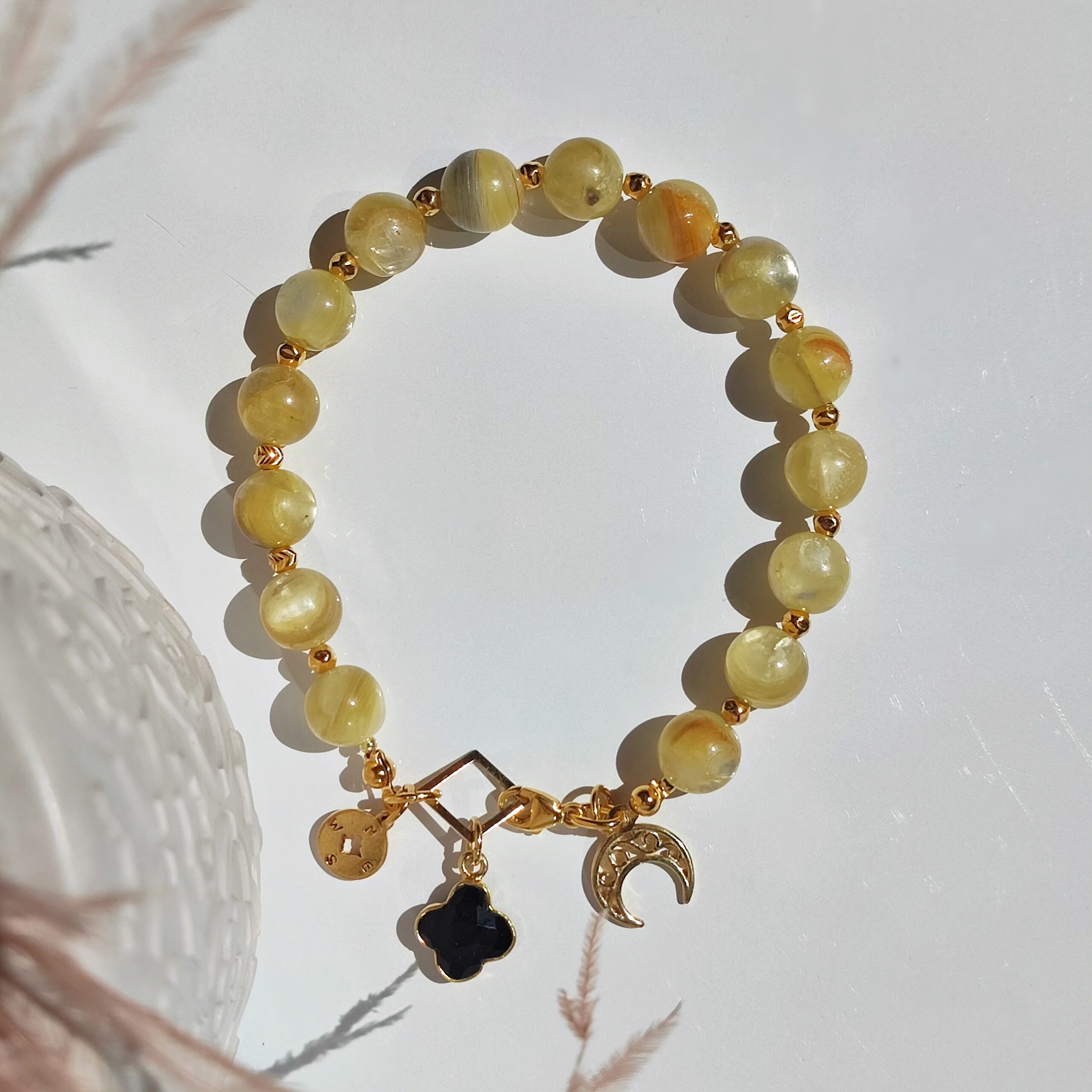 Einzigartiges, handgefertigtes Armband aus natürlichem, im Licht schimmerndem – seltenem, goldenem Lepidolith. Das Armband hat beim Verschließen drei Anhänger: den Halbmond – Lunula, ein marokkanisches Kleeblatt aus Onyx und eine Windrose. Alle dekorativen Elemente und Verschlüsse sind aus 925er Silber gefertigt und mit 24 Karat Gold vergoldet.