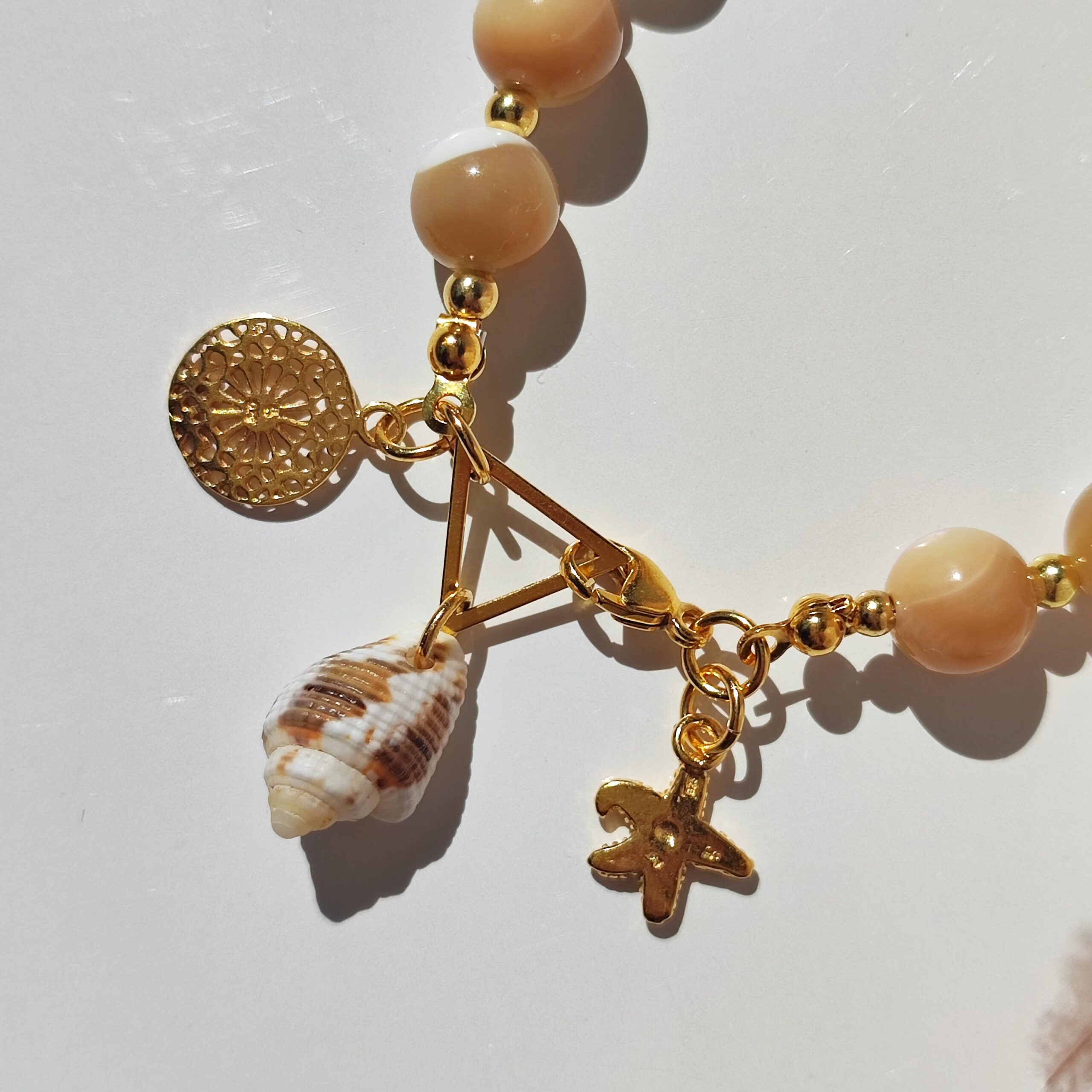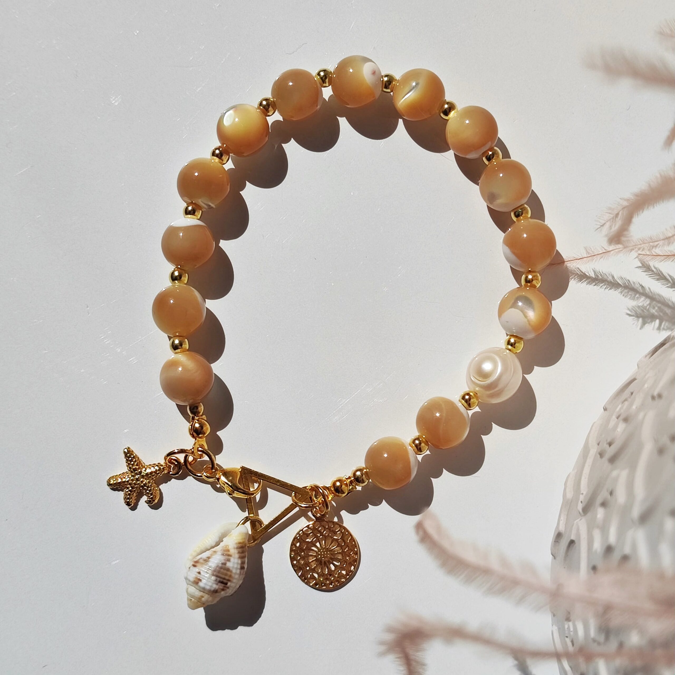 Handgefertigtes Armband aus natürlicher, im Licht schillernder Muschel, einer Süßwasserperle, verziert mit drei Anhängern am Verschluss – Rosette, Seestern und Muschel von der karibischen Insel Guadeloupe. Alle Verschluss- und Zierelemente sind aus 925er Sterlingsilber gefertigt und mit zwei Mikronen 24-karätigem Gold vergoldet.