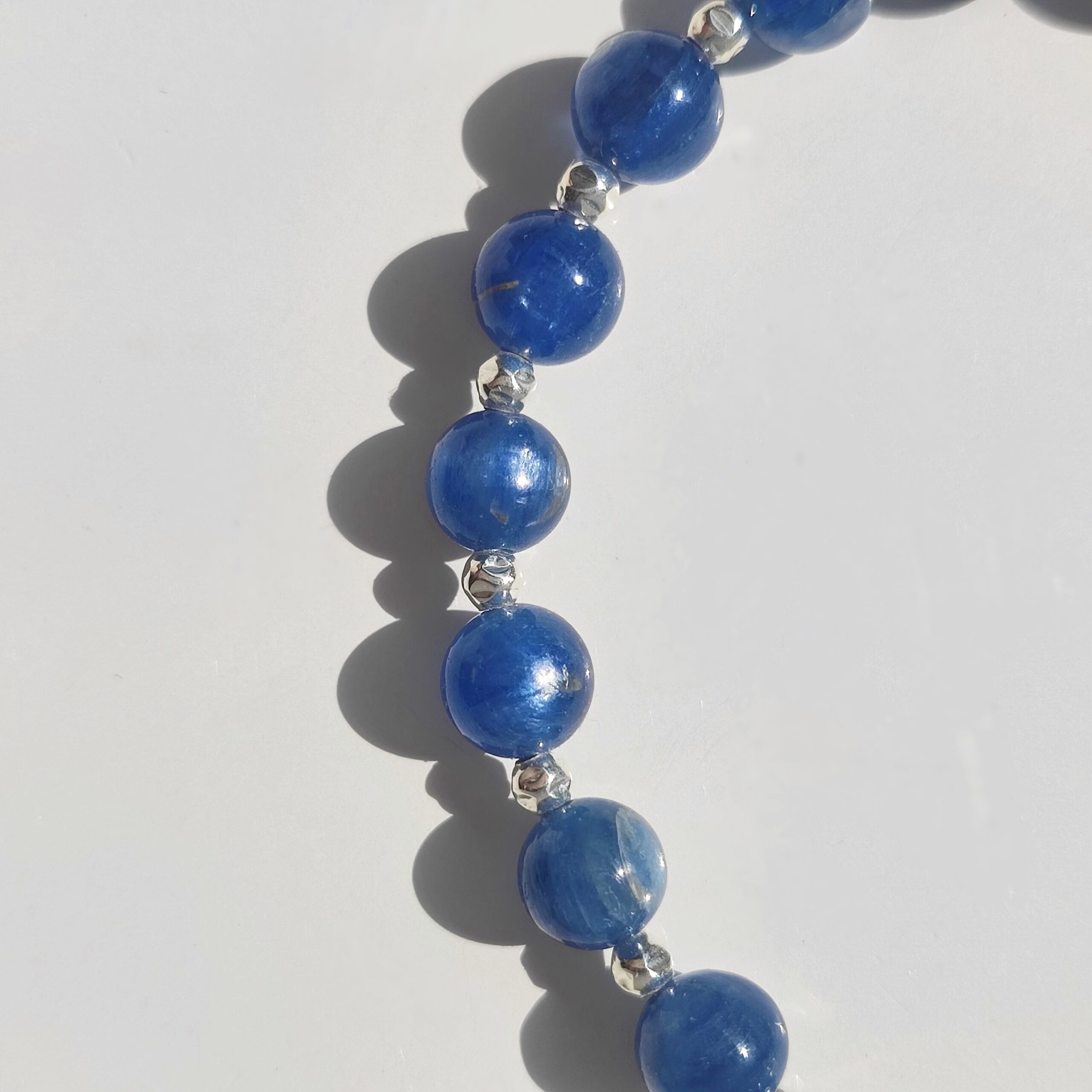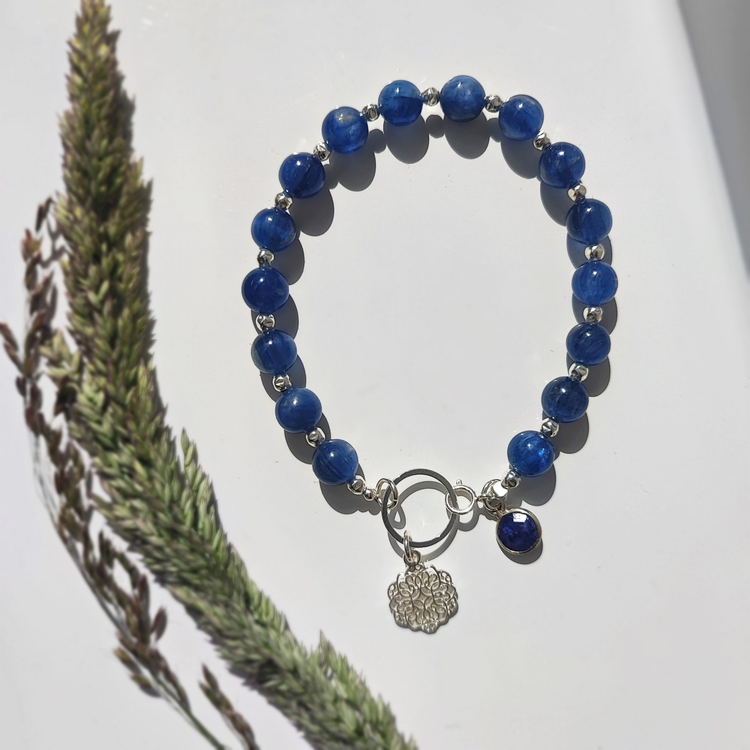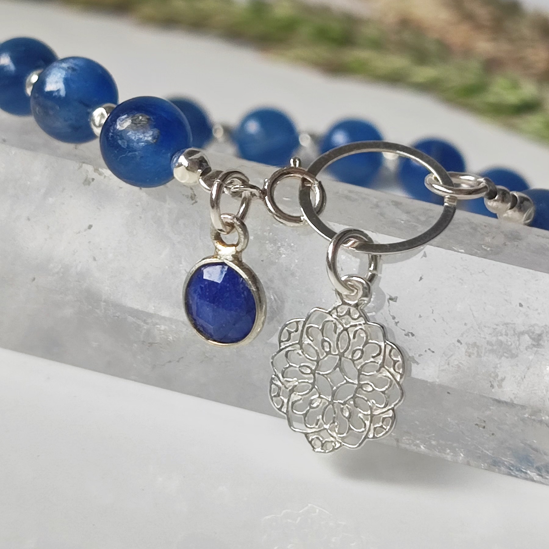 Wunderbares, einzigartiges Armband, handgefertigt aus natürlichem Kyanit mit einer tiefblauen Kobaltfärbung. Bei entsprechendem Licht zeigt der Kyanit charakteristische Schimmer. Alle Zierelemente und Verschlüsse sind aus 925er Sterlingsilber gefertigt. Das Armband ist am Verschluss mit einem Anhänger aus natürlichem Saphir und einer hübschen Mandala verziert.