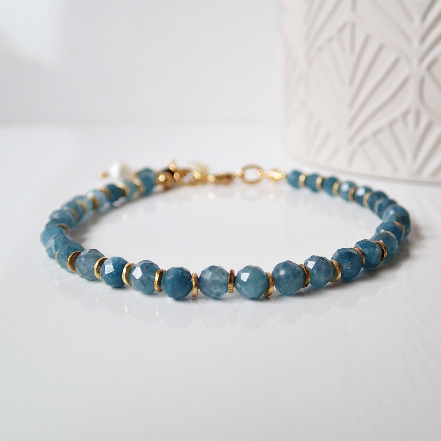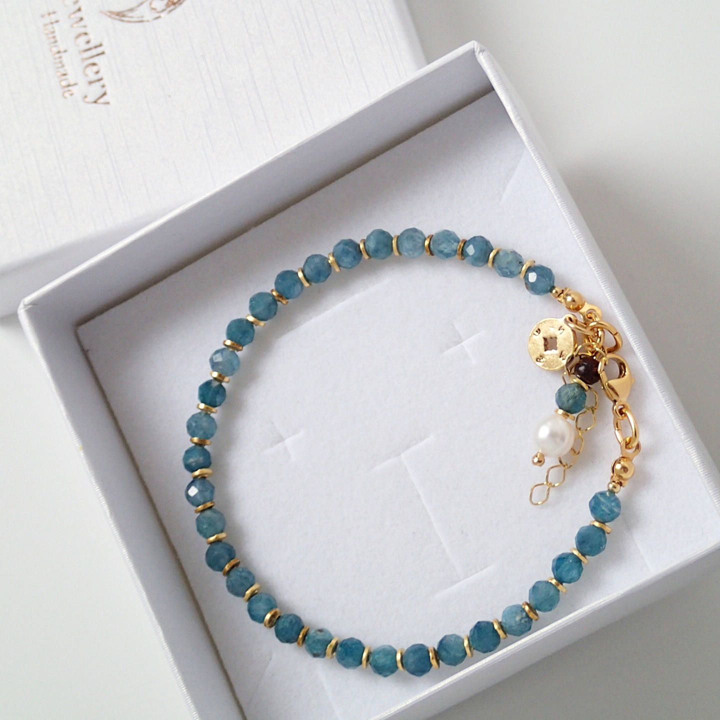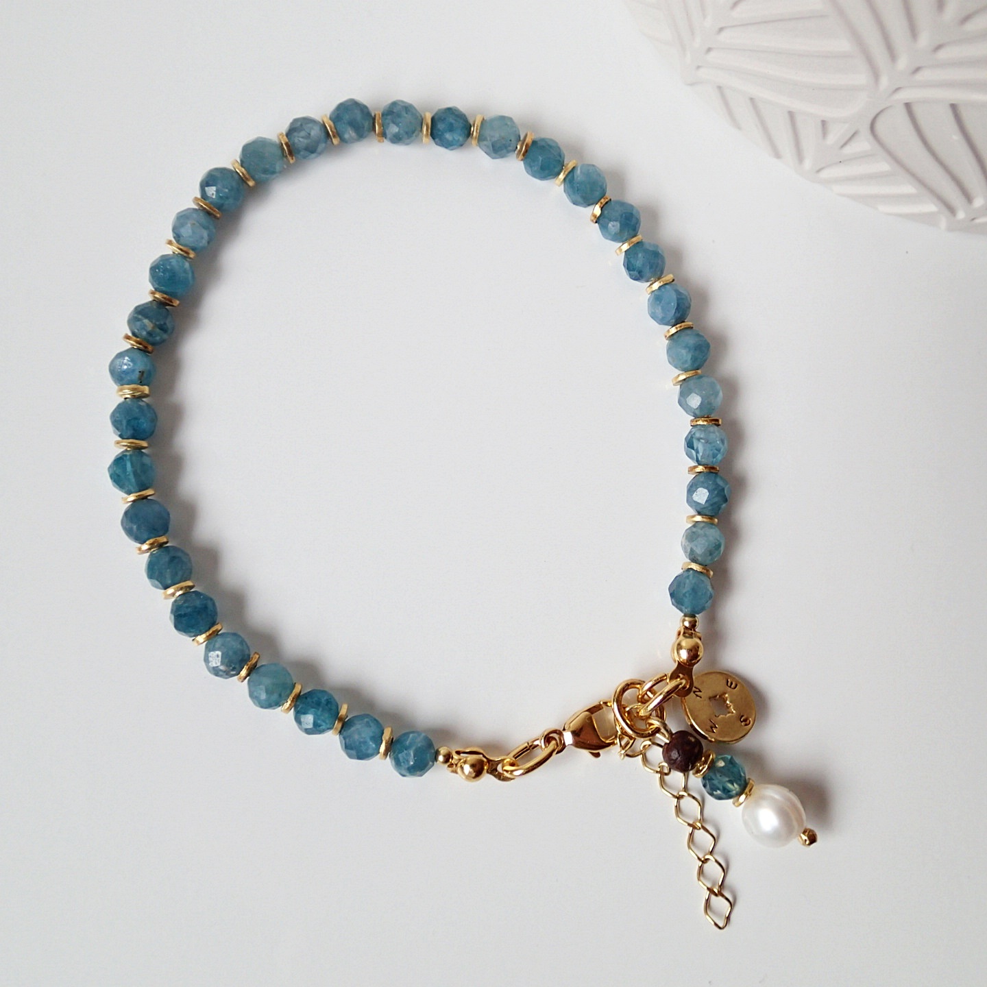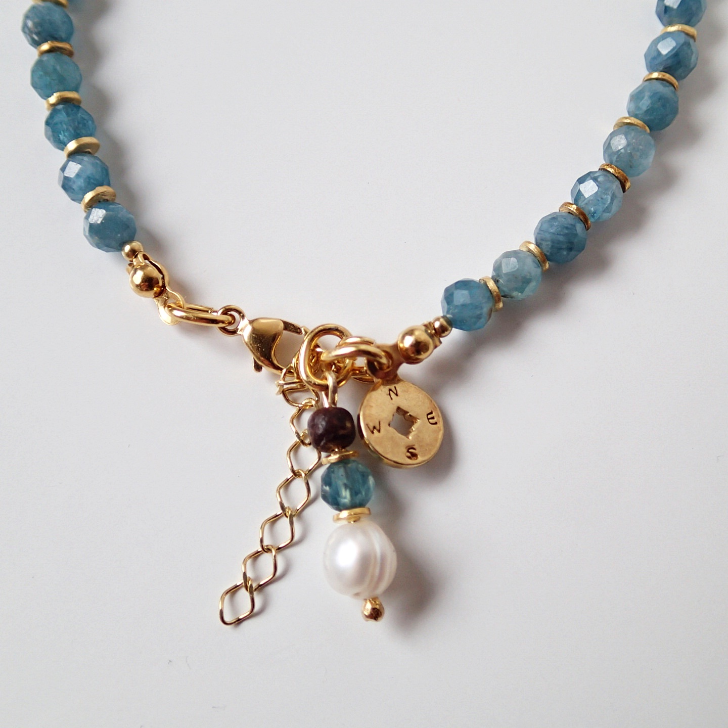 Wunderschönes, einzigartiges Armband, handgefertigt aus natürlichem Stein – Kyanit aus Madagaskar, mit wunderschönen Nuancen des karibischen Wassers. Alle dekorativen Elemente und Verschlüsse sind aus Silber (925) gefertigt und mit 24-karätigem Gold vergoldet. Das Armband ist mit einem Anhänger mit den Himmelsrichtungen und einer Kokosnuss, Kyanit und einer Süßwasserperle verziert.