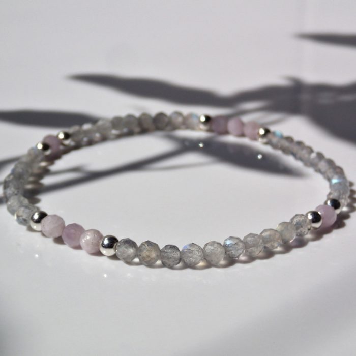 Handgefertigtes Armband aus hochwertigem Labradorit und Kunzit. Es ist mit silbernen (925) Kugeln verziert.