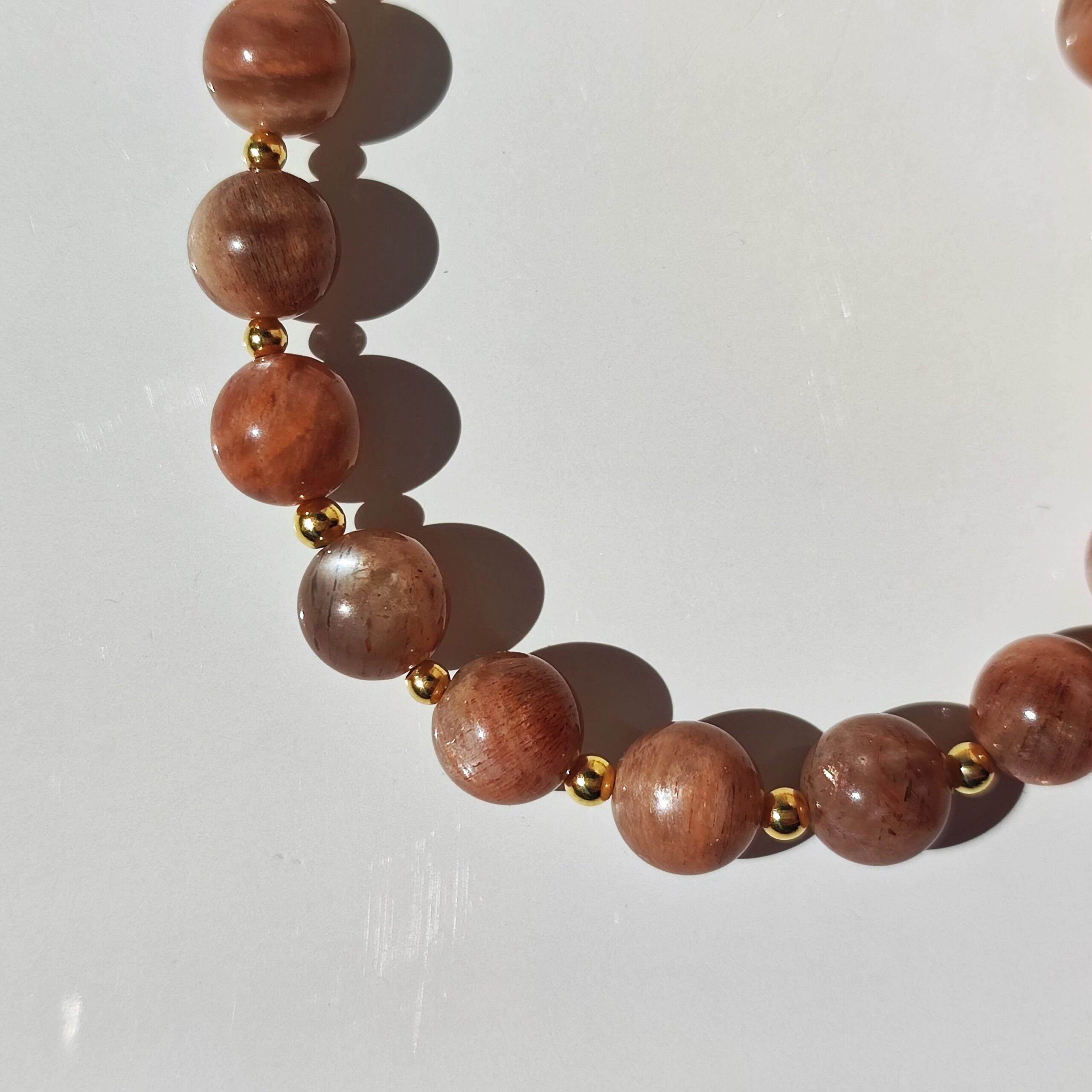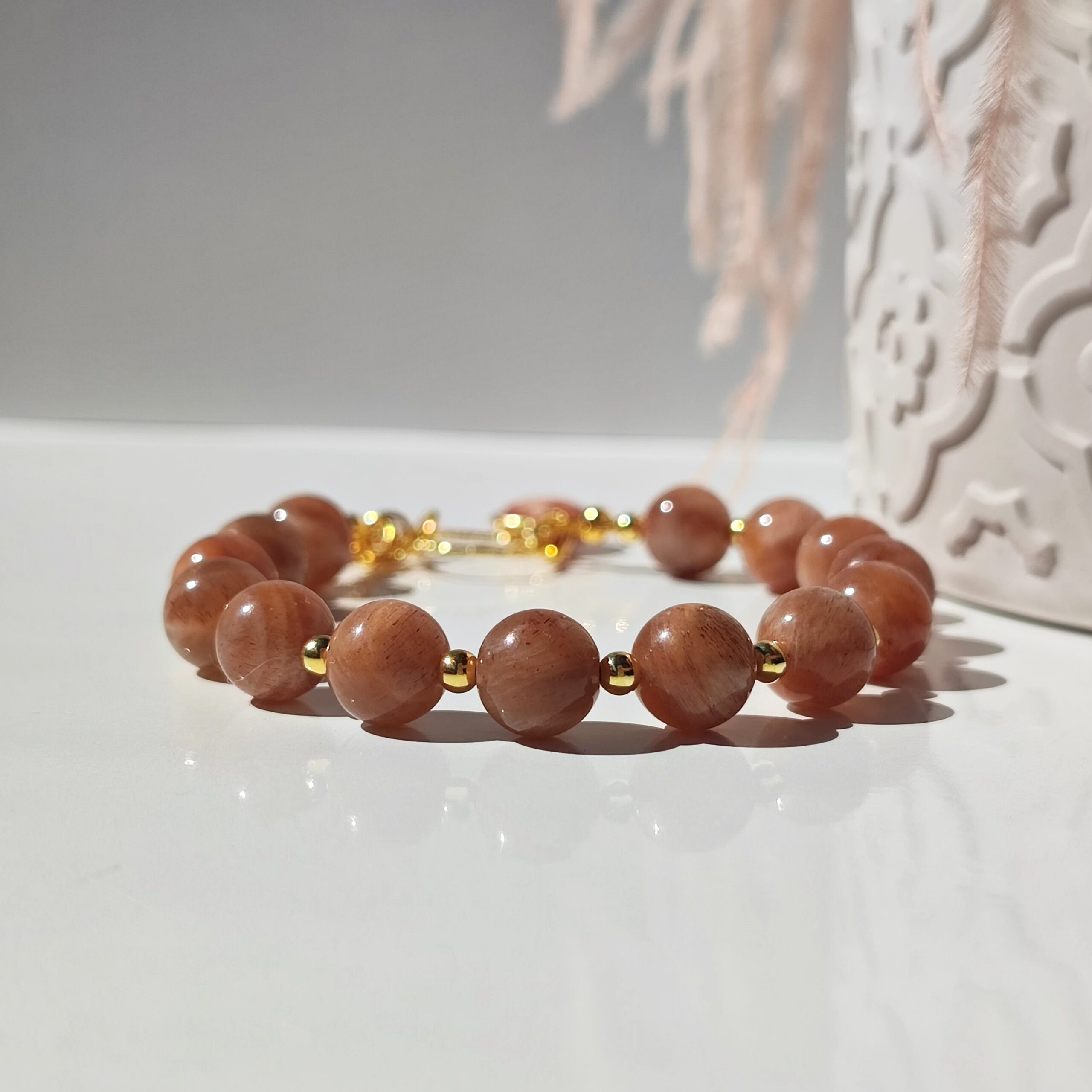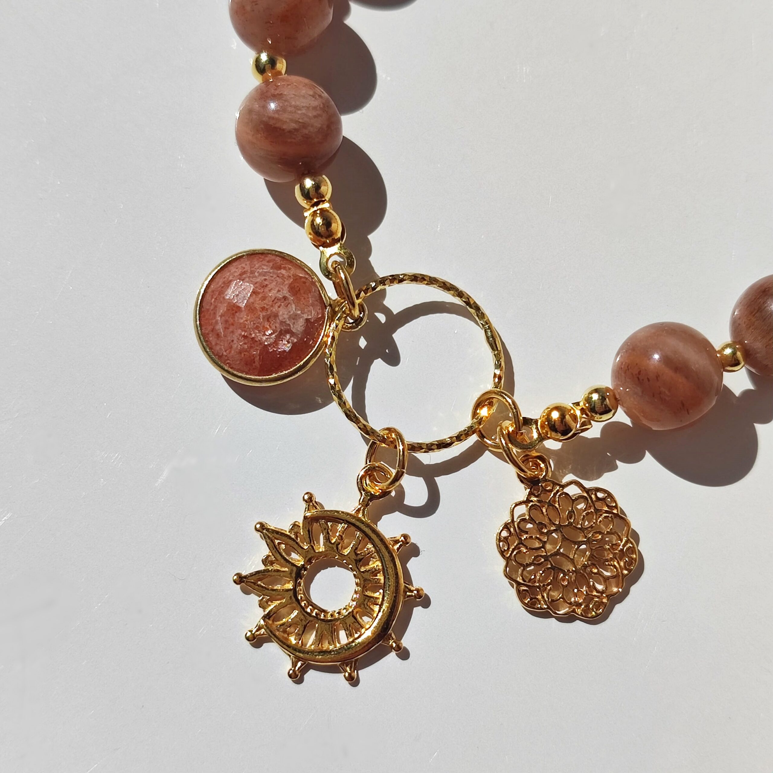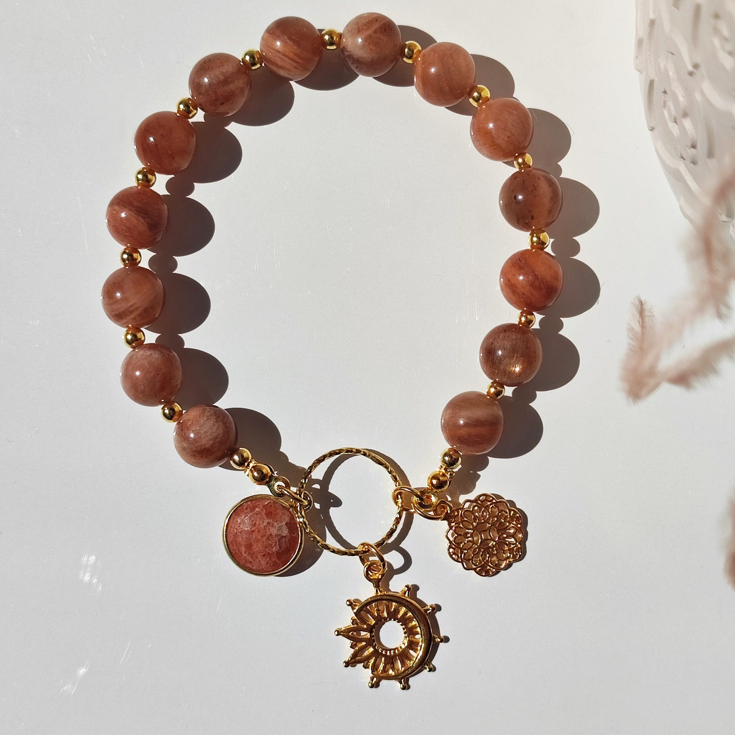 Handgefertigtes Armband aus natürlichem Sonnenstein, verziert mit drei Anhängern am Verschluss, darunter ein Anhänger mit einem funkelnden Sonnenstein. Alle Verschluss- und Zierelemente sind aus 925er Silber, vergoldet mit zwei Mikronen 24-karätigem Gold. Der Sonnenstein ist von hoher Qualität, mit einem schönen beige-orangen Farbton, der im Lichtschimmert und glitzert.
