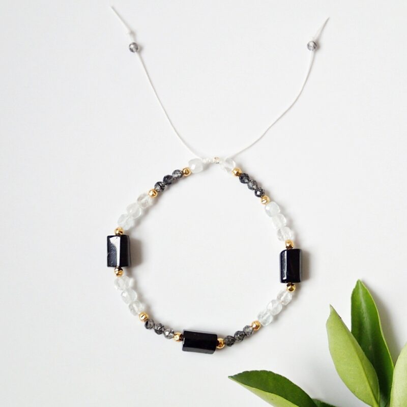 Handgemachtes Armband mit natürlichen, sanften grauen Diamanten und silbernen (925) Elementen an einer Seidenschmuckschnur.