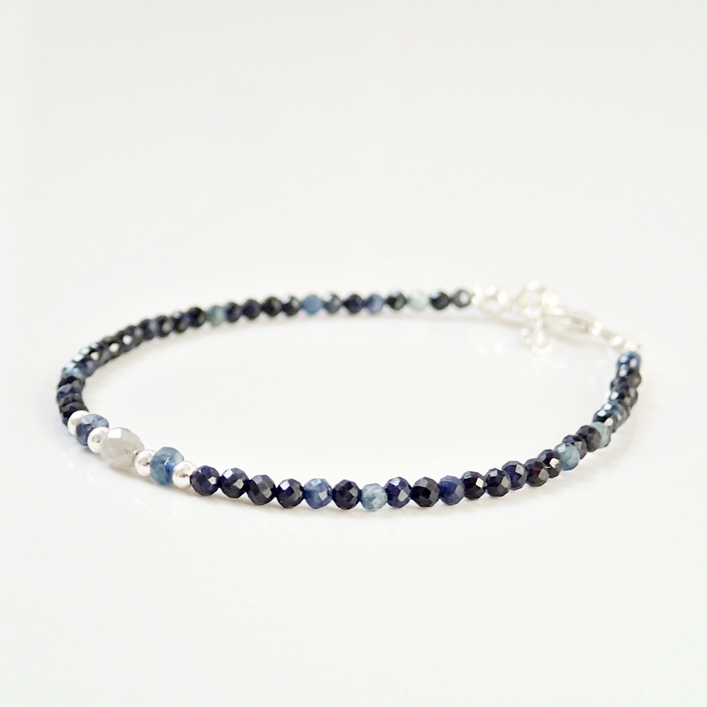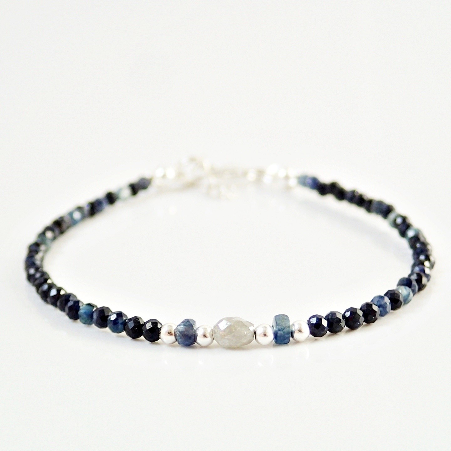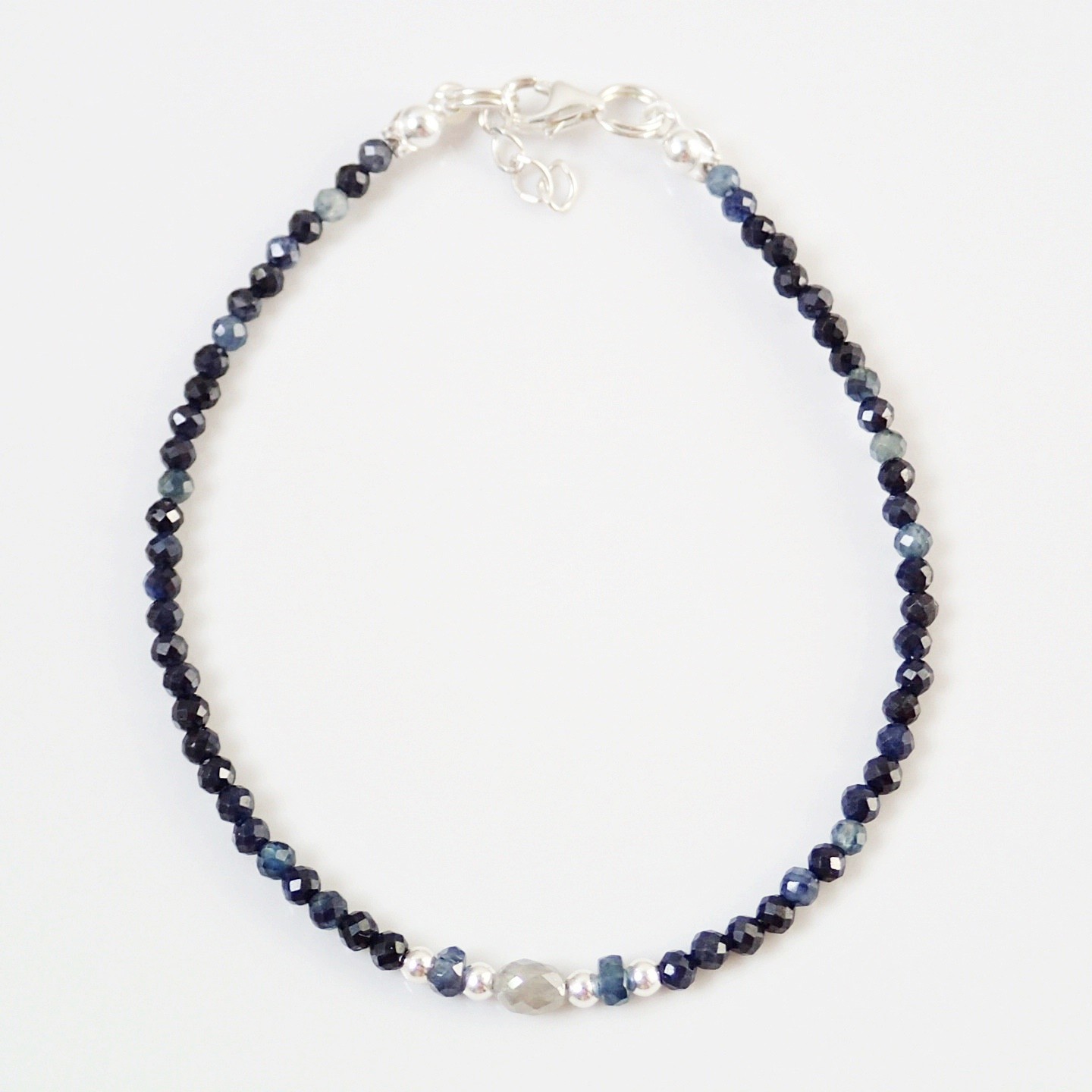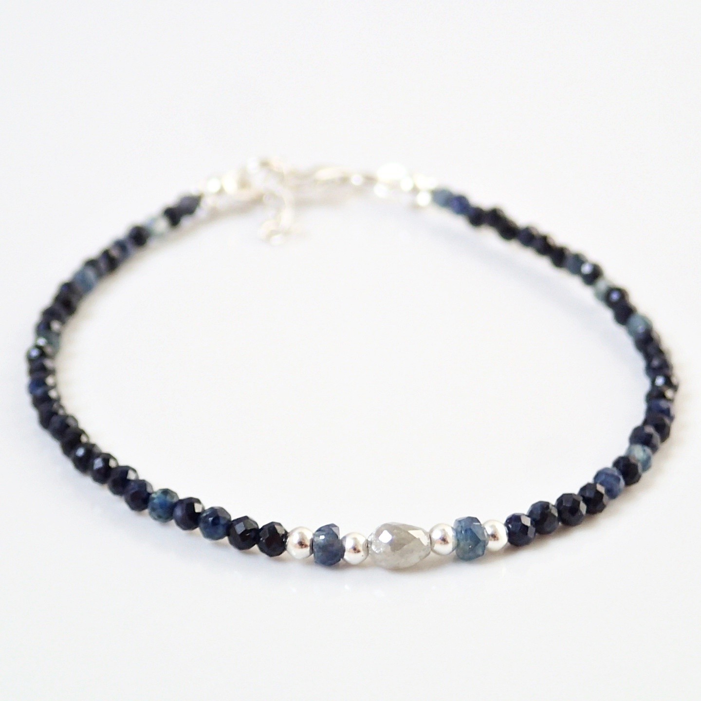 Handgefertigtes, einzigartiges Armband aus natürlichen Edelsteinen: Saphir und grauer Diamant. Alle anderen Elemente und die Schließe sind aus Silber (925). Sie können auch eine silberne Version wählen, vergoldet mit 24 Karat Gold.