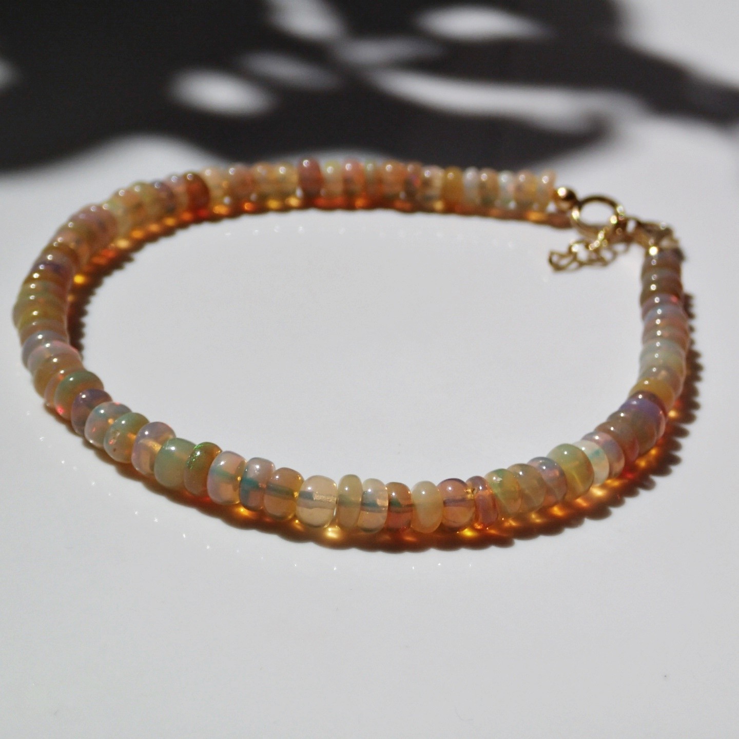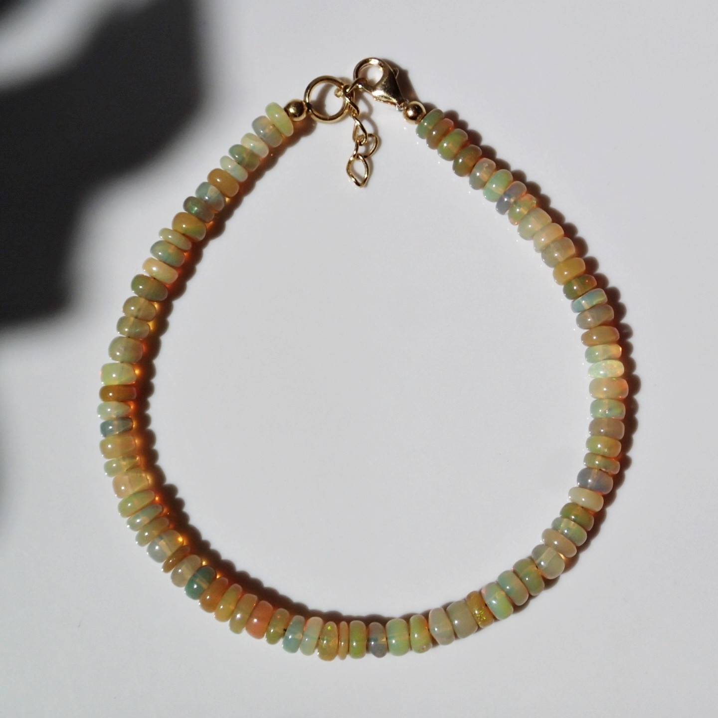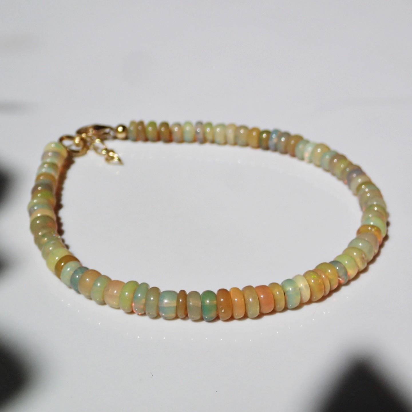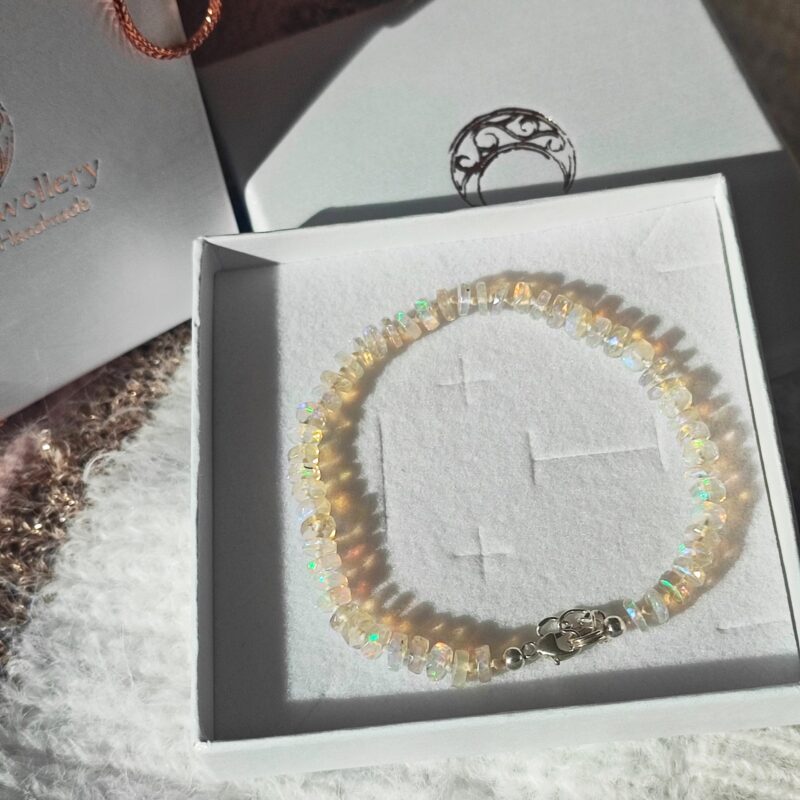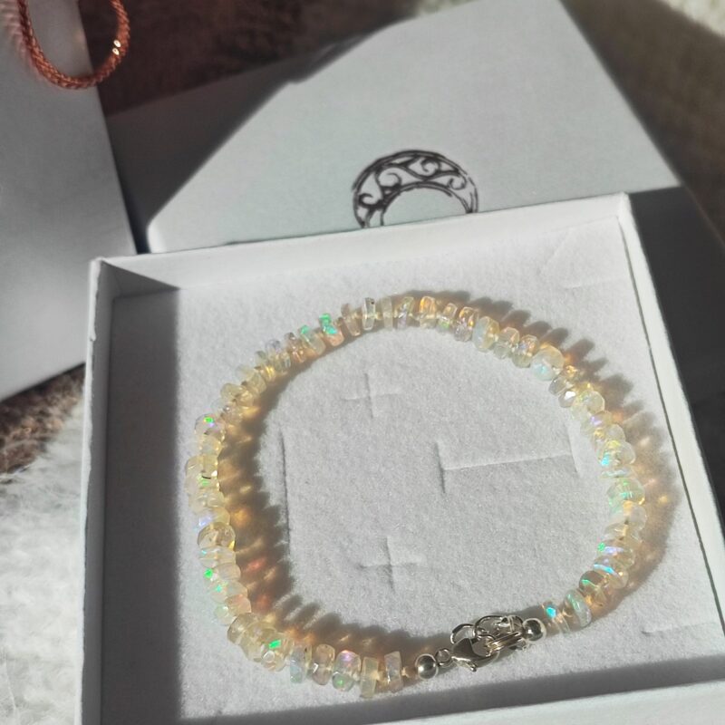 Handgefertigtes Armband aus äthiopischem Opal Welo mit erdigen Farben, einige der Steine zeichnen sich durch mehrfarbige (hauptsächlich grüne) Glitzer aus. Verschlusselemente sind komplett aus hochwertigstem Silber gefertigt.