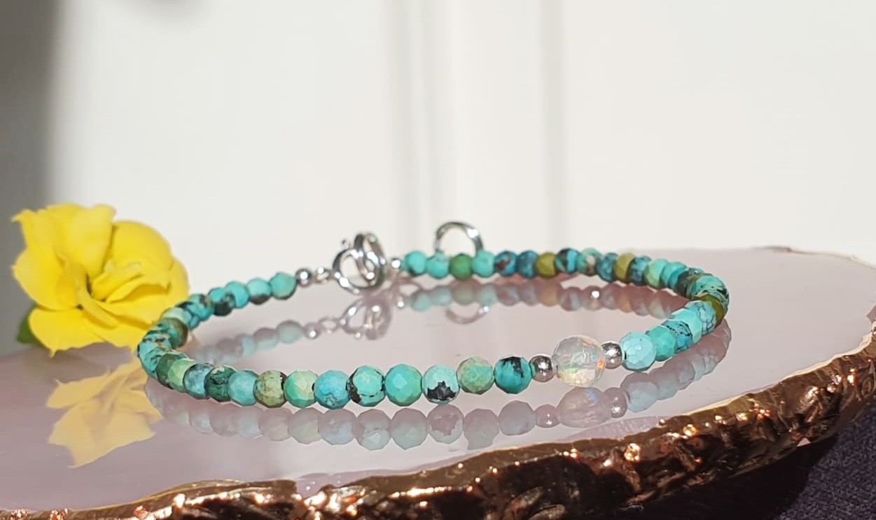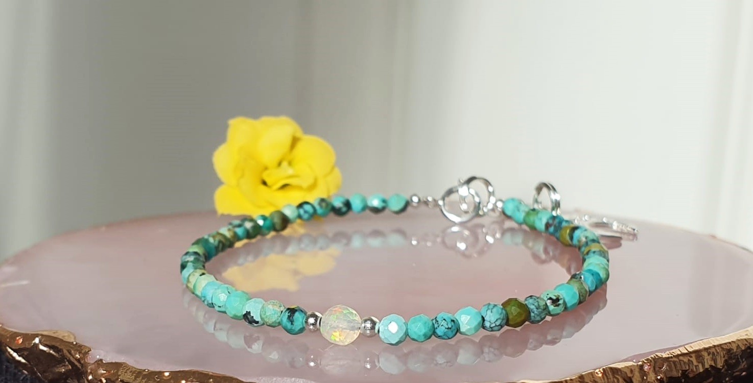 Phänomenales Armband handgefertigt aus natürlichen, edlen, funkelnden Opal und afrikanischem Türkis und Silberelementen (925). Das Ende des Armbands ist mit unserem silbernen Lunula verziert.