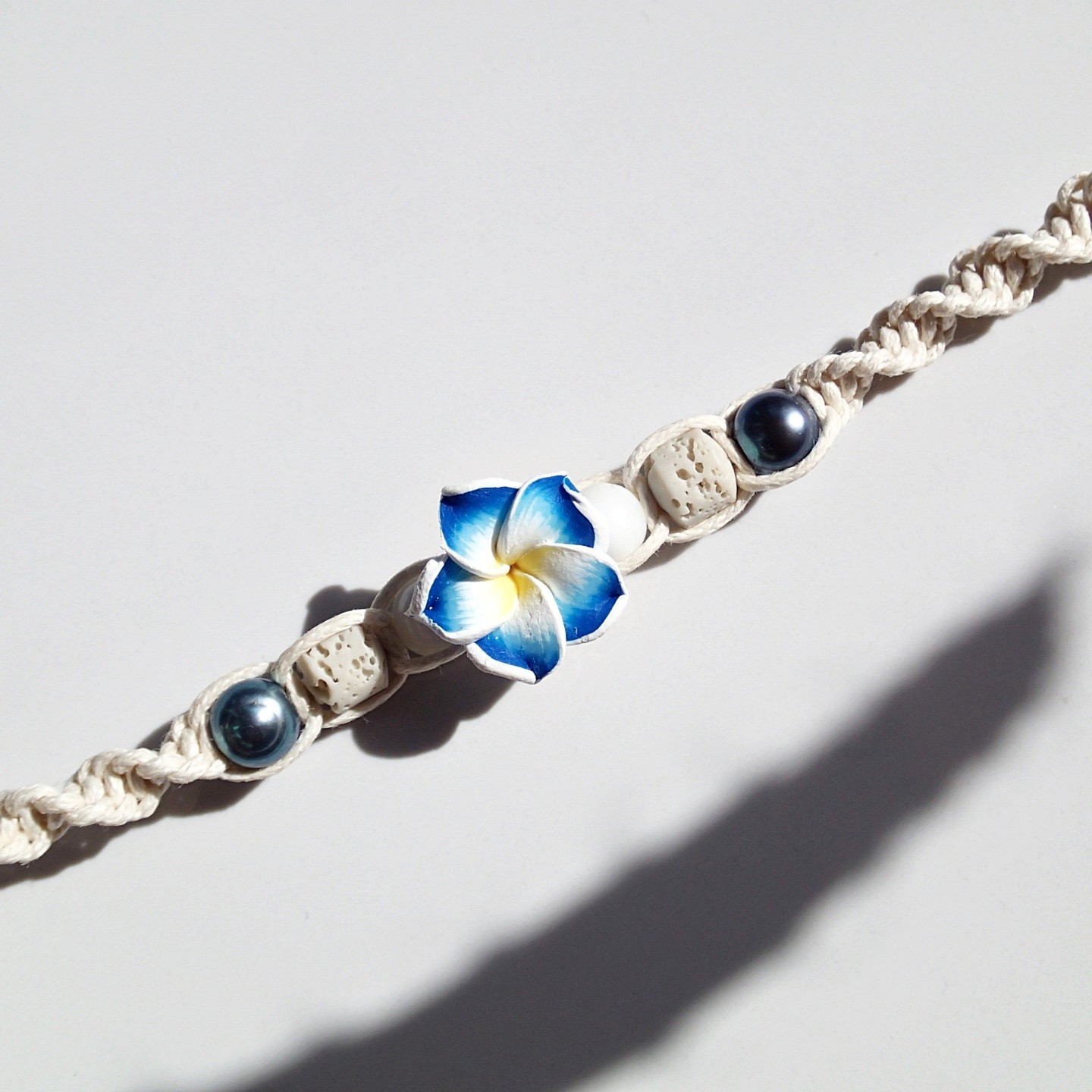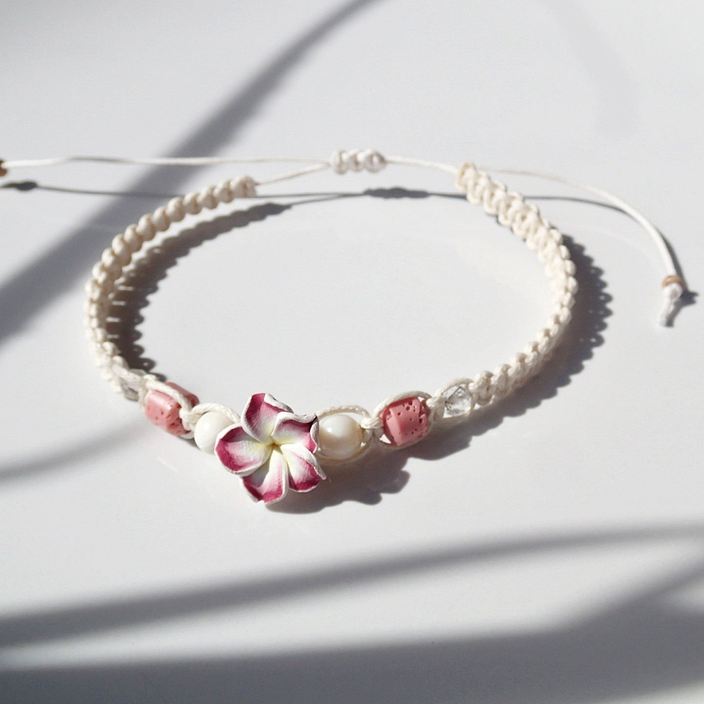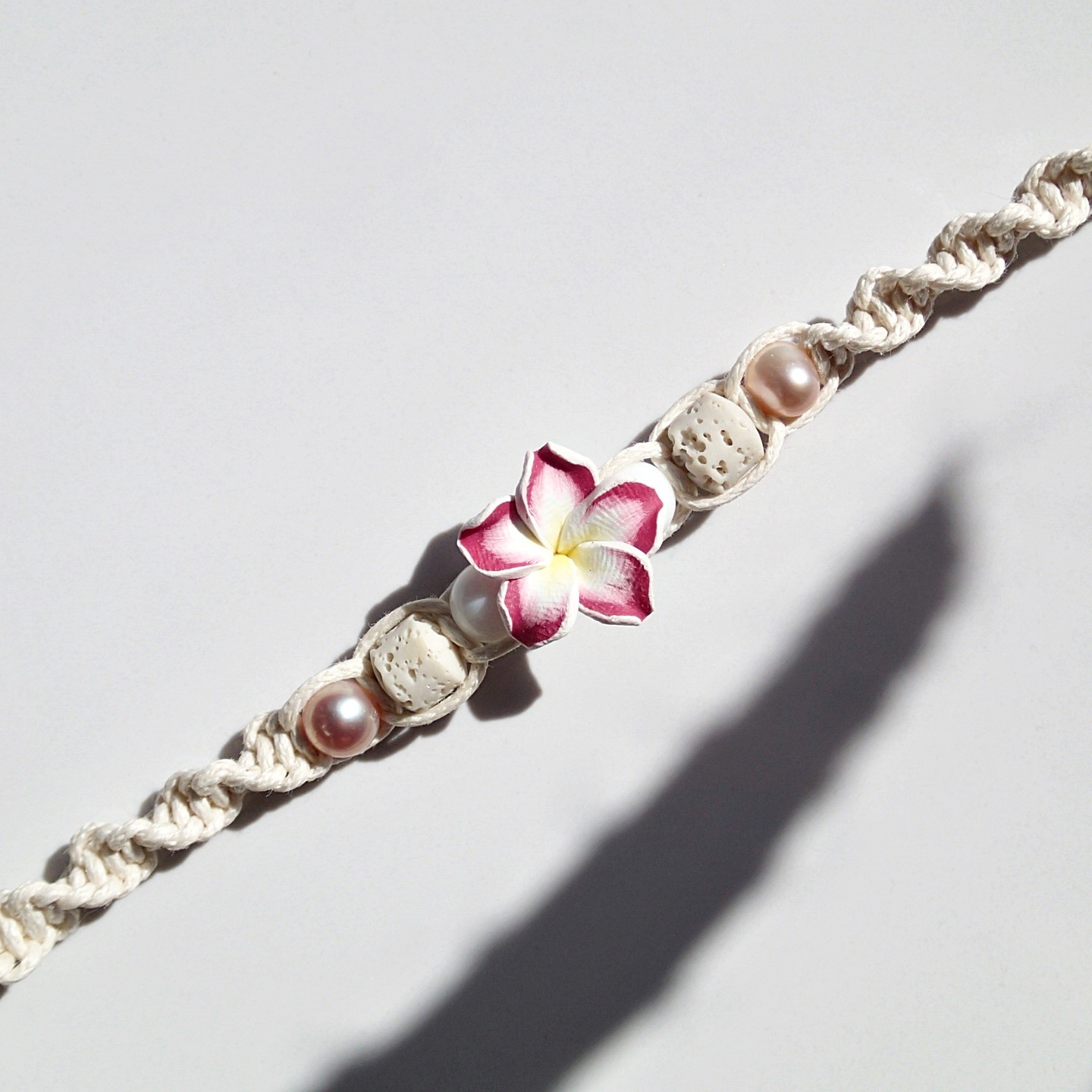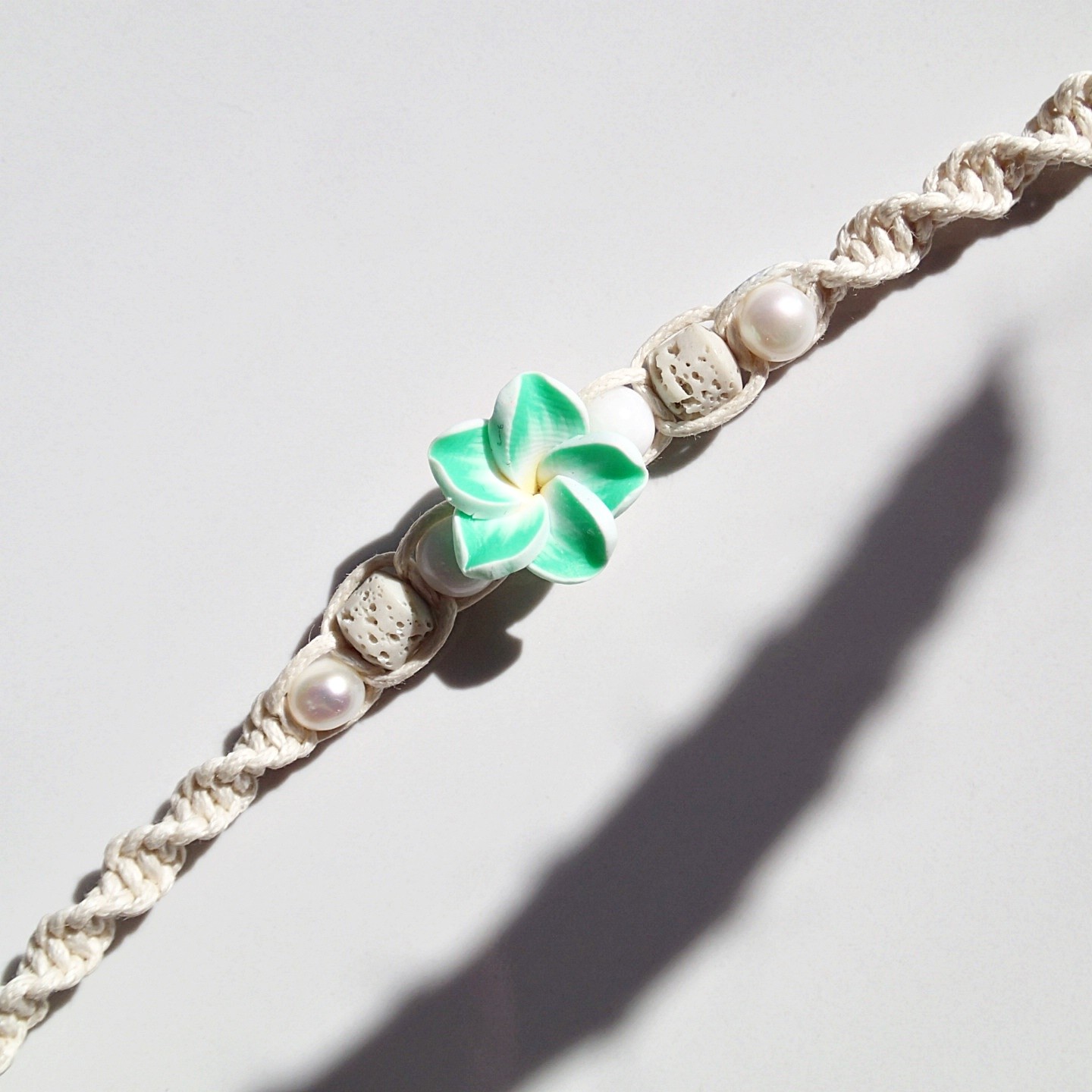 Handgefertigtes Fußband an einer Baumwollschnur.