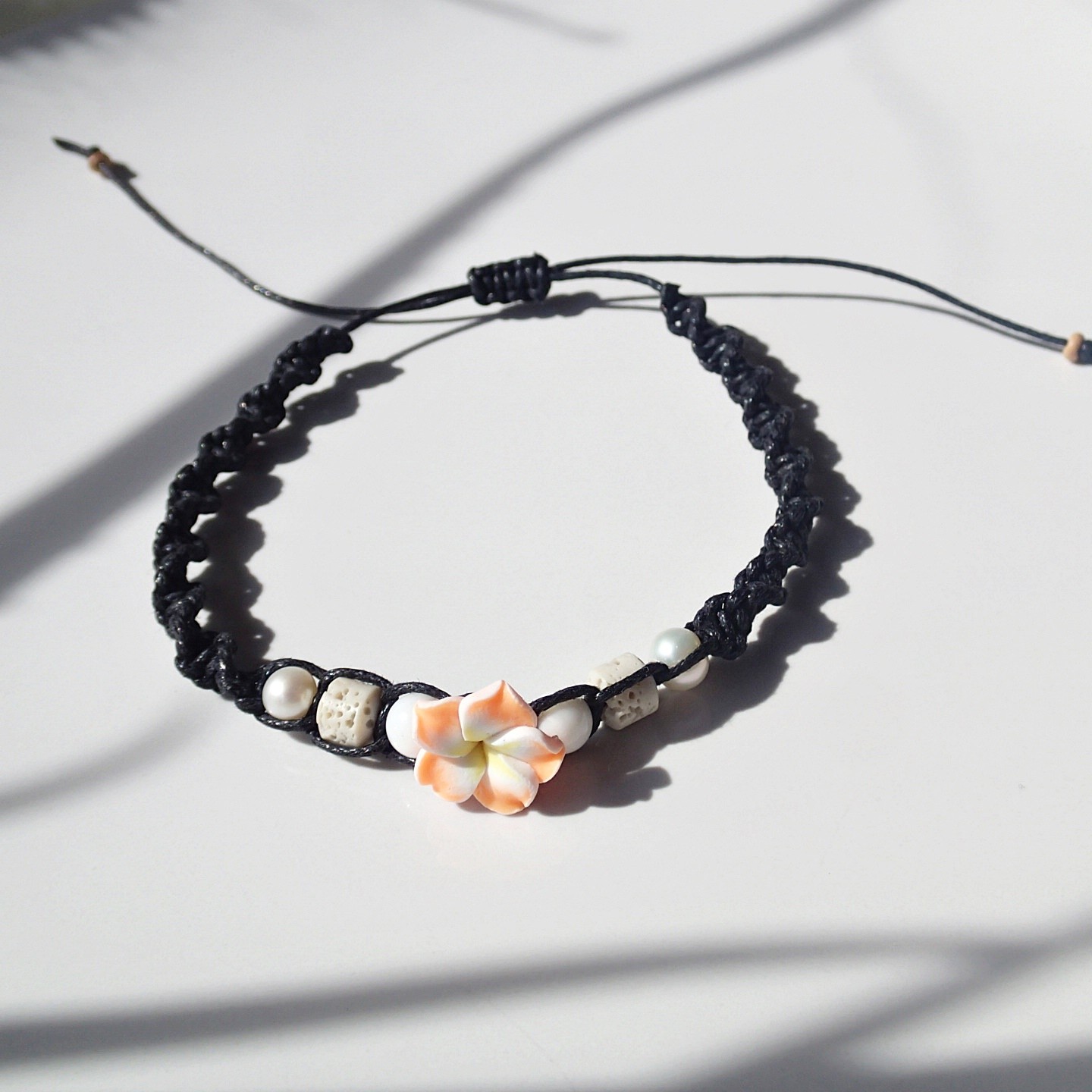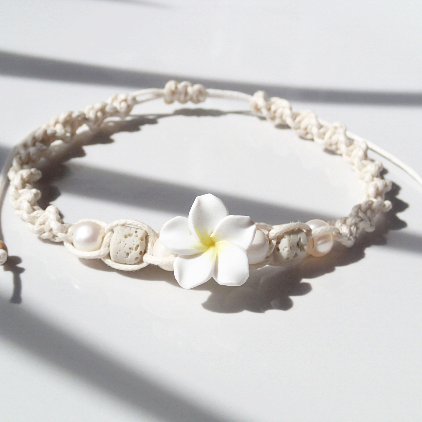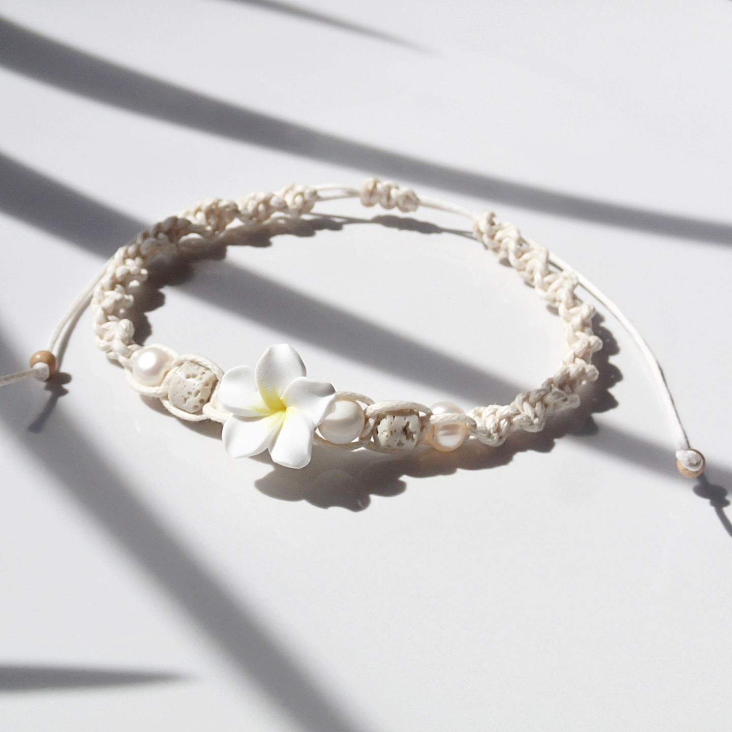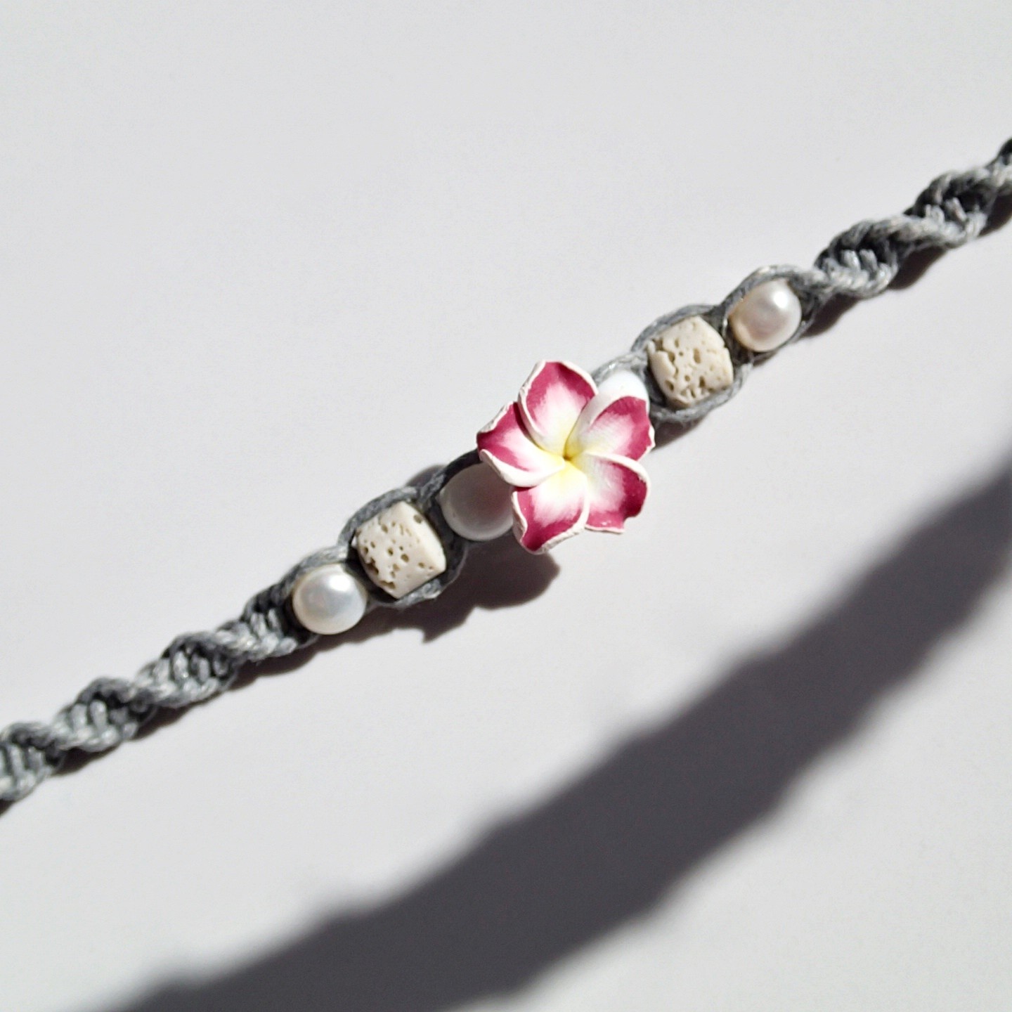 Handgefertigtes Fußband an einer Baumwollschnur.