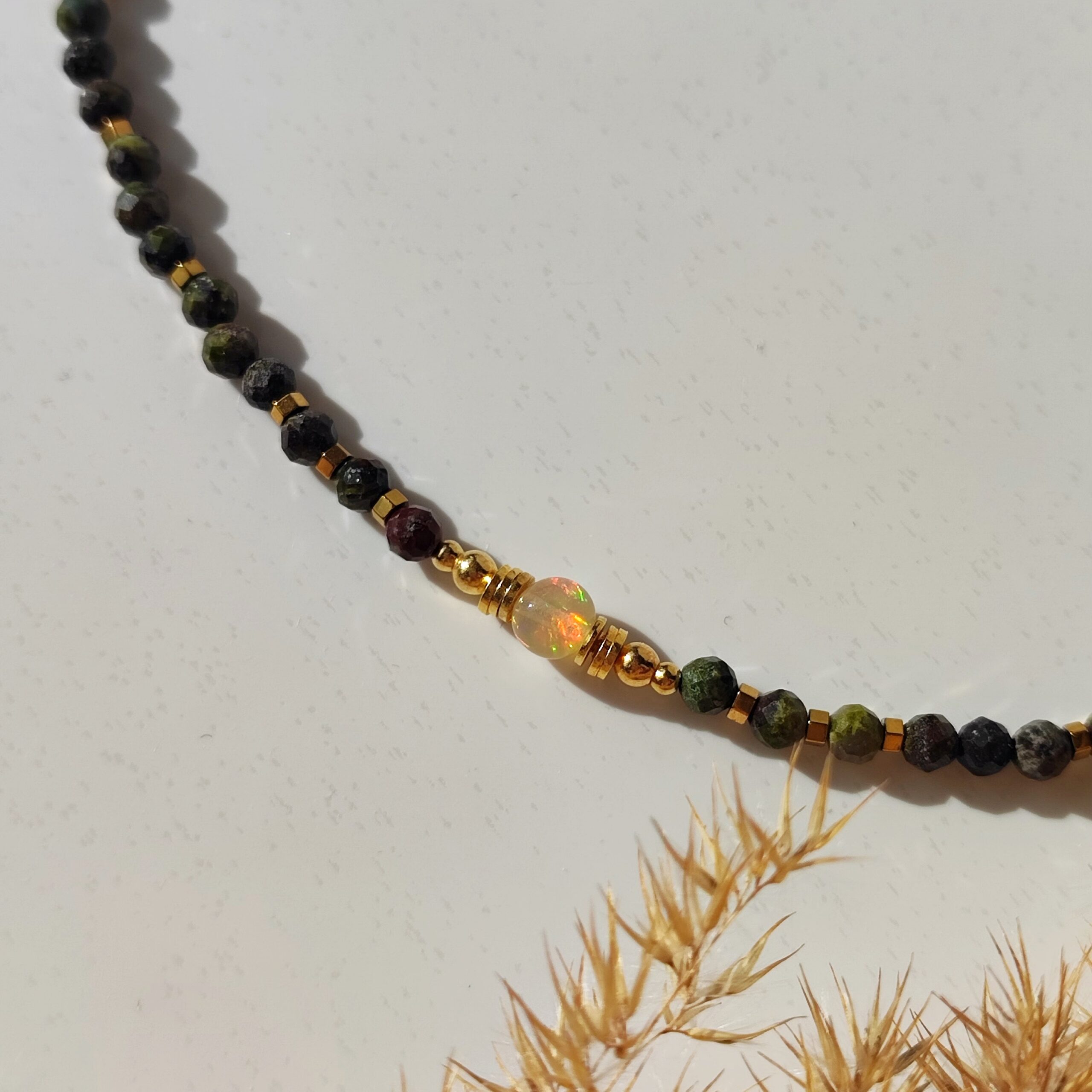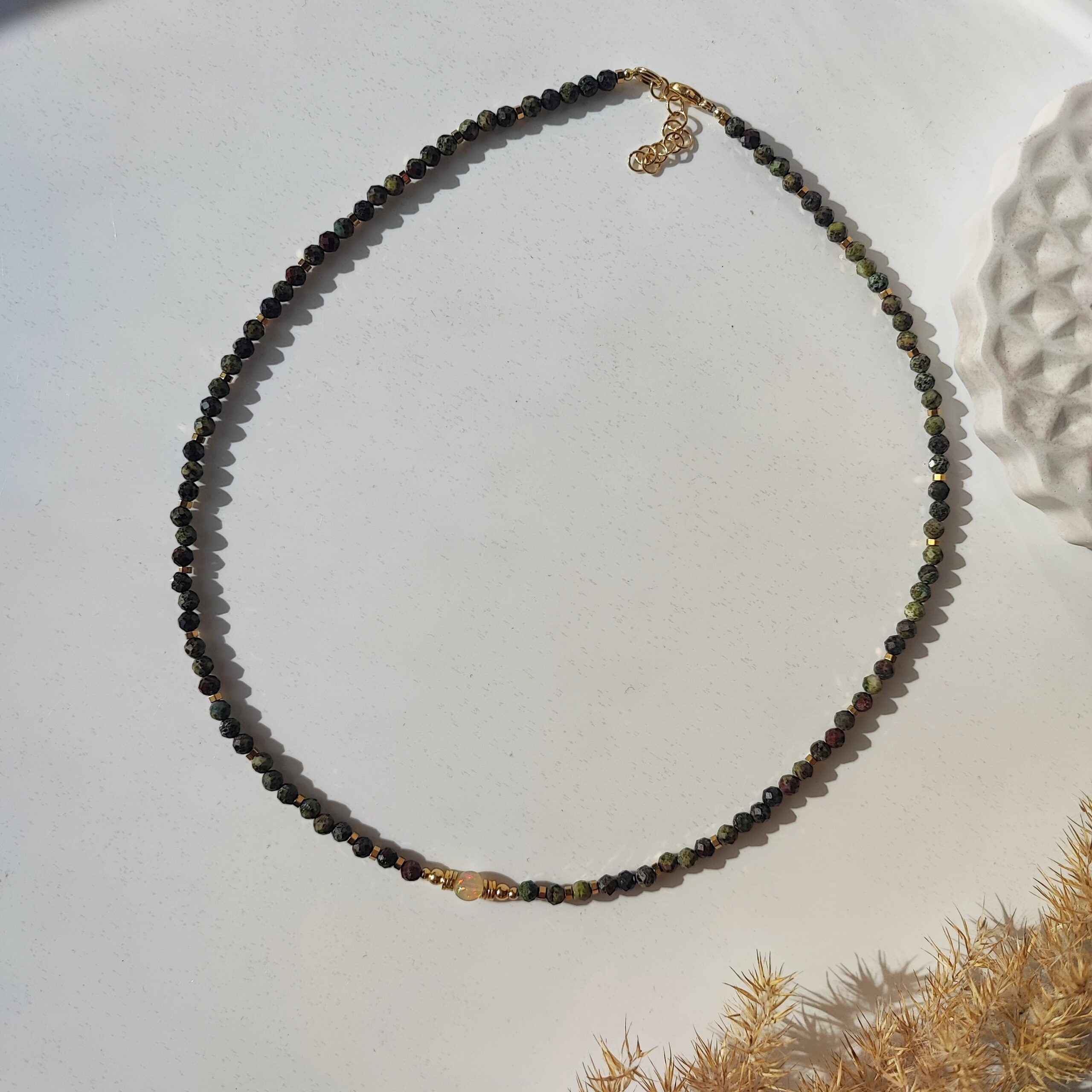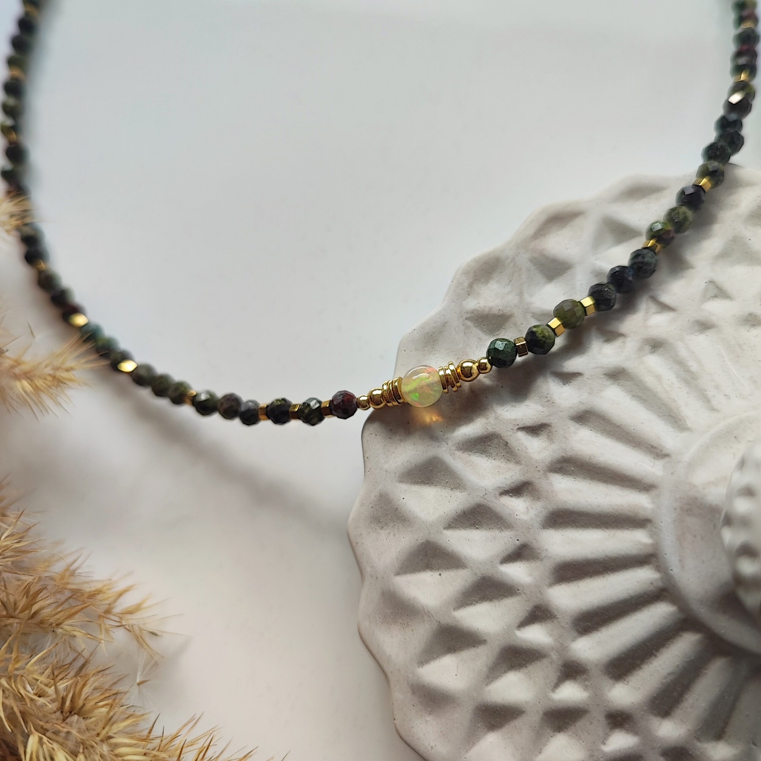Handgefertigte Halskette aus natürlichen Steinen: Drachenblut-Jaspis, funkelnder Welo-Opal in orange-grünen Farbtönen und Hämatit in goldener Farbe. Die Halskette ist mit einem Verschluss und dekorativen Elementen aus 925er Silber, vergoldet mit 24-karätigem Gold, ausgestattet.