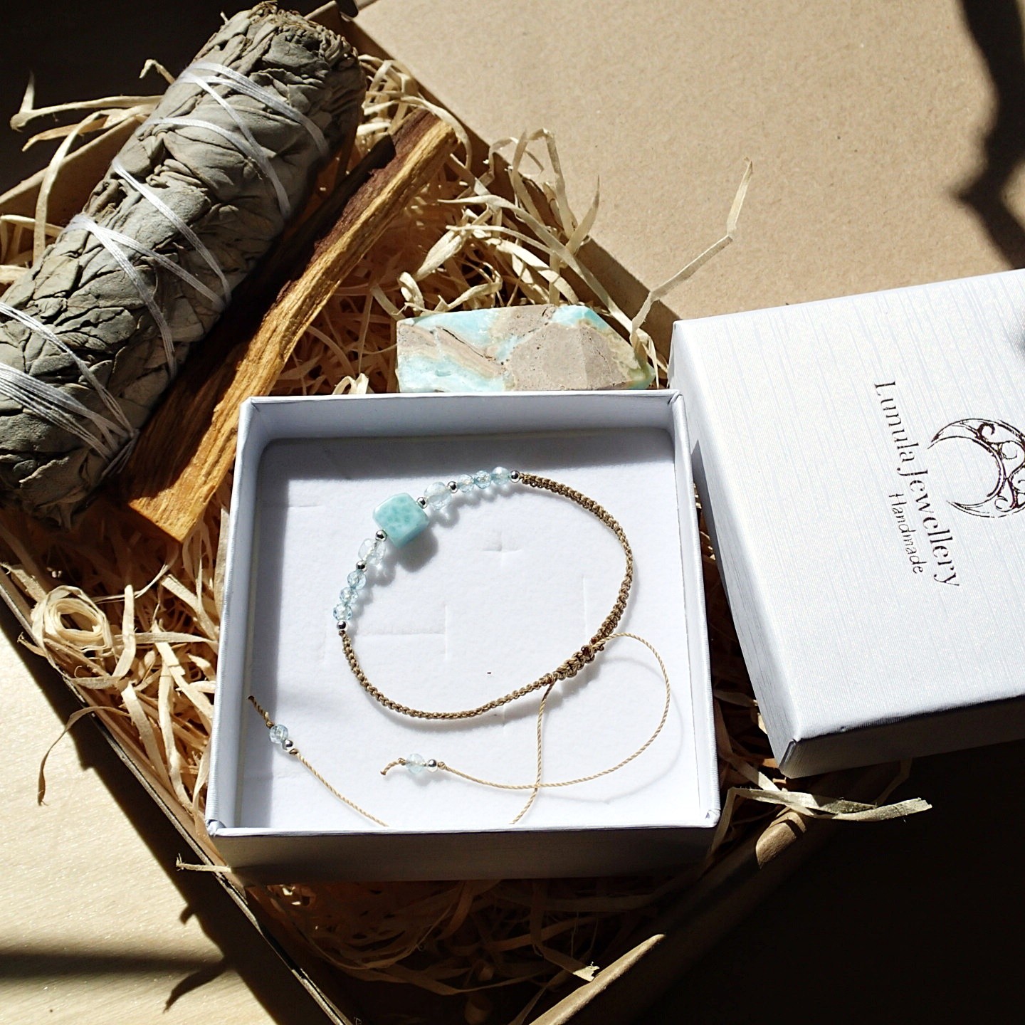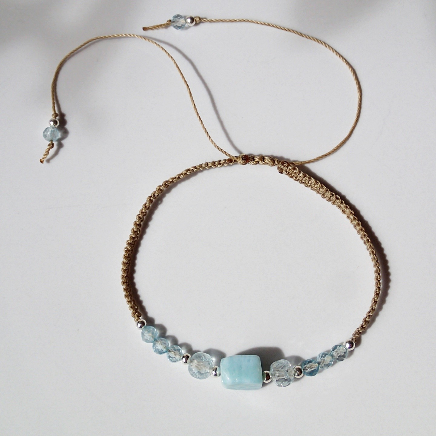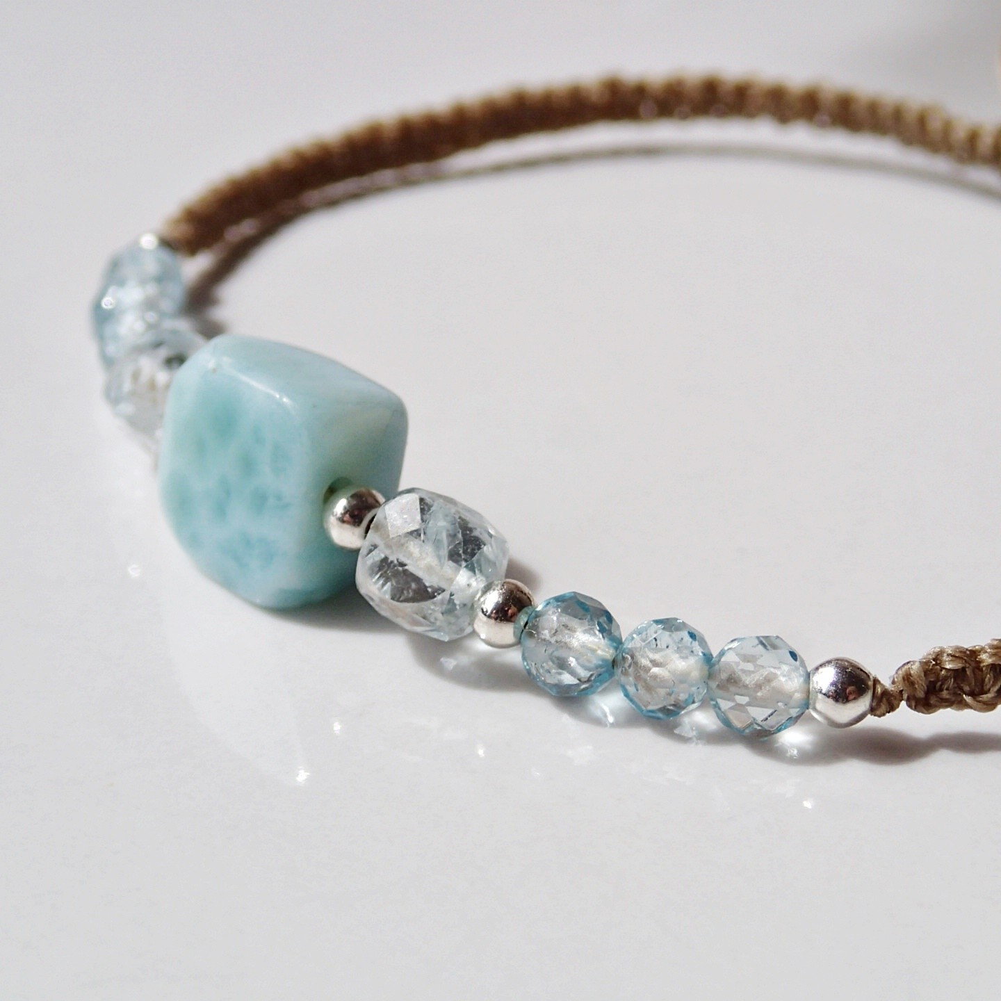 Das Armband besteht aus einer beigen, starken Schnur, einem unregelmäßigen Würfel aus karibischem Larimar, geschliffenen Würfeln und Kugeln aus blauem Topas und silbernen Kugeln.