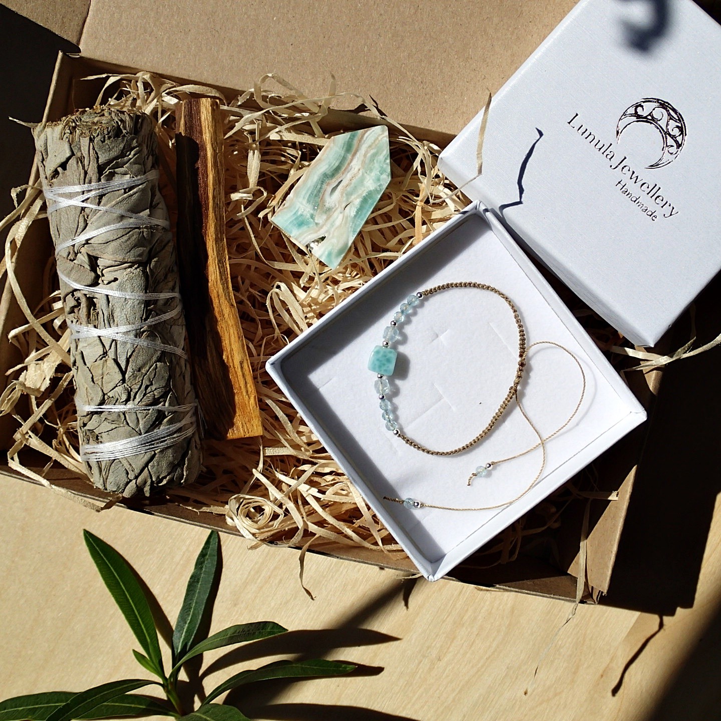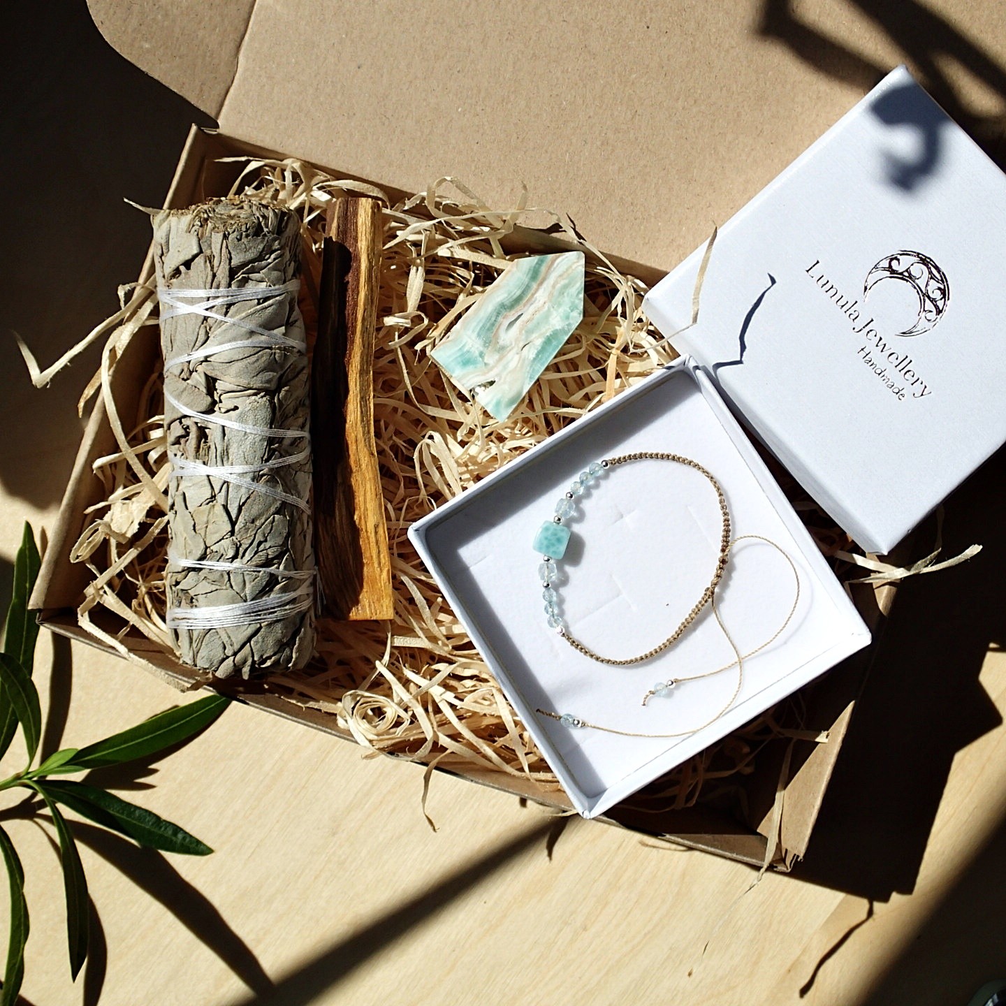 Ein Set bestehend aus einem handgefertigten Armband, einem kleinen Obelisken – karibischer Calcit und Räucherstäbchen – weißer Salbei und Palo Santo.