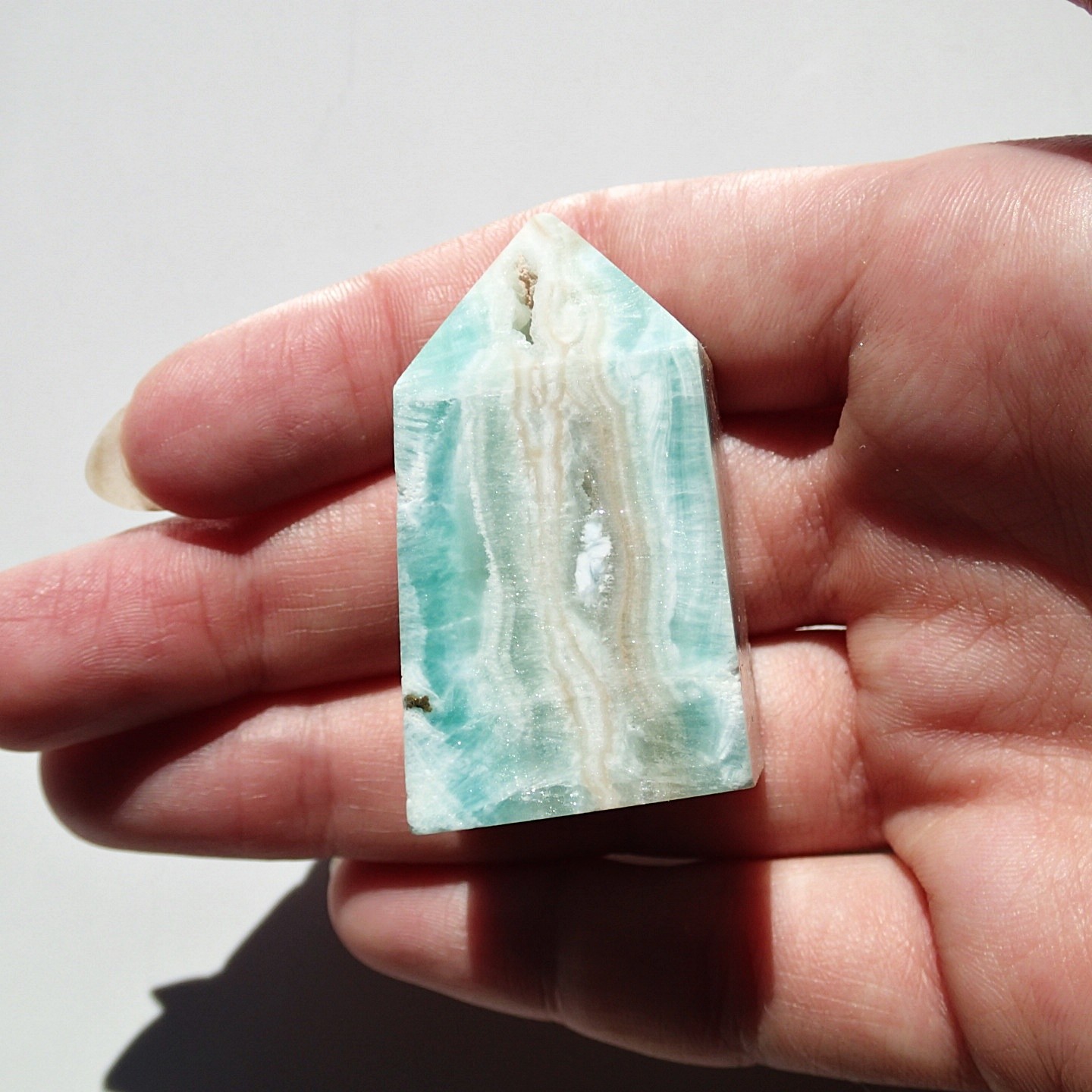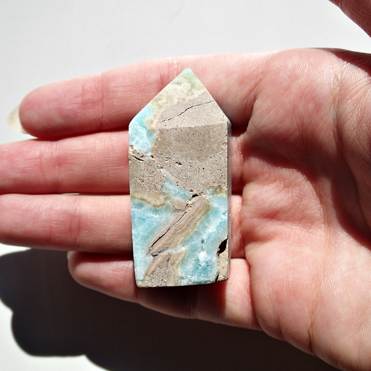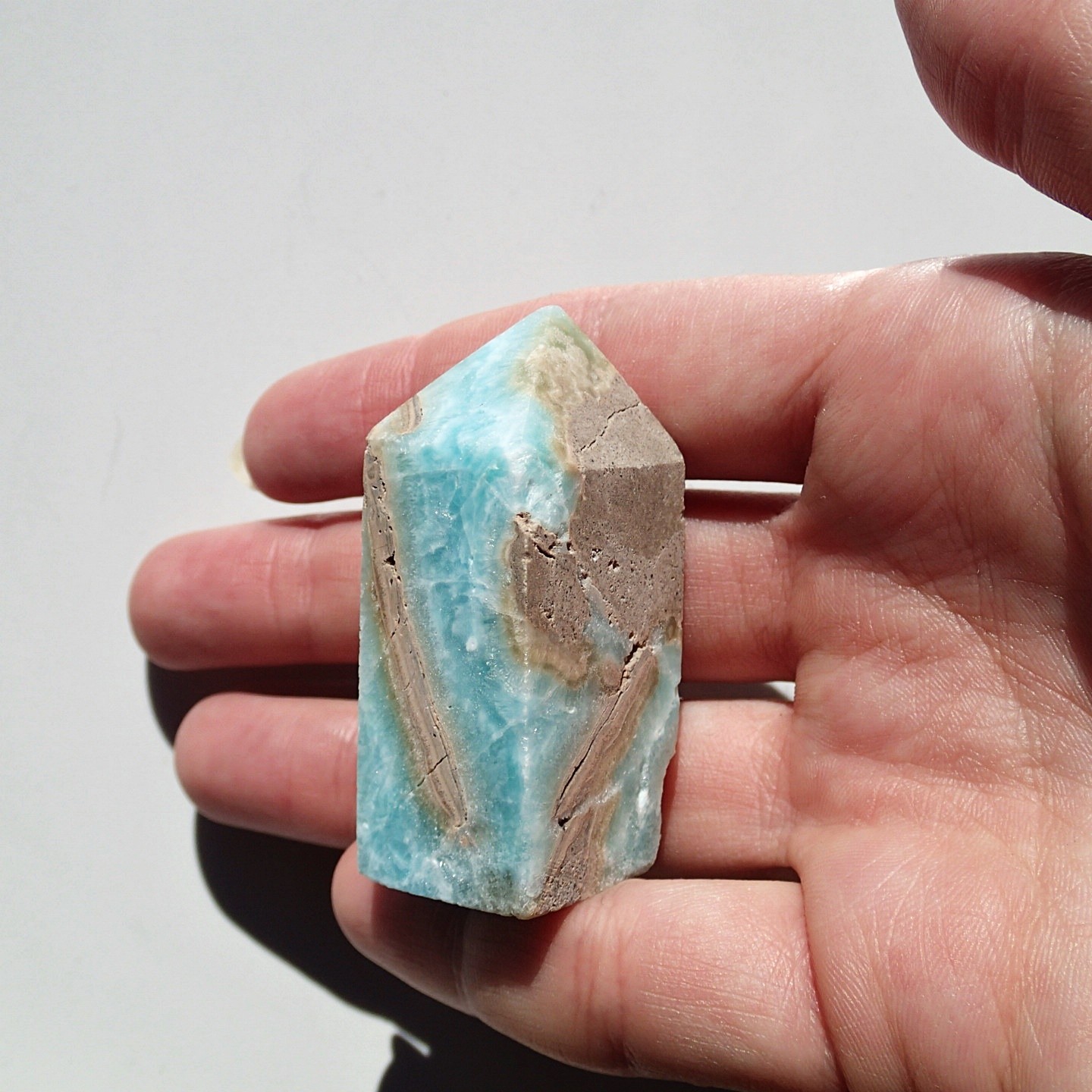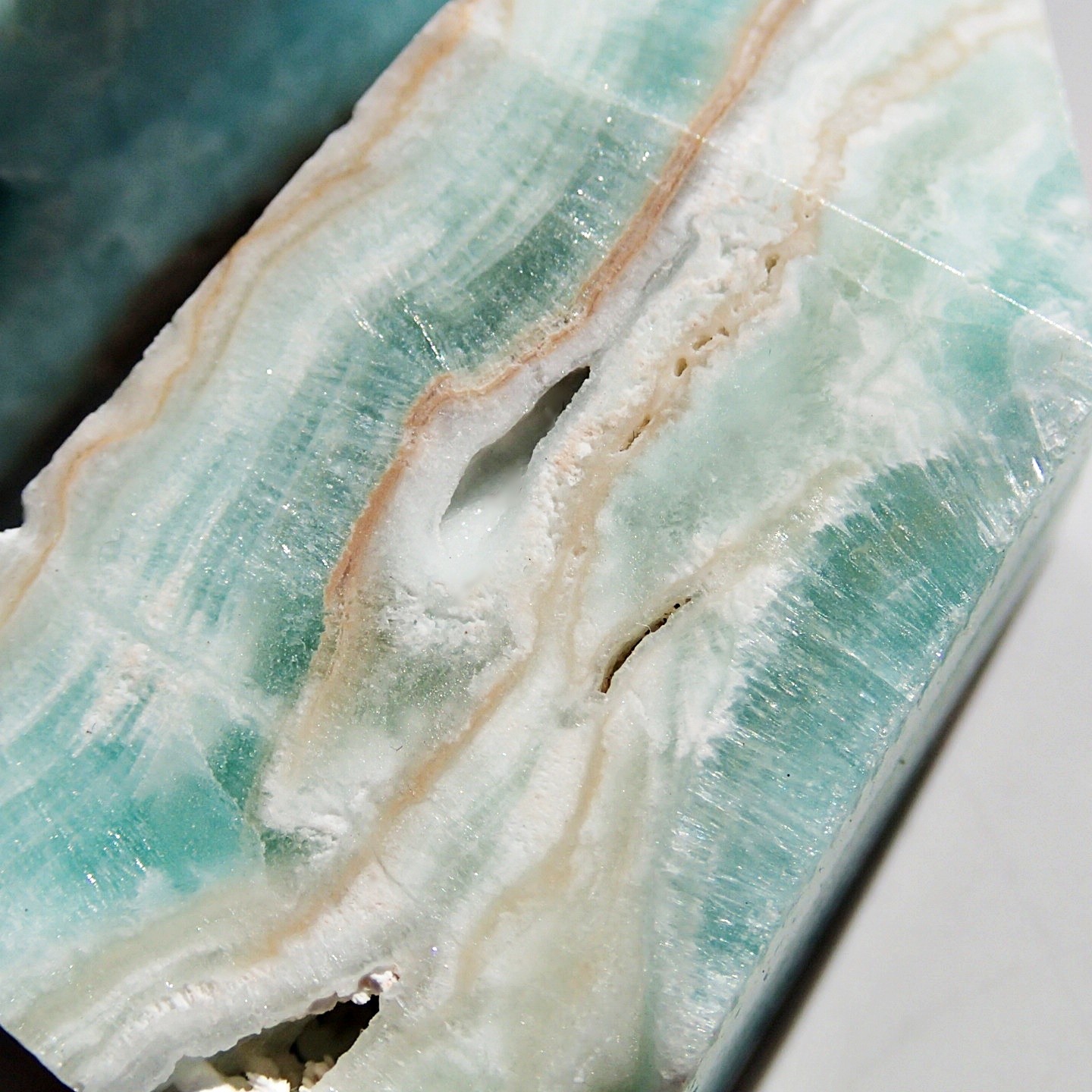 Karibischer Calcit Es ist eine Kombination aus einem sehr hellen ozeanblauen Calcit und hellbraunem und weißem Aragonit. Die Farbe des Steins sowie die winzigen Spalten und Knötchen in seiner Struktur (einige davon können sogar eine winzige, drusige Beschichtung im Inneren aufweisen) ziehen Ihre Aufmerksamkeit sofort auf sich.