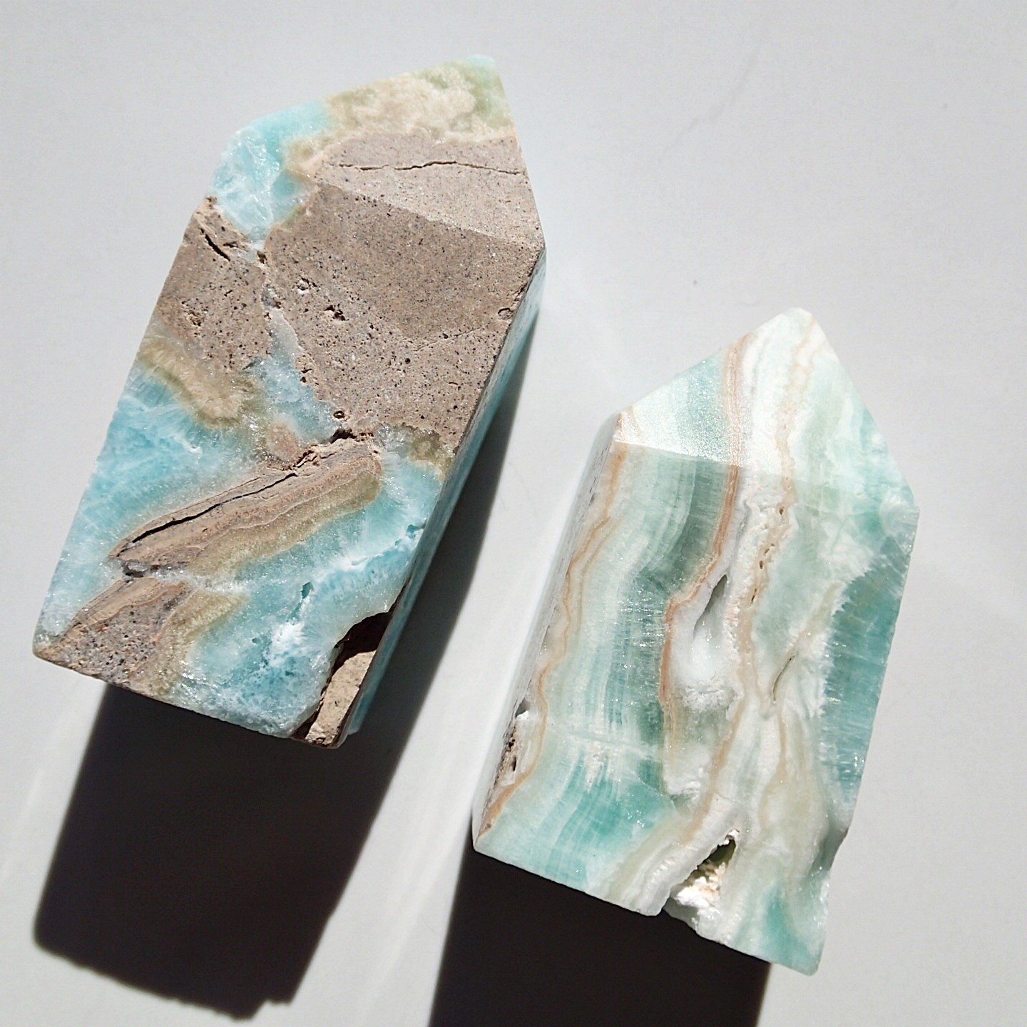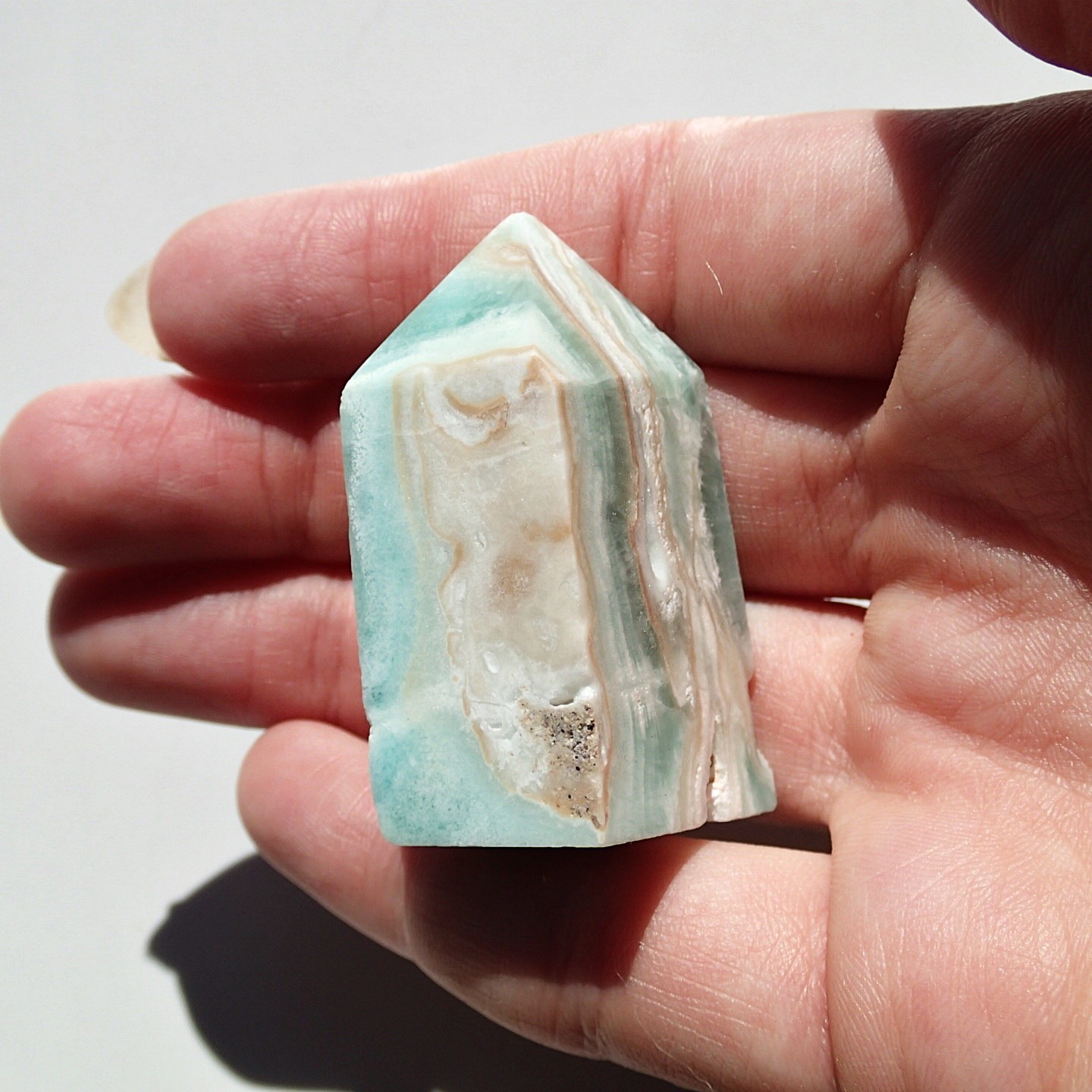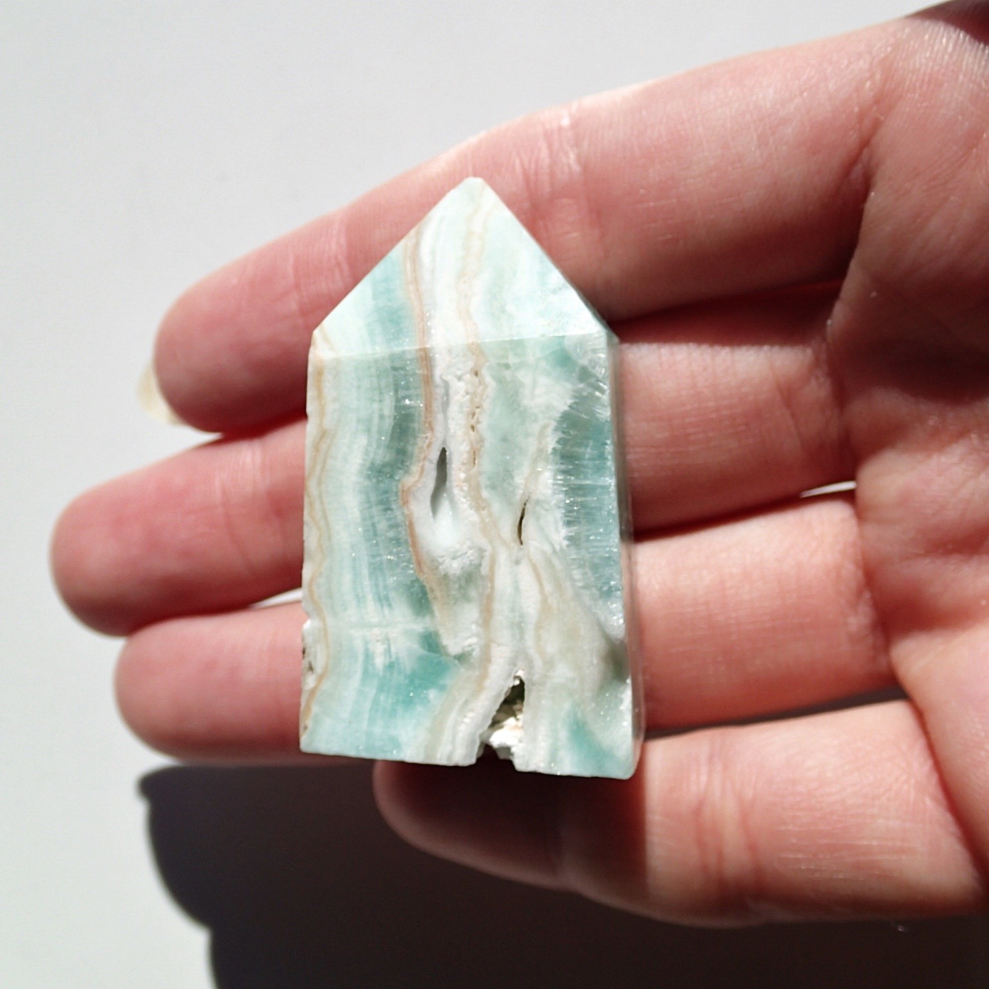 Karibischer Calcit Es ist eine Kombination aus einem sehr hellen ozeanblauen Calcit und hellbraunem und weißem Aragonit. Die Farbe des Steins sowie die winzigen Spalten und Knötchen in seiner Struktur (einige davon können sogar eine winzige, drusige Beschichtung im Inneren aufweisen) ziehen Ihre Aufmerksamkeit sofort auf sich.