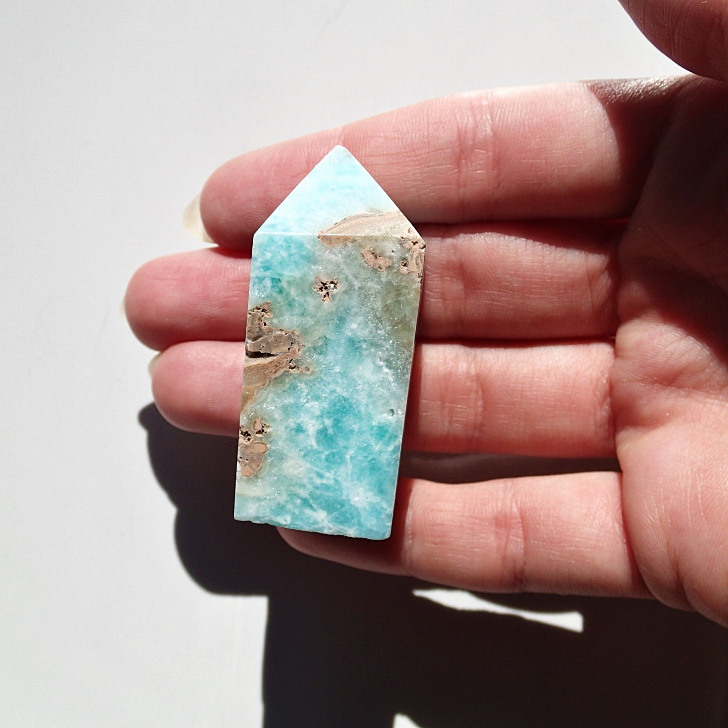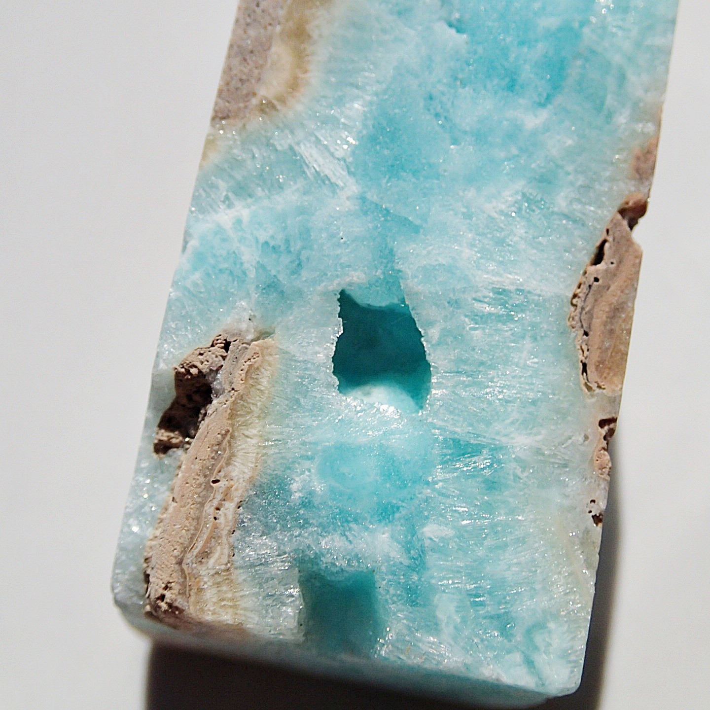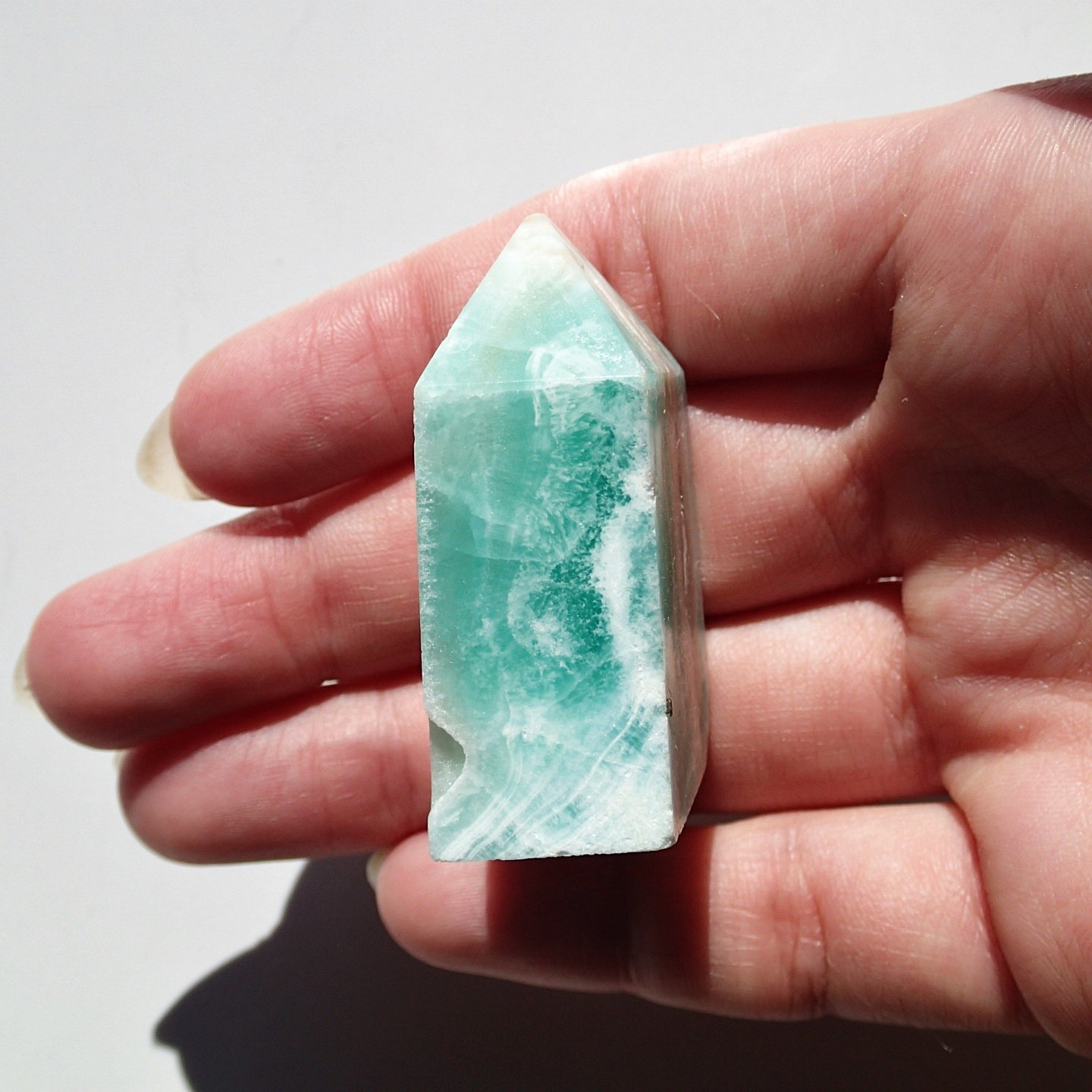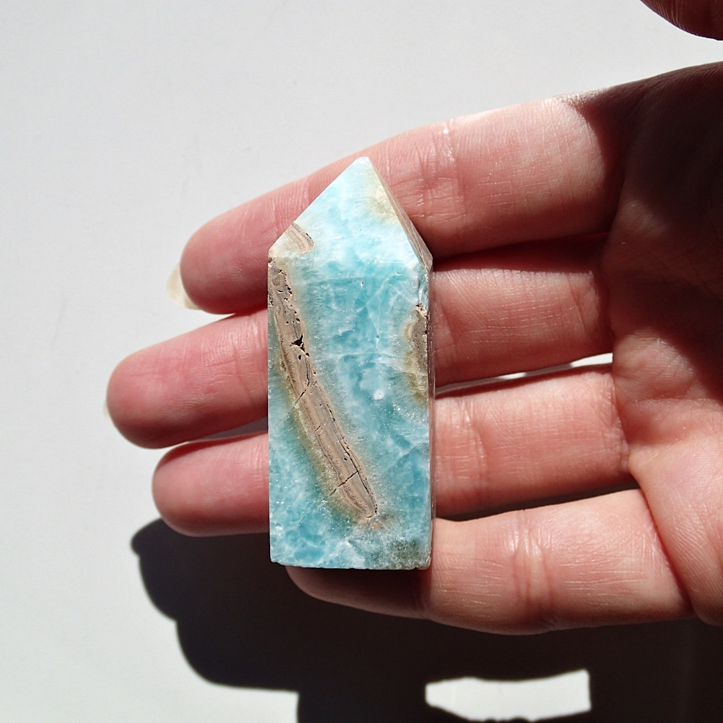 Karibischer Calcit Es ist eine Kombination aus einem sehr hellen ozeanblauen Calcit und hellbraunem und weißem Aragonit. Die Farbe des Steins sowie die winzigen Spalten und Knötchen in seiner Struktur (einige davon können sogar eine winzige, drusige Beschichtung im Inneren aufweisen) ziehen Ihre Aufmerksamkeit sofort auf sich.