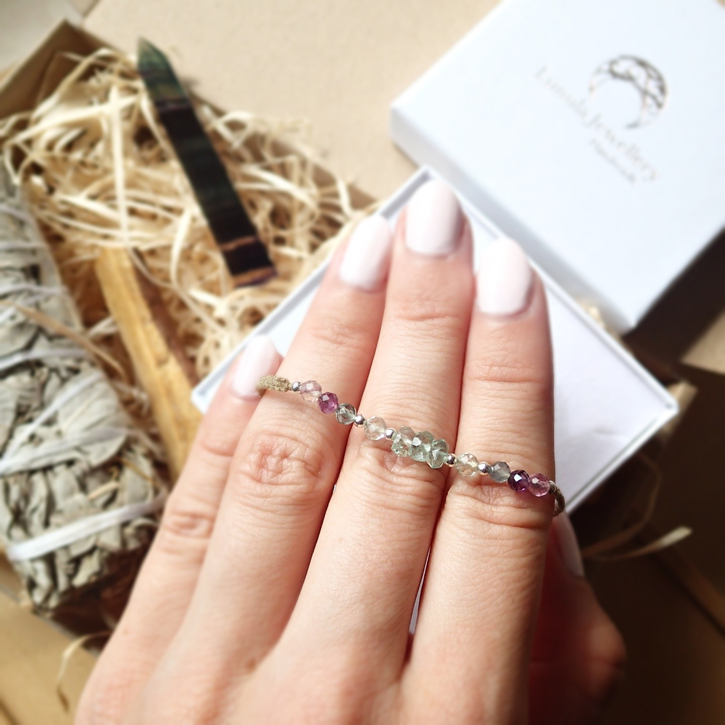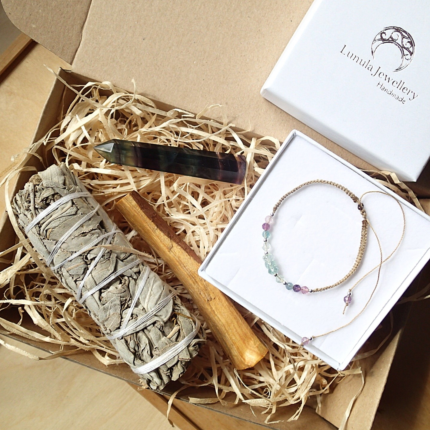 Ein Set bestehend aus einem handgefertigten Armband, einem kleinen Obelisken – Fluorit und Räucherstäbchen – weißer Salbei und Palo Santo.