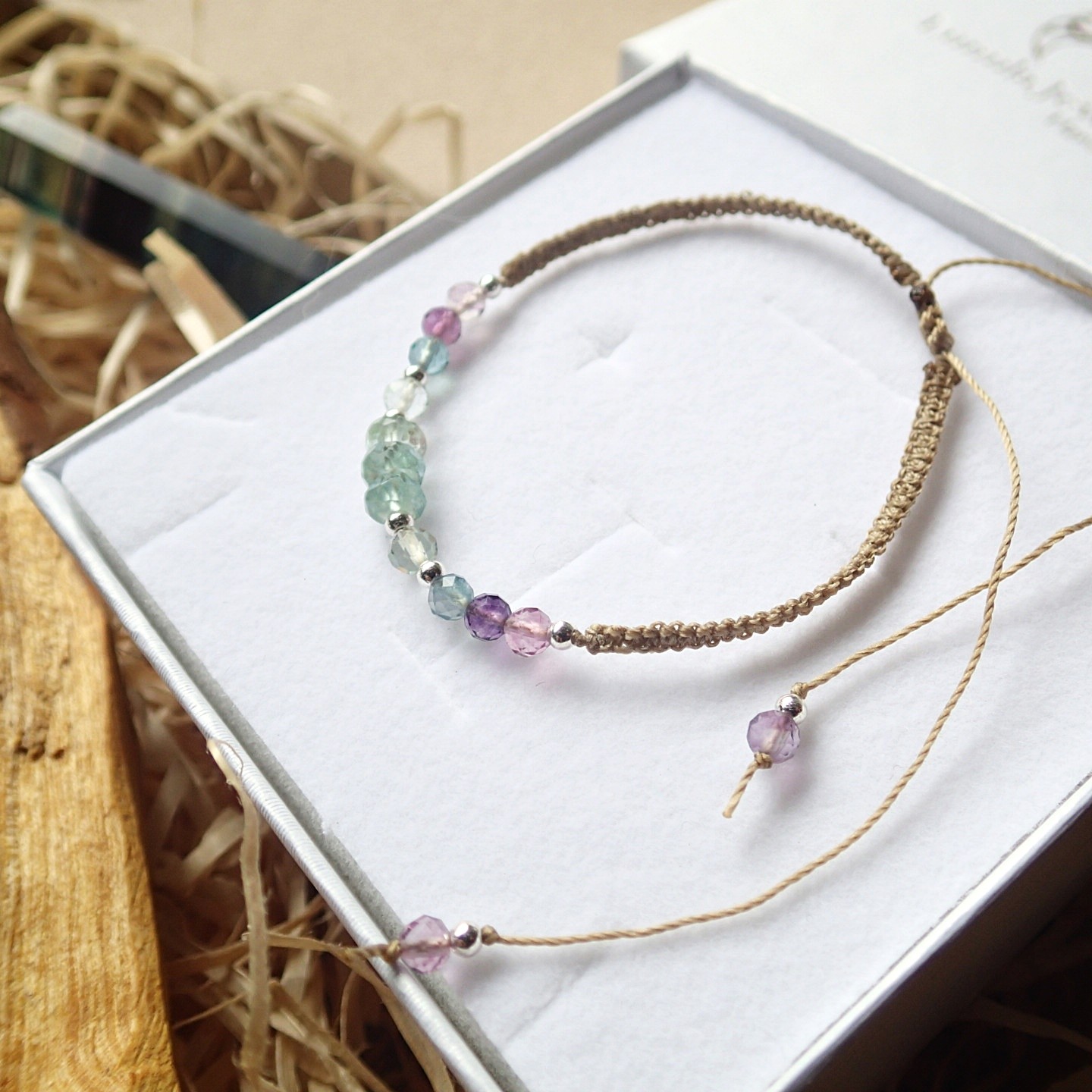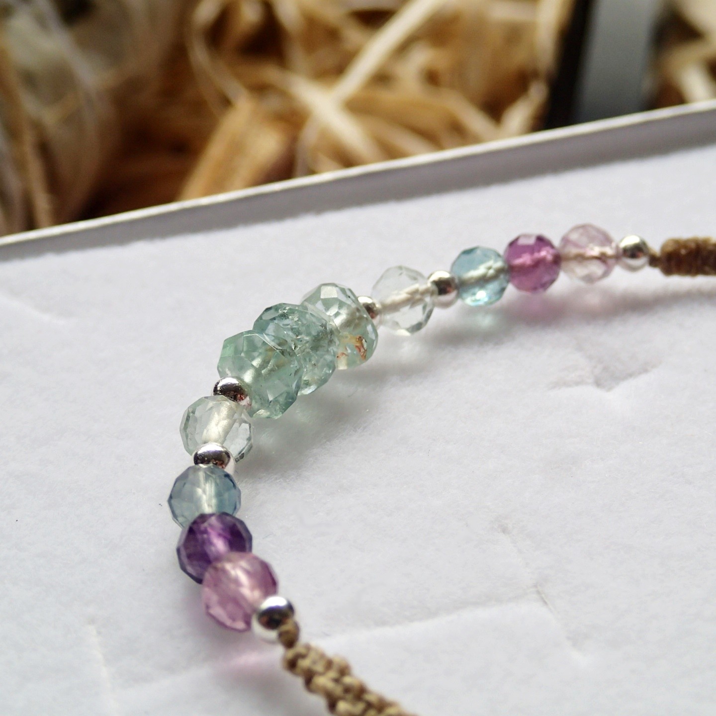 Das Armband besteht aus einer beigen, starken Schnur, geschliffenem Aquamarin-rondelle, Fluoritkugeln und 925er Silber.