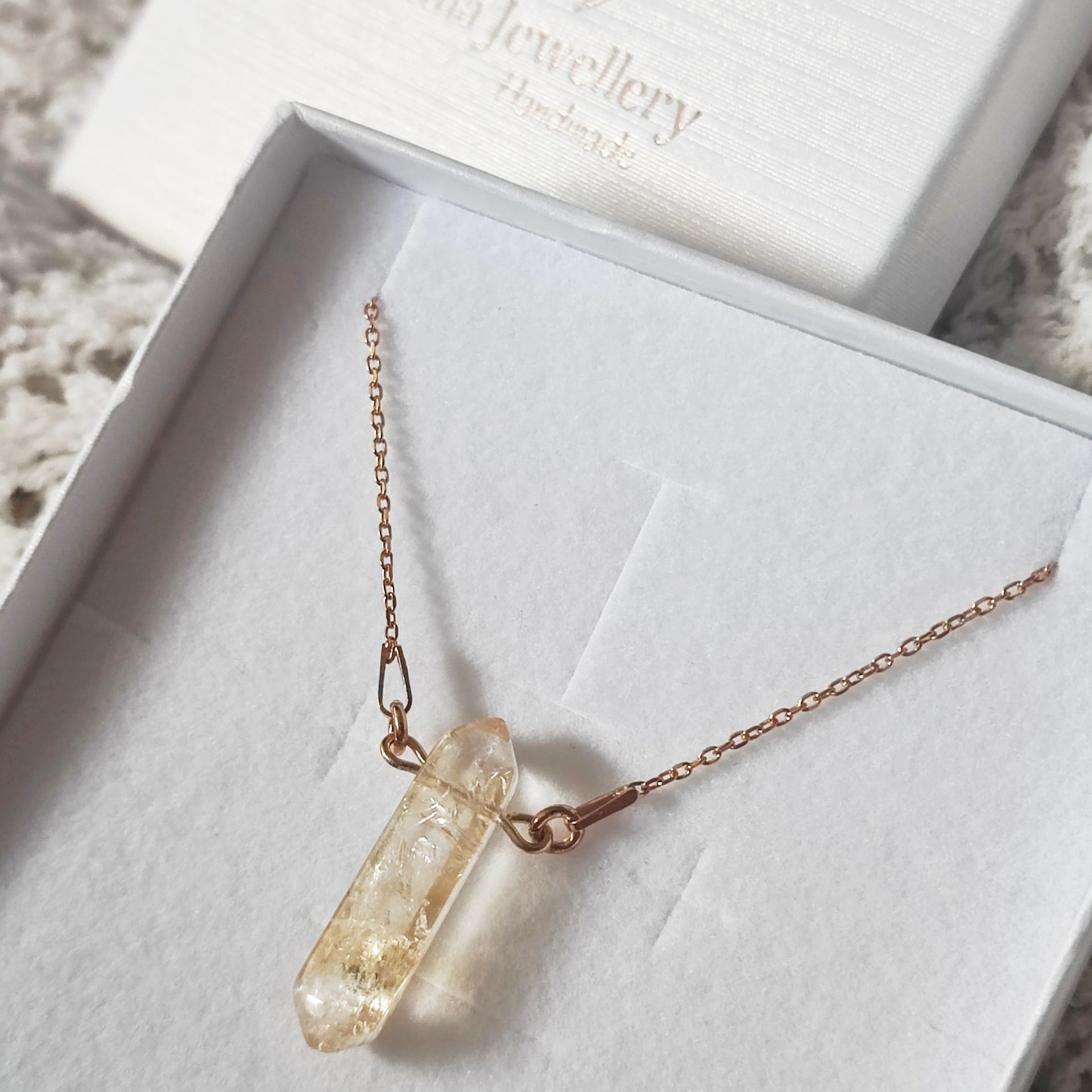 Eine Halskette aus Silber, mit 24 Karat Gold überzogen, deren Unterseite mit einer Säule aus natürlicher Citrin verziert ist.