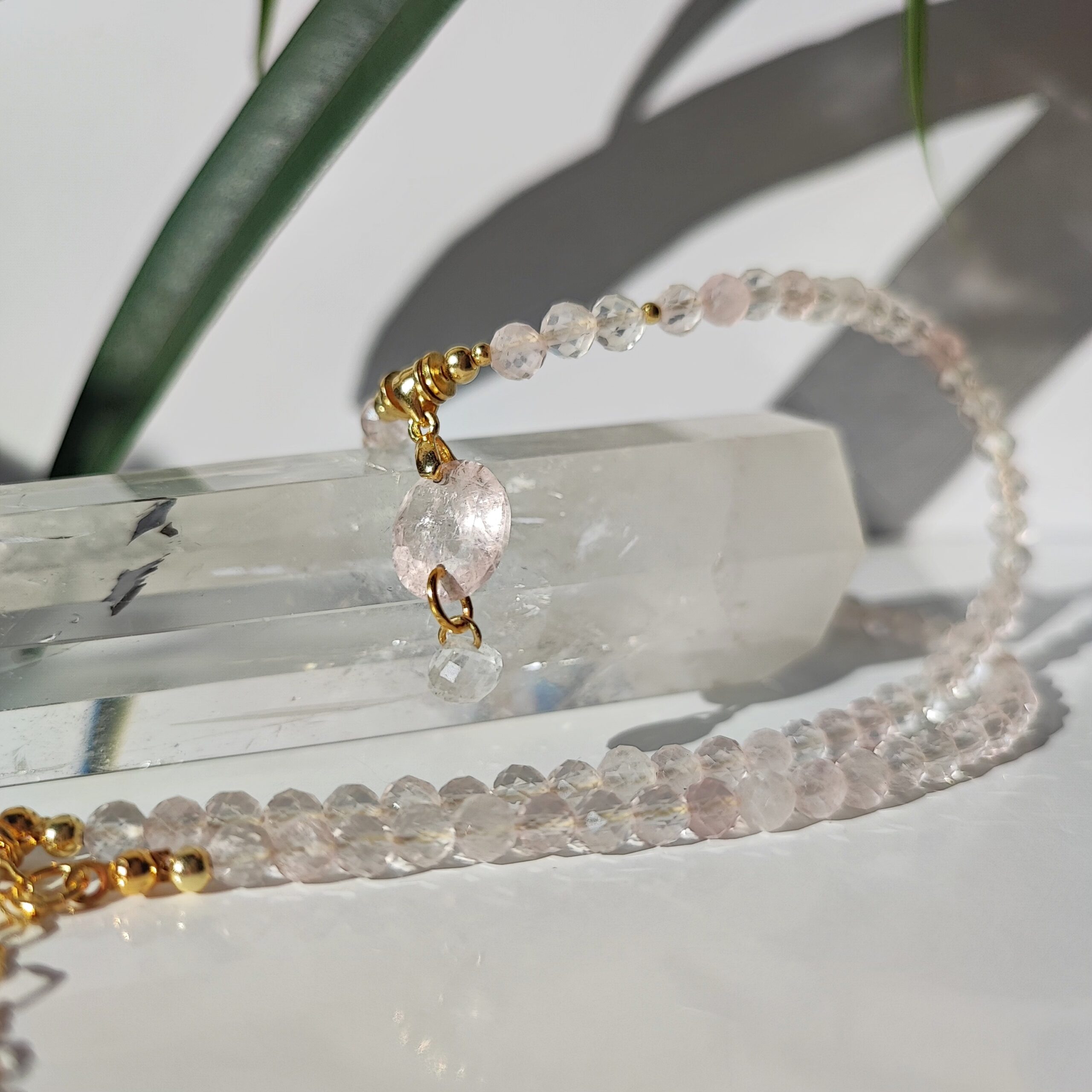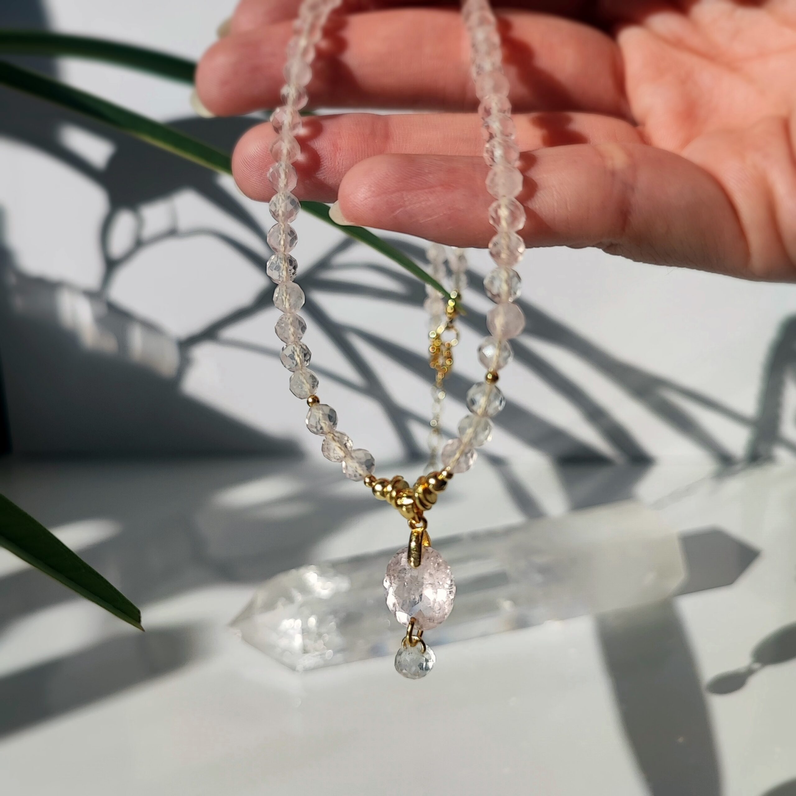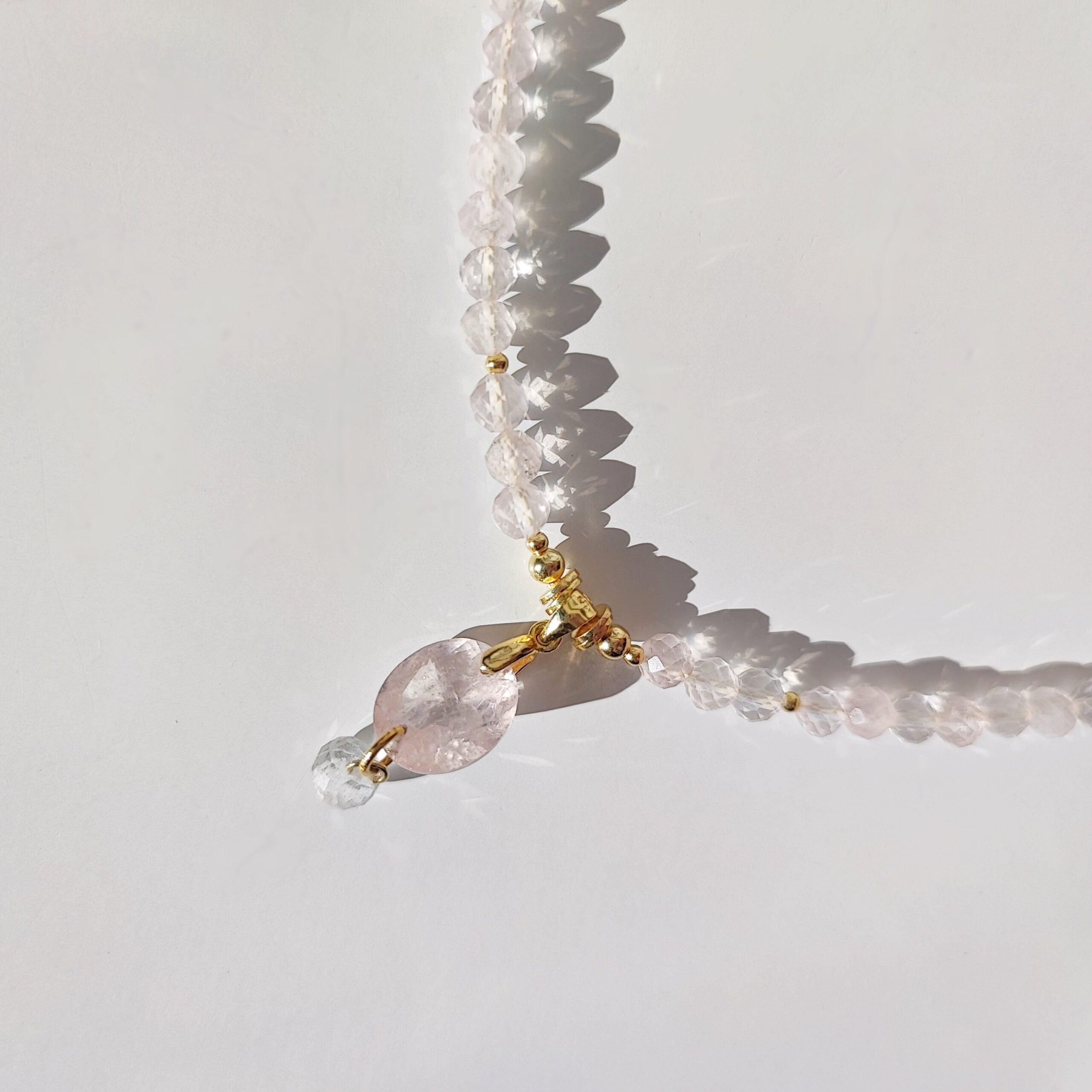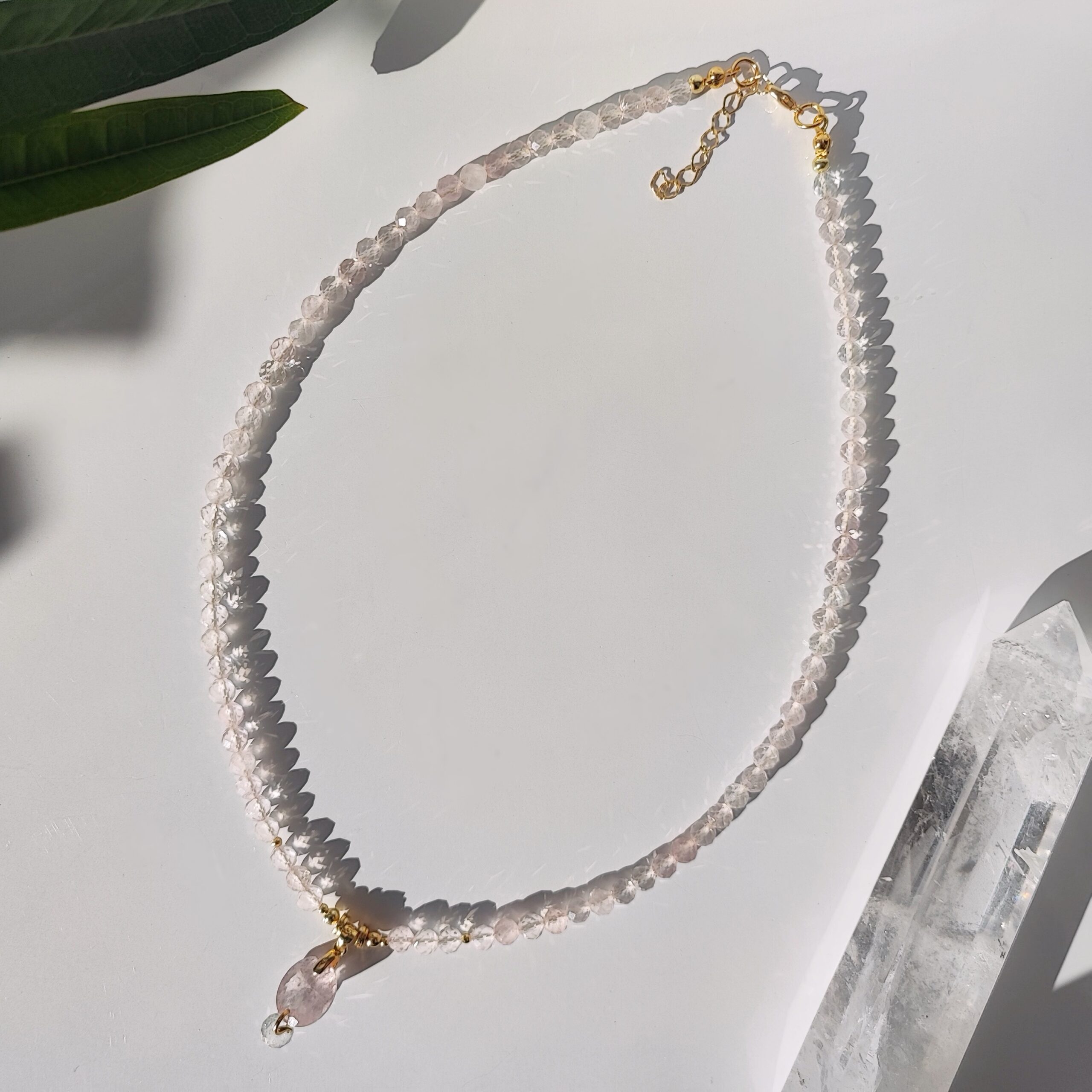 Diese exquisite Halskette verkörpert subtile Eleganz und Luxus. Gefertigt aus facettierten Kugeln aus klarem Rosenquarz (4 mm), besticht sie durch ihren sanften Glanz und ihre Leichtigkeit. Ergänzt wird das Design durch vergoldete Silberelemente sowie einen atemberaubenden Anhänger – einen edlen Morganit (12 × 11 × 6 mm) mit faszinierendem Funkeln, unter dem ein schimmernder weißer Topas im „Onion“-Schliff glänzt.