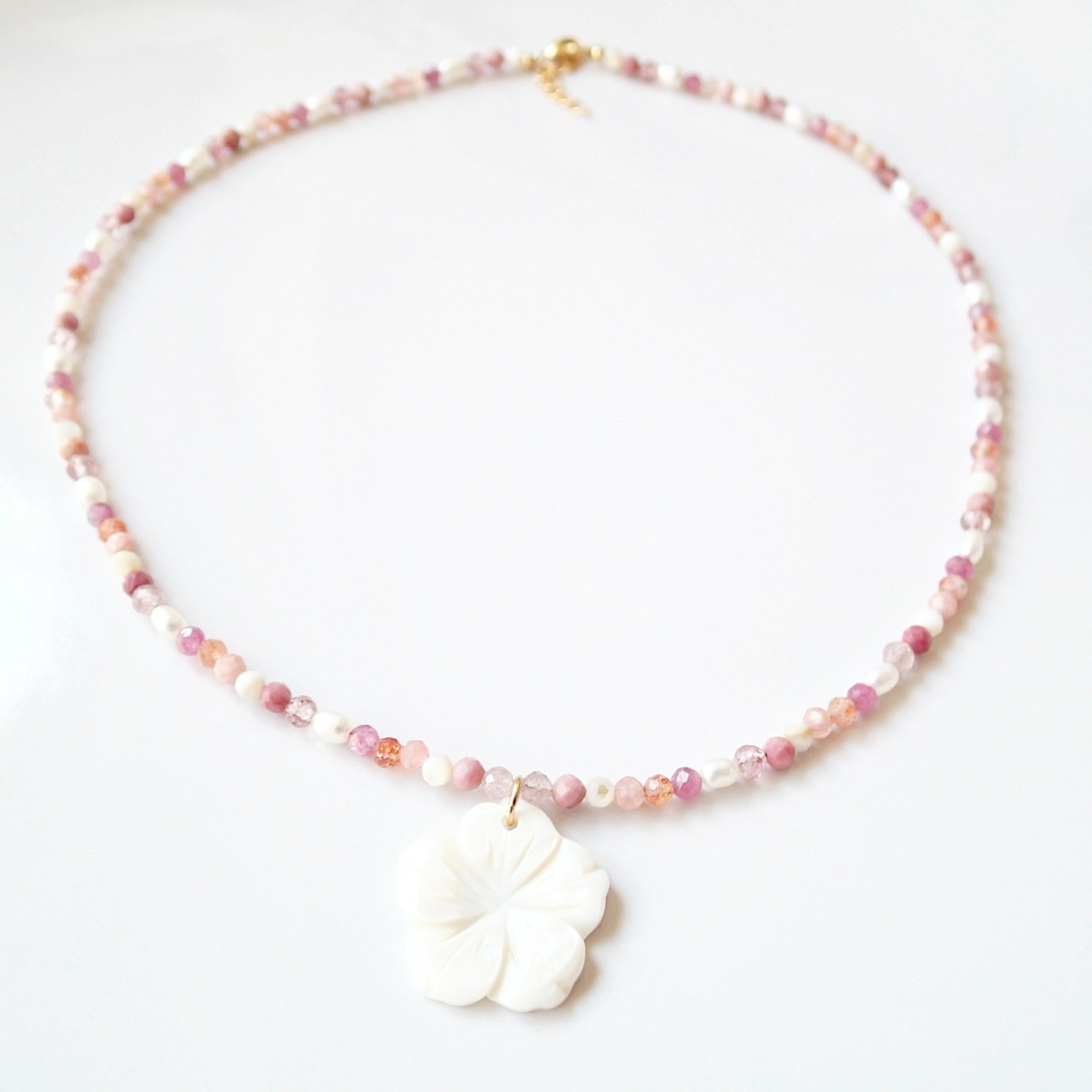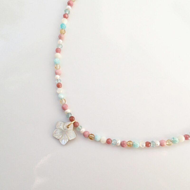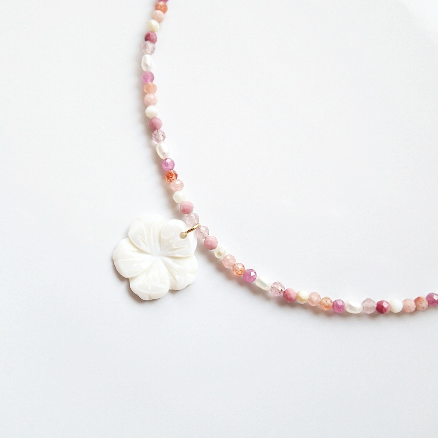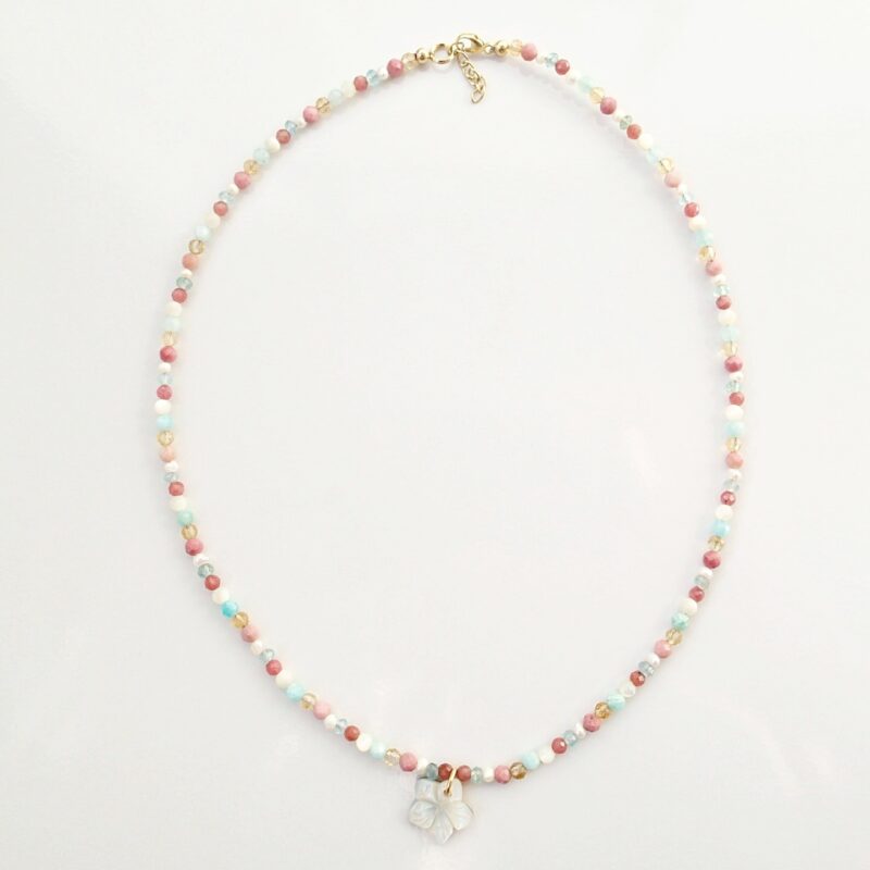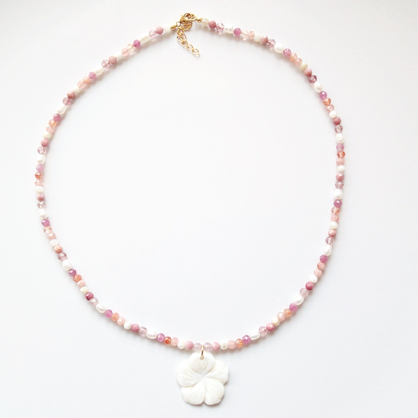 Halskette aus Natursteinen mit Perlenblume ‘Hibiscus’