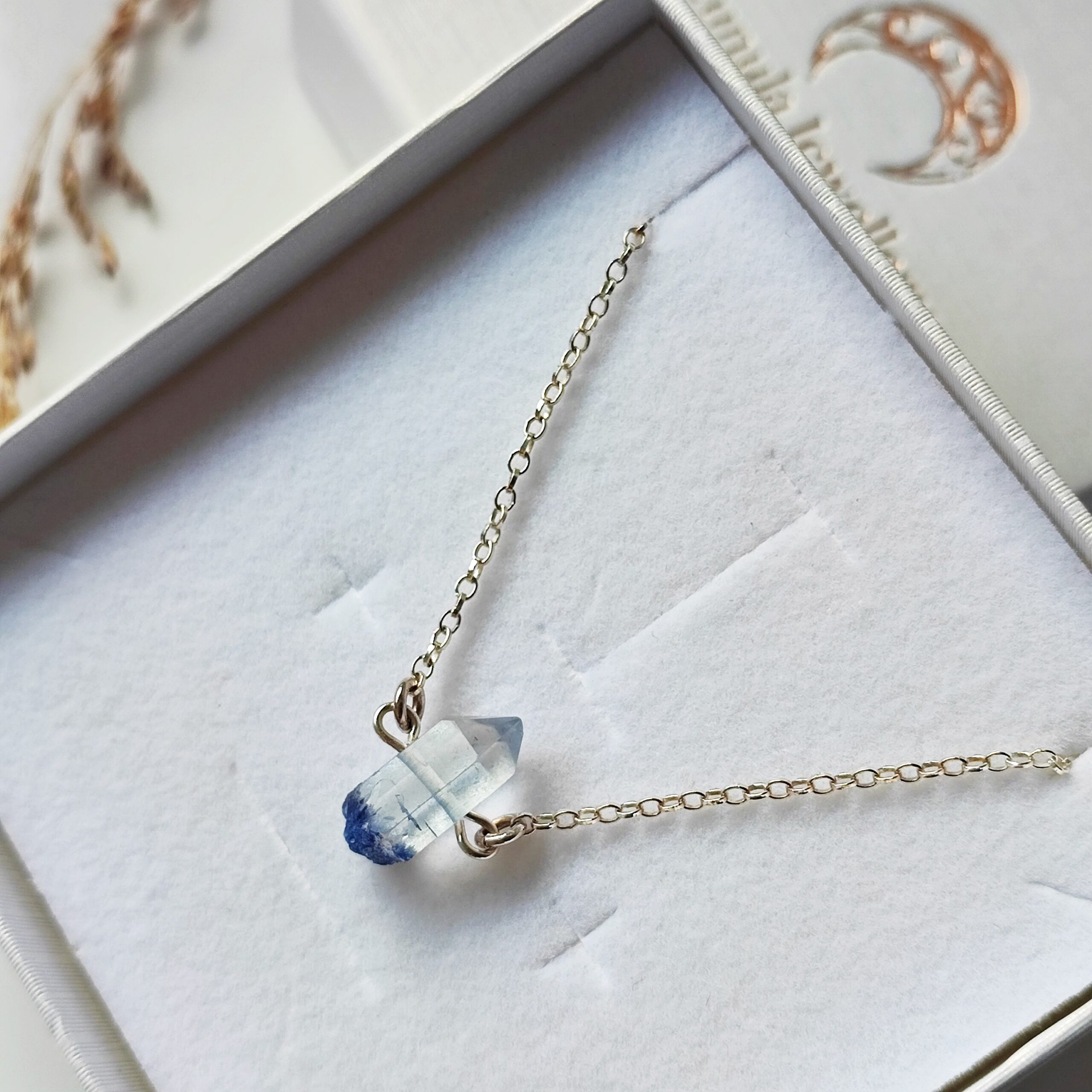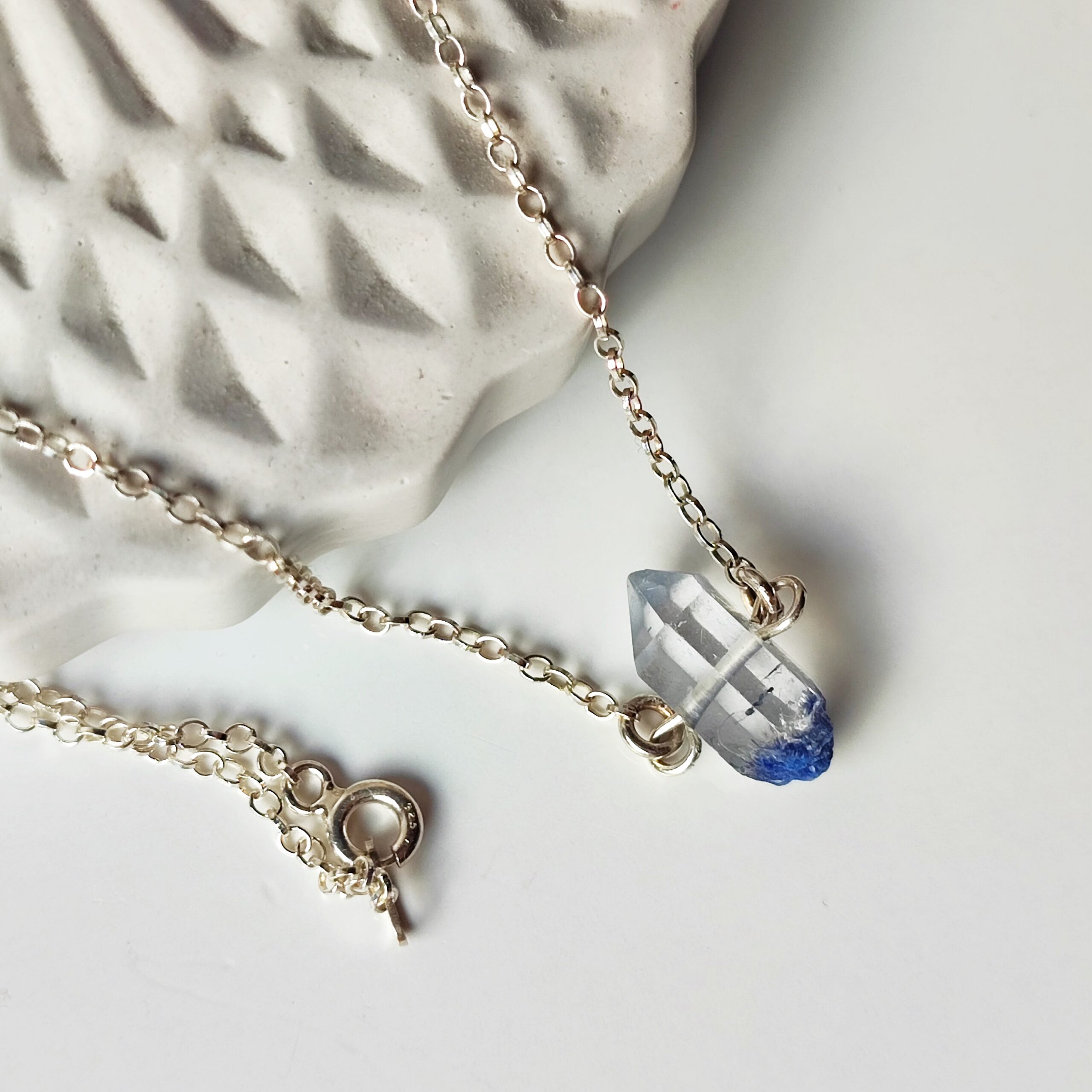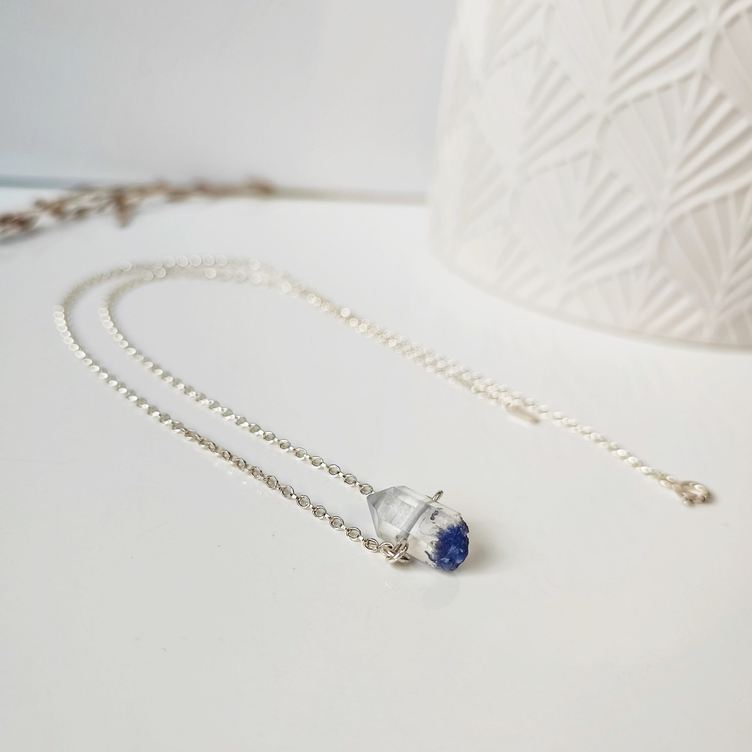 **Einzigartiger und seltener Stab aus Bergkristall mit Dumortierit-Einschlüssen (blaue Farbe), aufgehängt an einer Silberkette (925).**