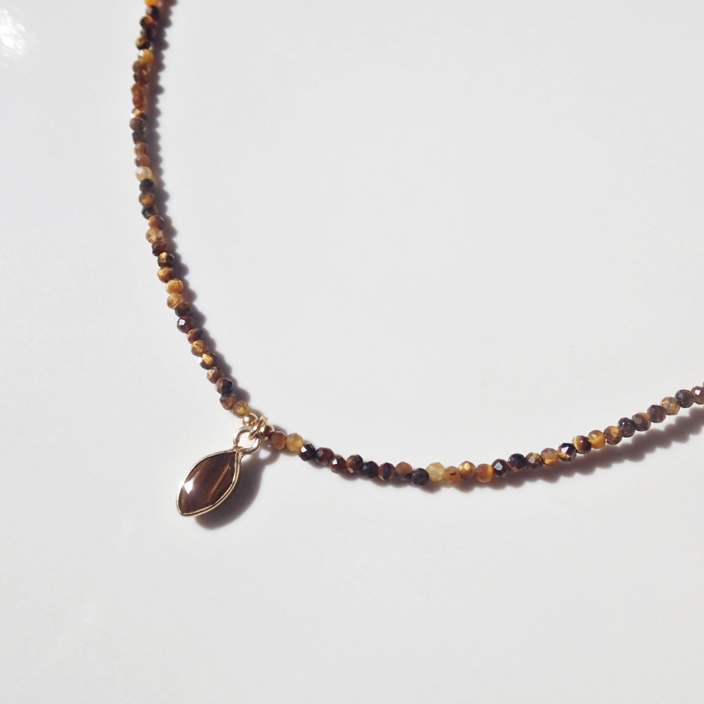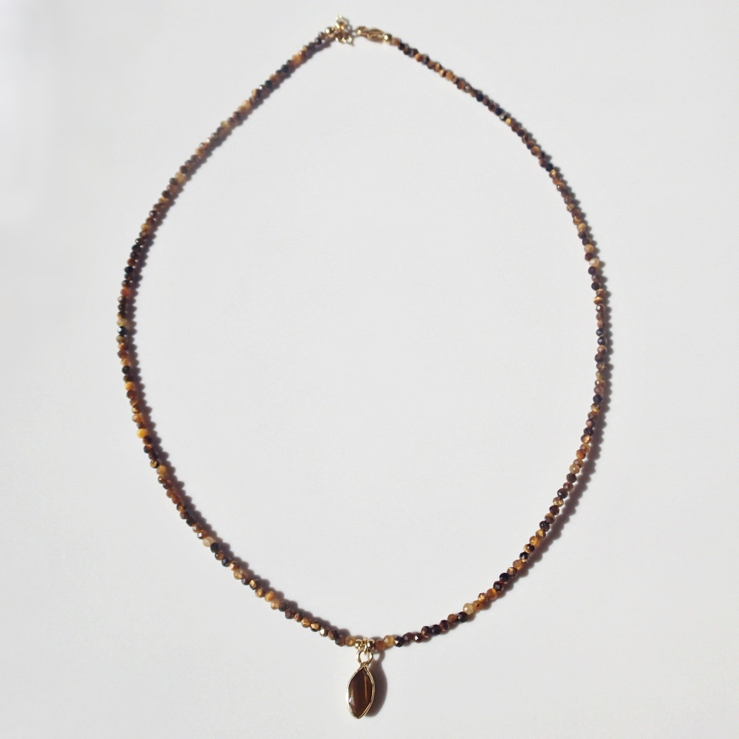 Handgefertigte Halskette aus natürlichem Tigerauge und Elementen aus Silber (925) vergoldet. In der Mitte ist die Halskette mit einem Anhänger mit einem natürlichen Tigerauge verziert.