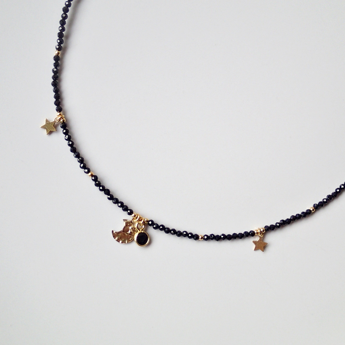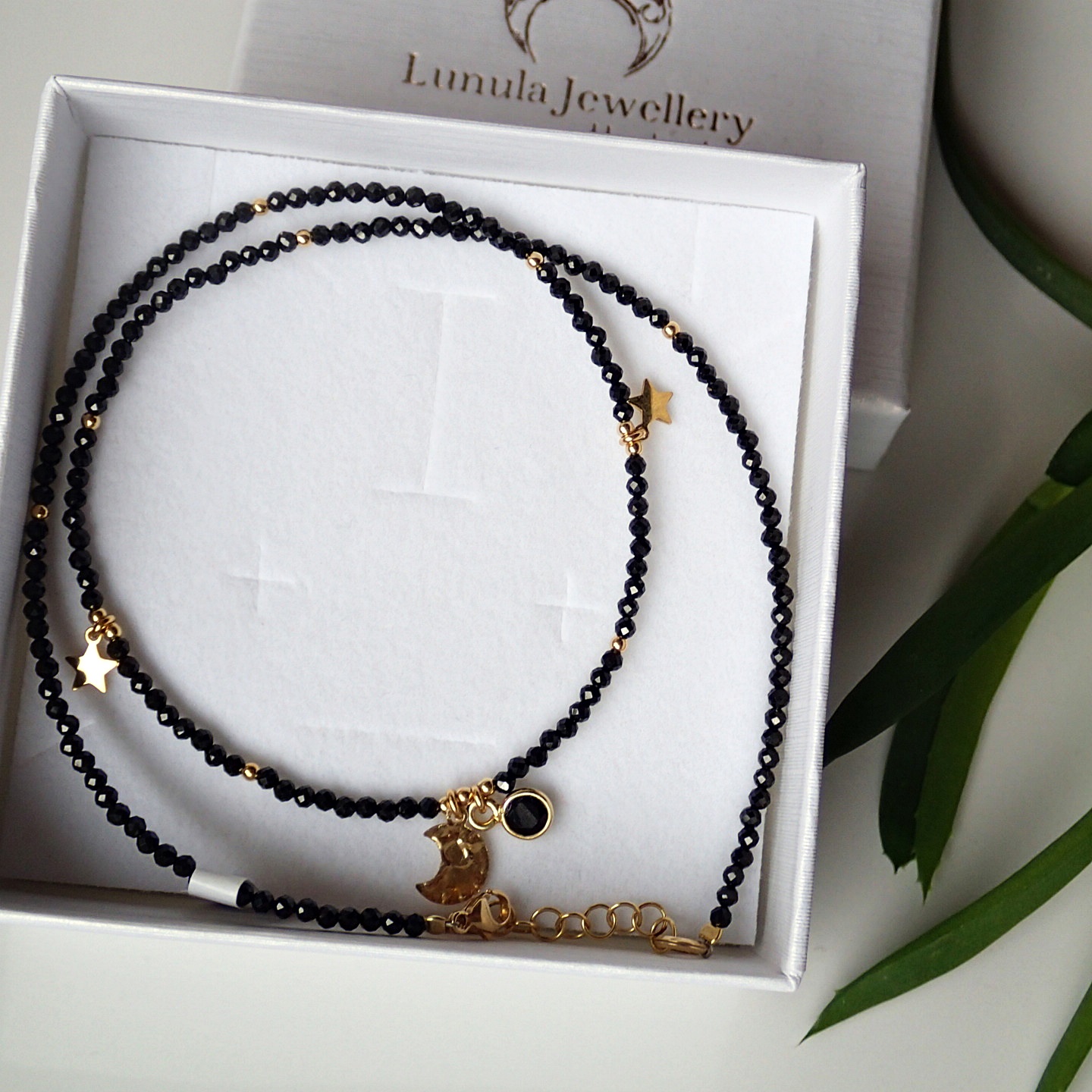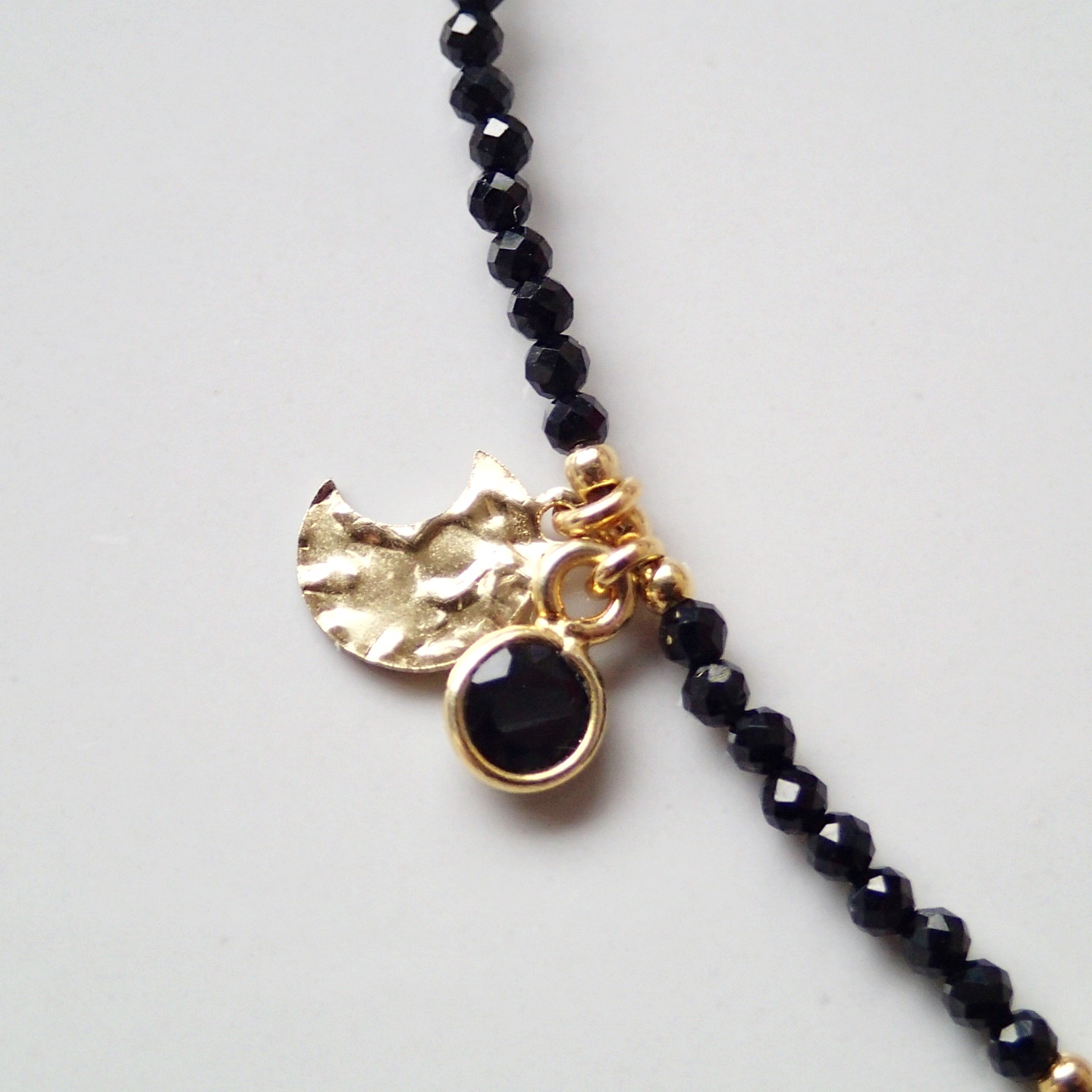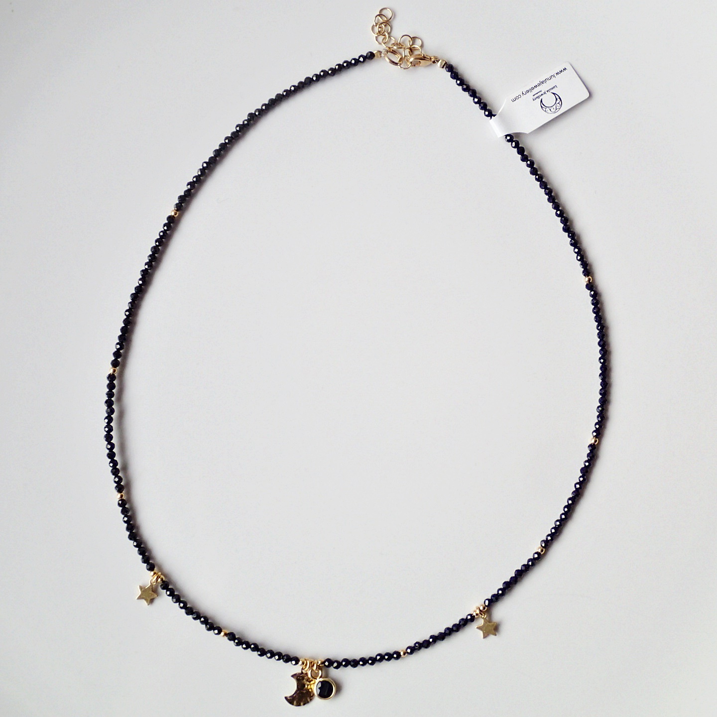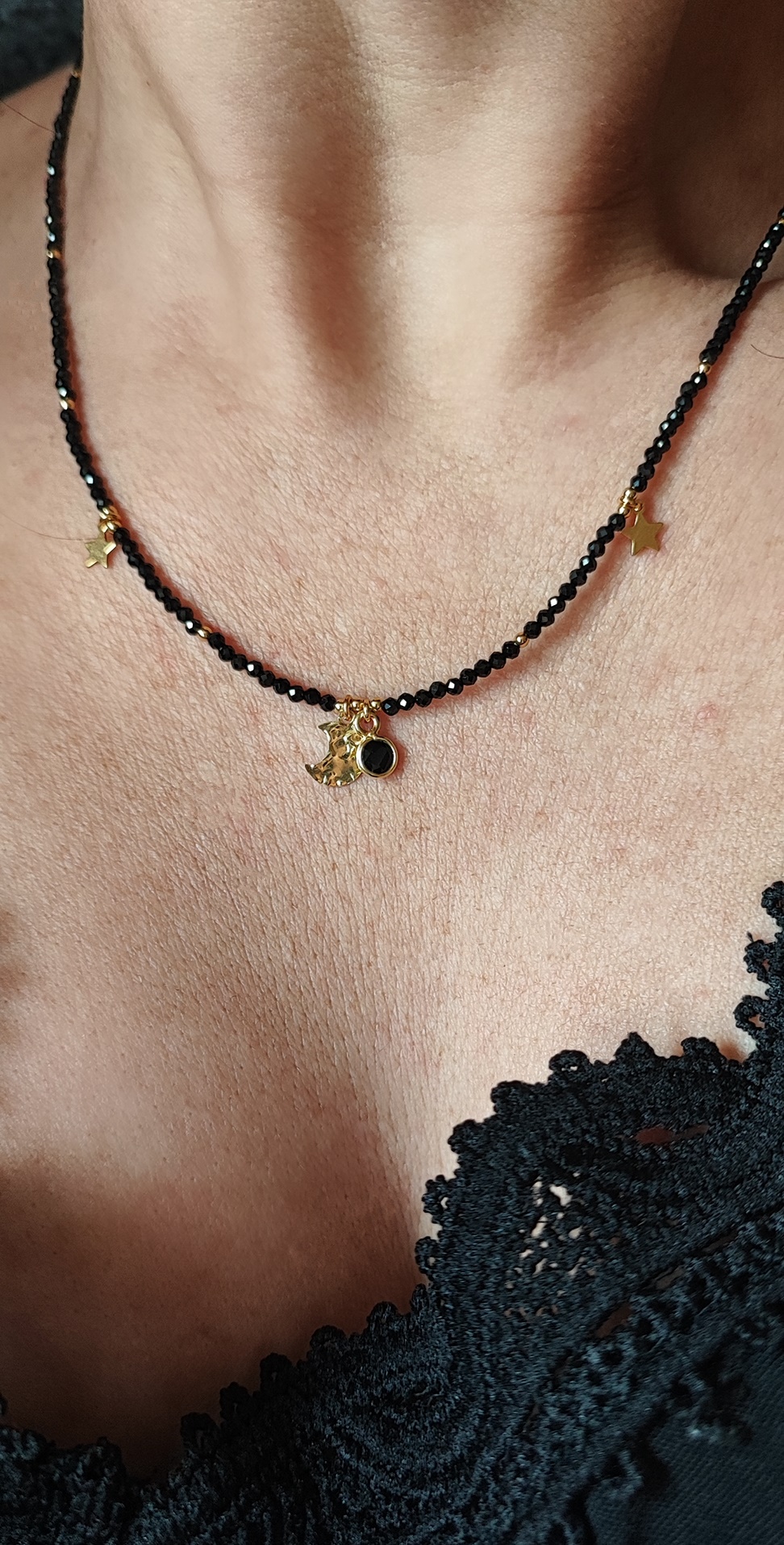Tauch ein in die mystische Schönheit unserer Halskette aus Turmalin – einem Juwel der Natur, veredelt mit elegantem vergoldetem Silber. Das zentrale Schmuckstück ist der gehämmerte Mond, der der Halskette einen einzigartigen Charme verleiht. Auf beiden Seiten des Mondes befinden sich zarte Anhänger: Onyx in einer goldenen Fassung, der die Geheimnisse der Nacht symbolisiert, sowie je ein silbervergoldeter Stern, der die gesamte Komposition aufhellt.
