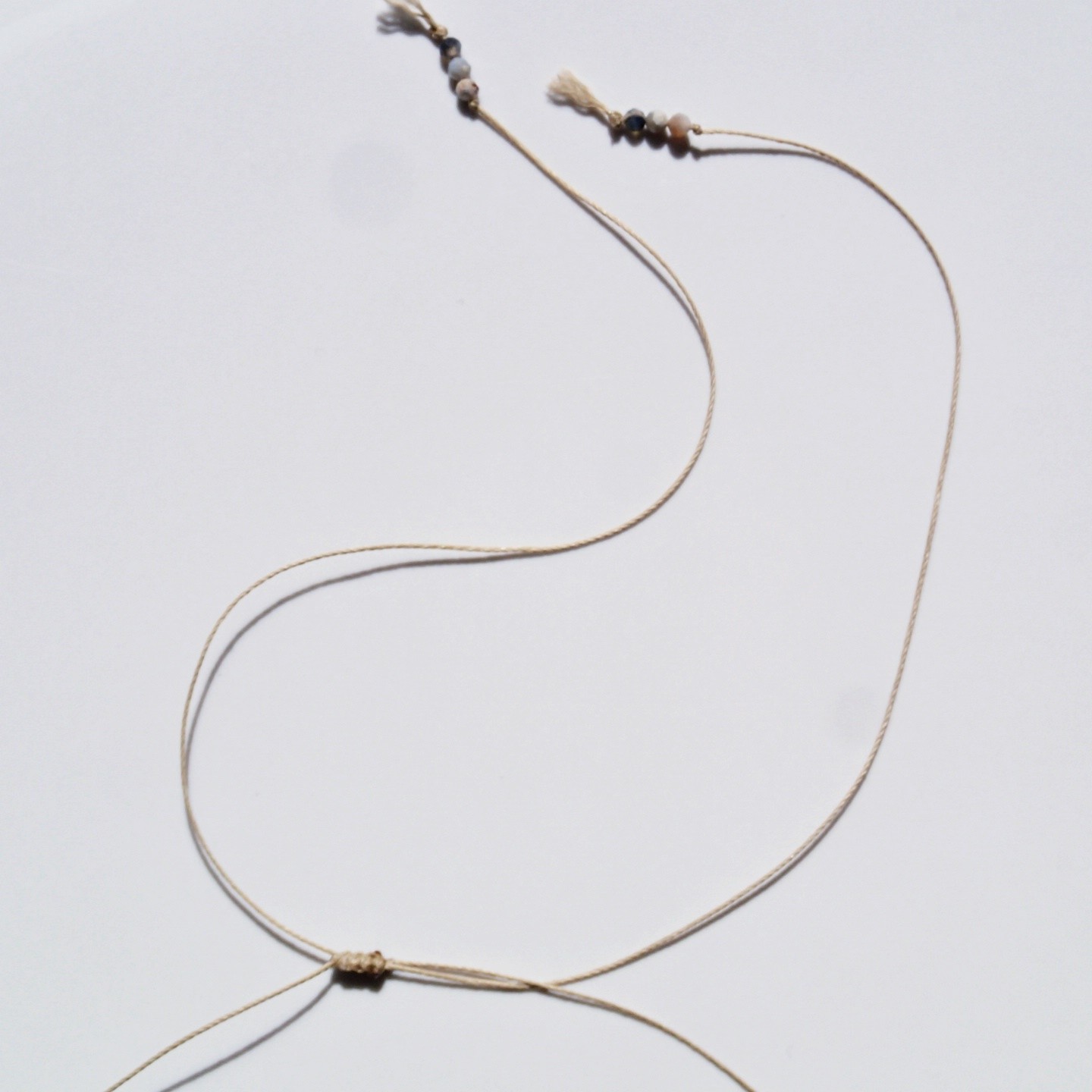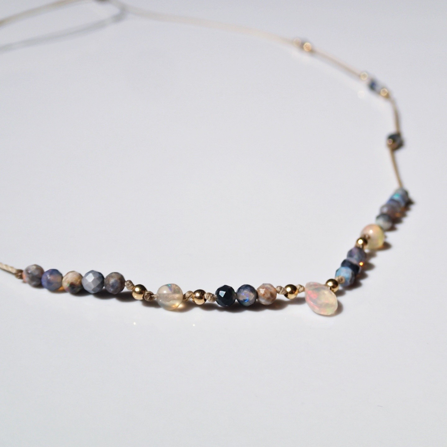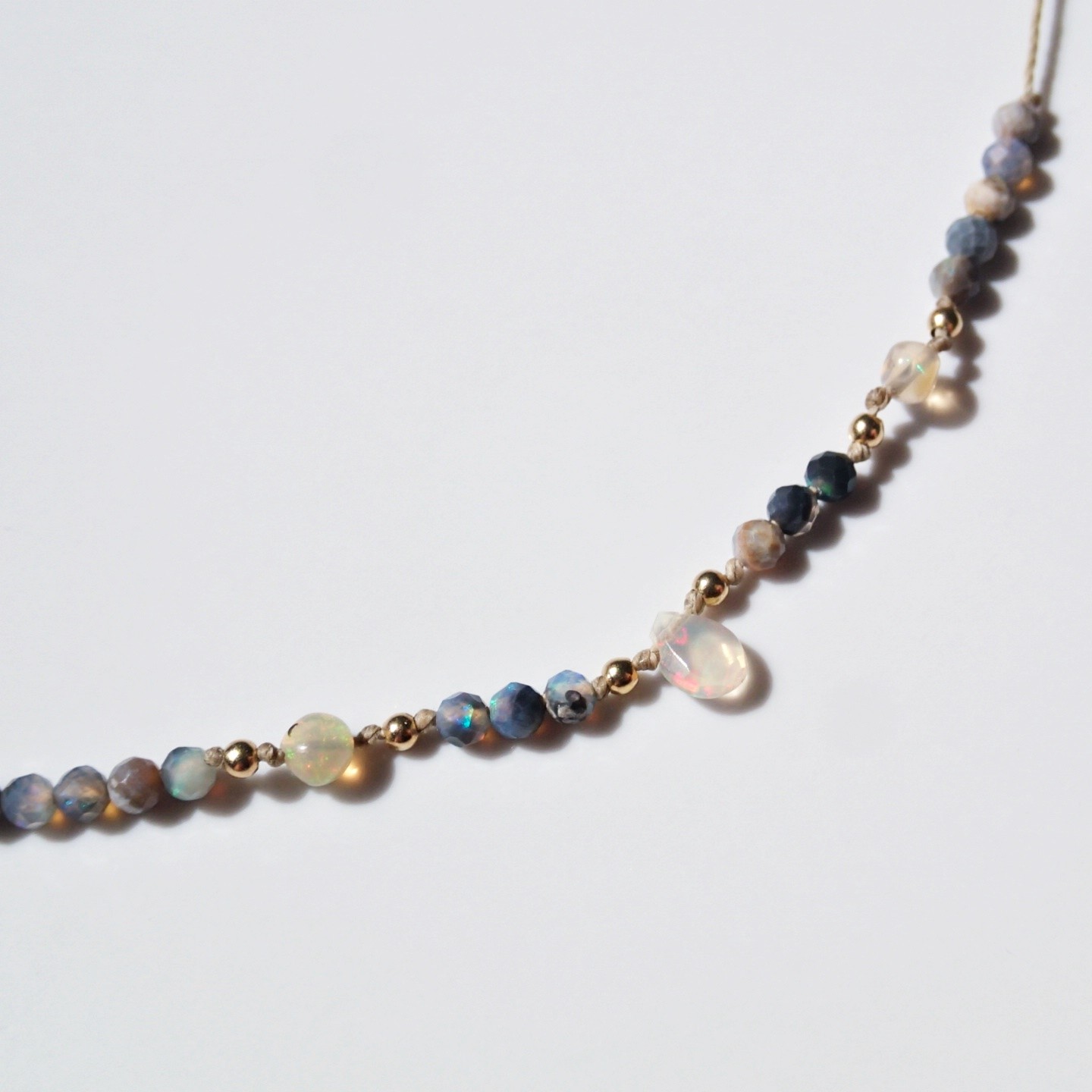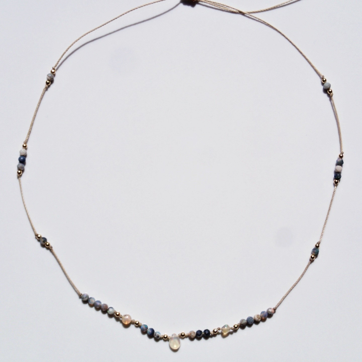 Die Halskette kann dank der verstellbaren Zugbänder tiefer am Ausschnitt oder enger am Hals getragen werden. Die Enden der Saiten sind mit drei australischen Opalperlen verziert. Die Halskette wird frei über dem Kopf angelegt.