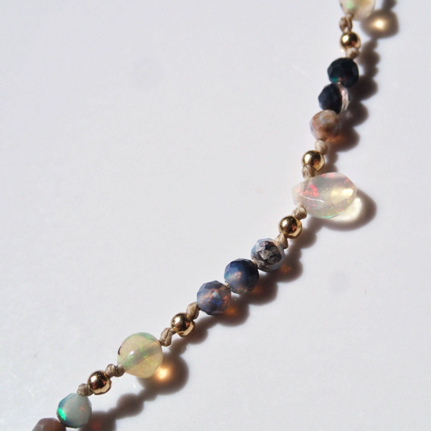 Handgemachte Halskette an einer beigen Schnur, Opal Welo in Form einer Träne und unregelmäßiger Kugeln (2 Stück), Boulder Opal und Silber (925) vergoldete Kugeln. Die Steine sind poliert, was ihnen noch mehr Glanz verleiht und das Farbenspiel im Licht betont. Der Tropfen und die Perlen des Welo-Opals aus Äthiopien sind transparent und funkeln je nach Art und Intensität des Lichts in Grün, Blau, Orange und Rot. Die restlichen erdigen Steine sind Boulder Opal aus Australien – in einigen von ihnen kann man grünes, blaues oder rotes Funkeln beobachten. Bilder bei Tageslicht, im Sonnenschein.