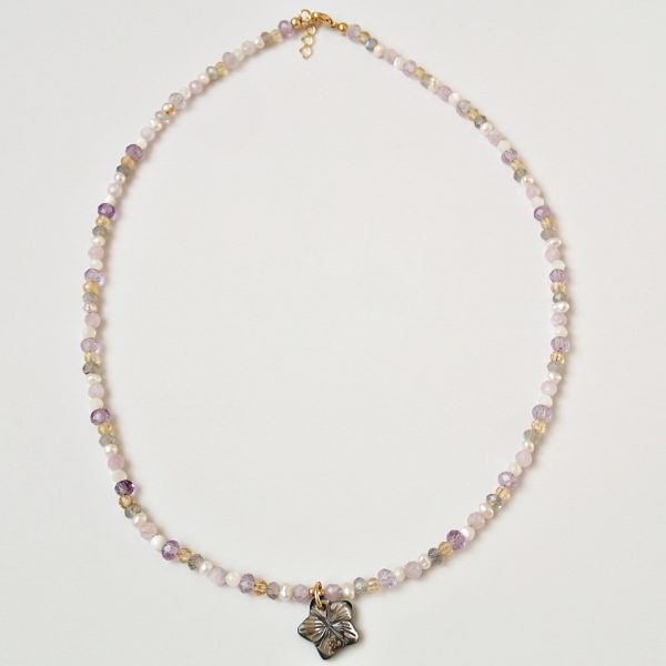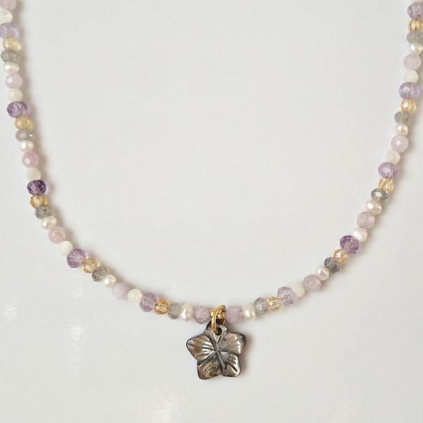 Halskette ‘Hula’ mit einer Muschelblume und Natursteinen