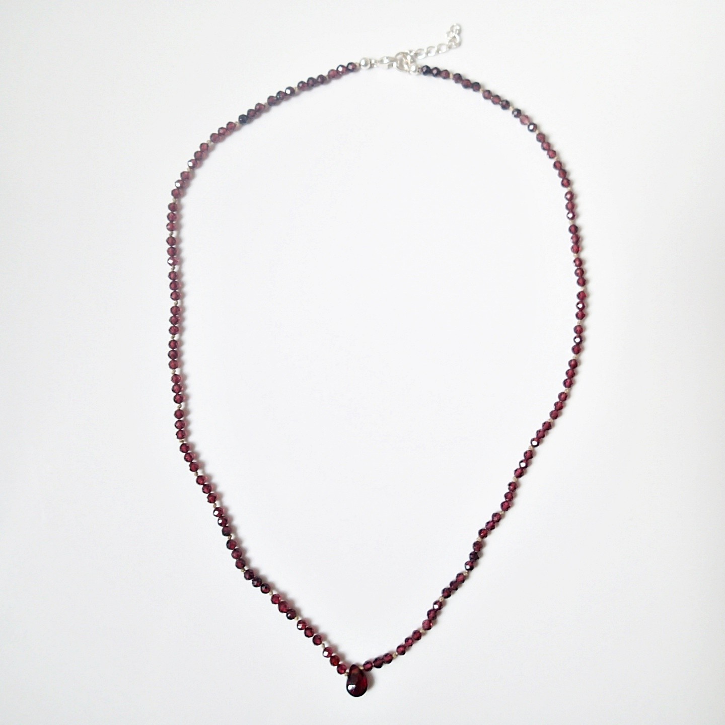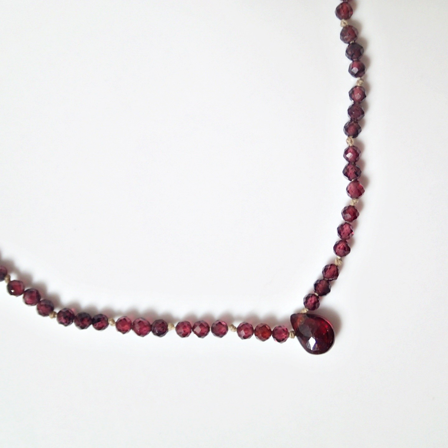 Die Mitte der Kette ist mit einem tropfenförmigen Granat verziert.