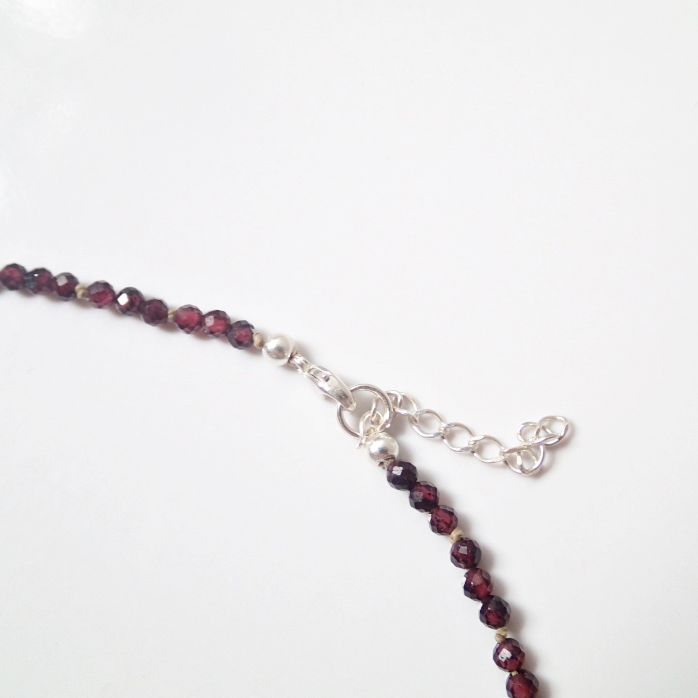 Eine handgefertigte Halskette aus hochwertigem Naturstein – Granat an einer strapazierfähigen, beigen Schnur. Schließe komplett aus 925 Silber.