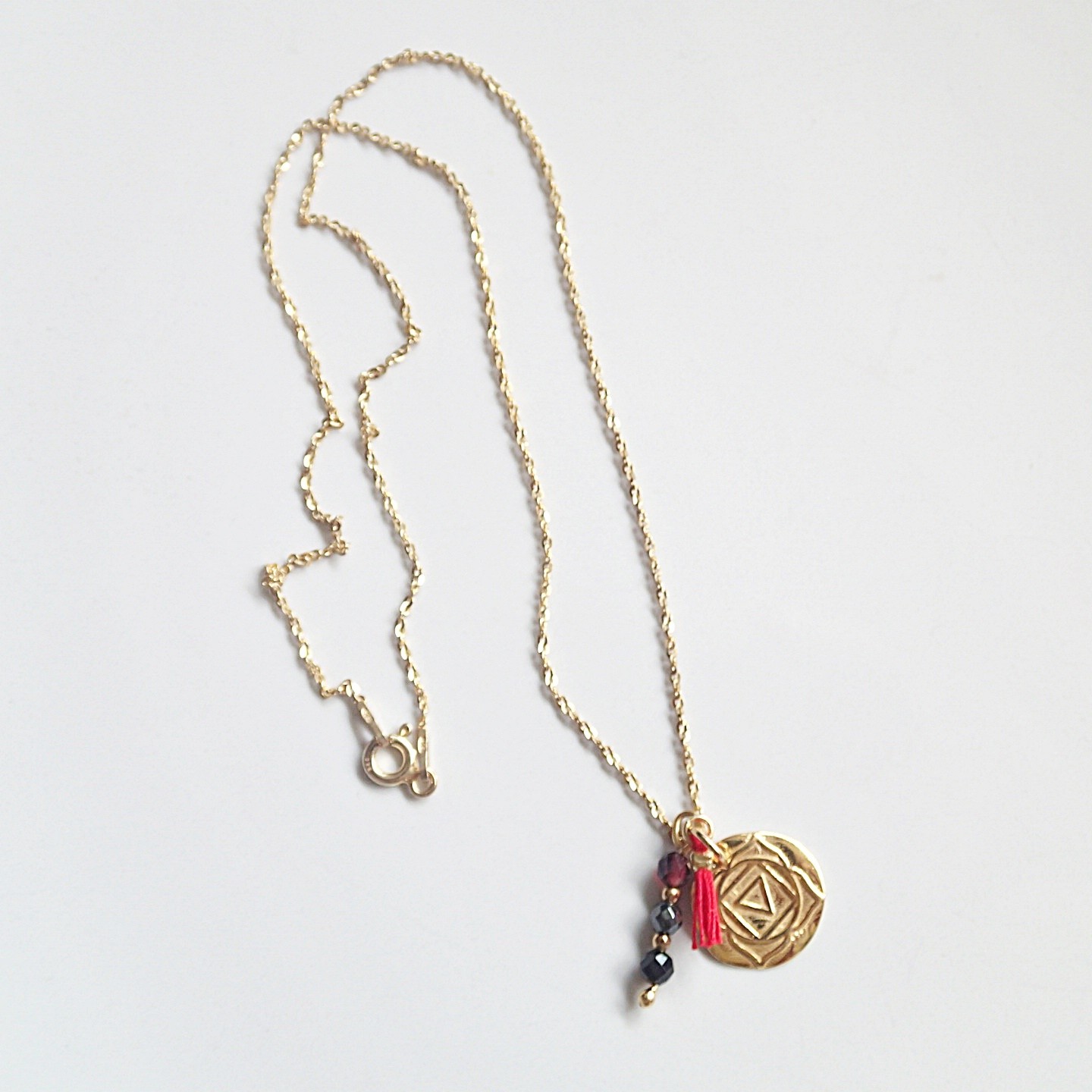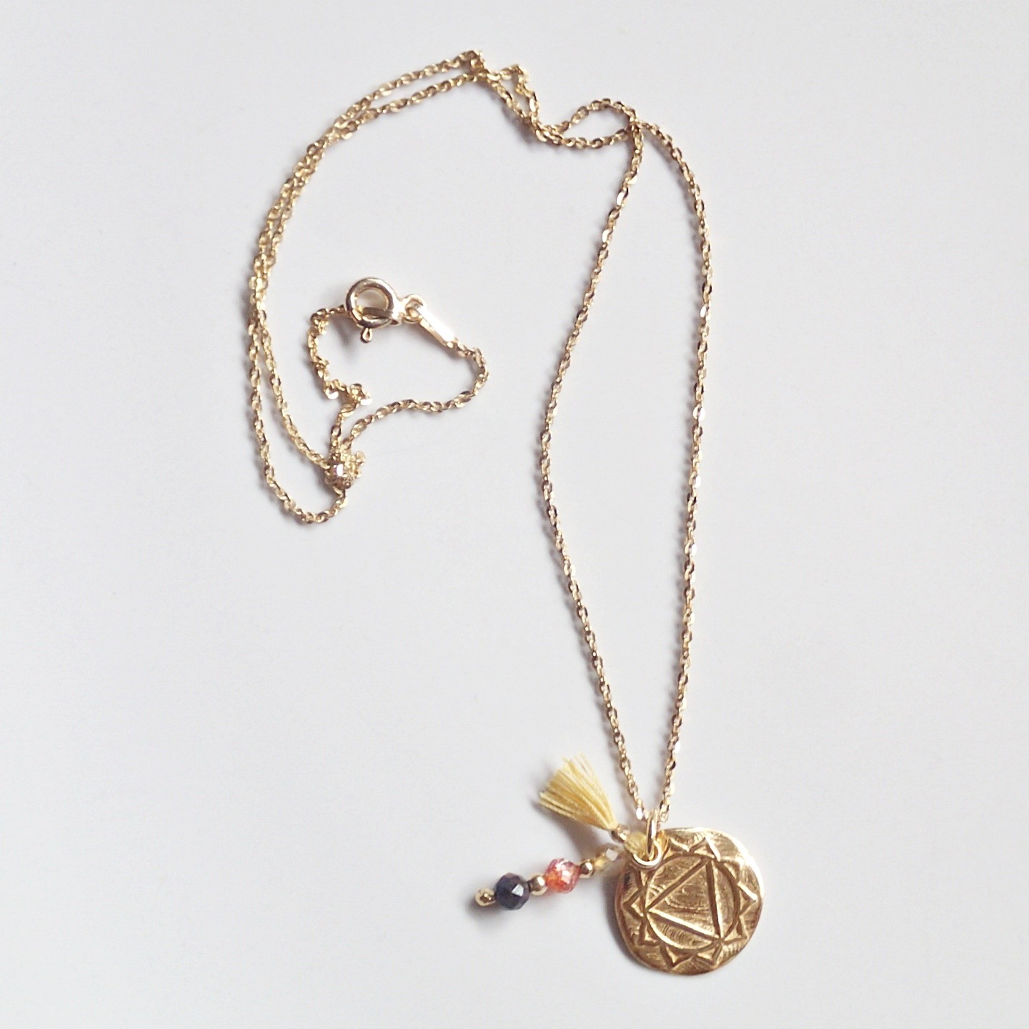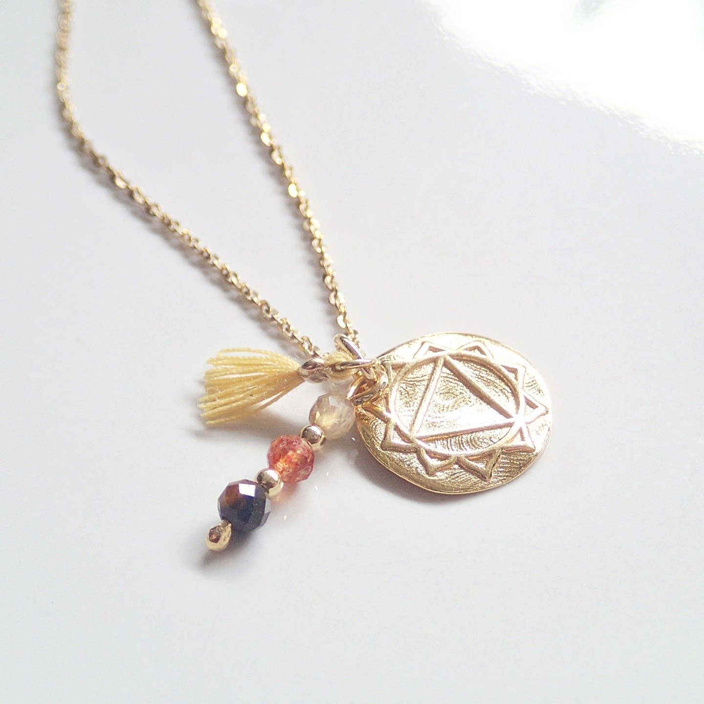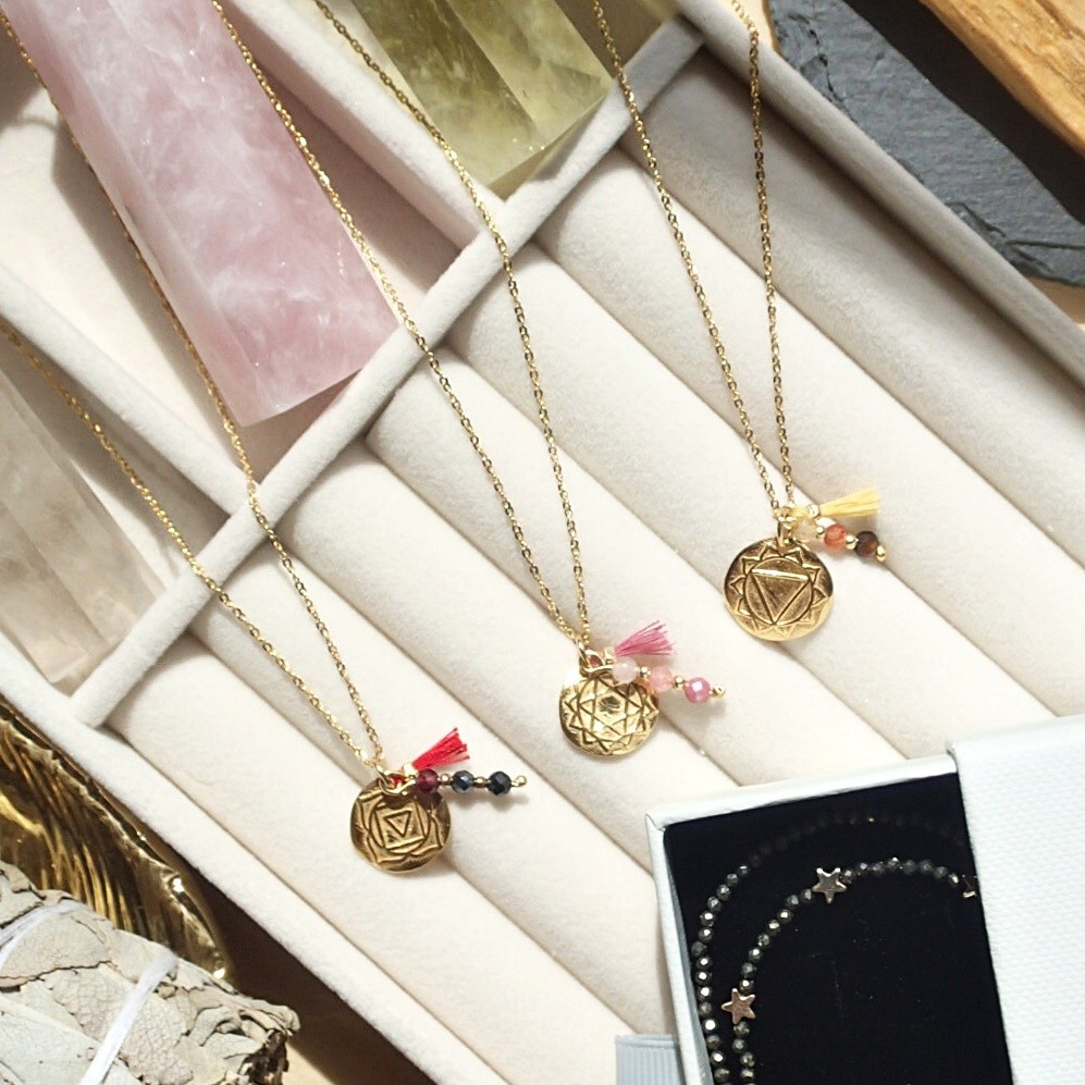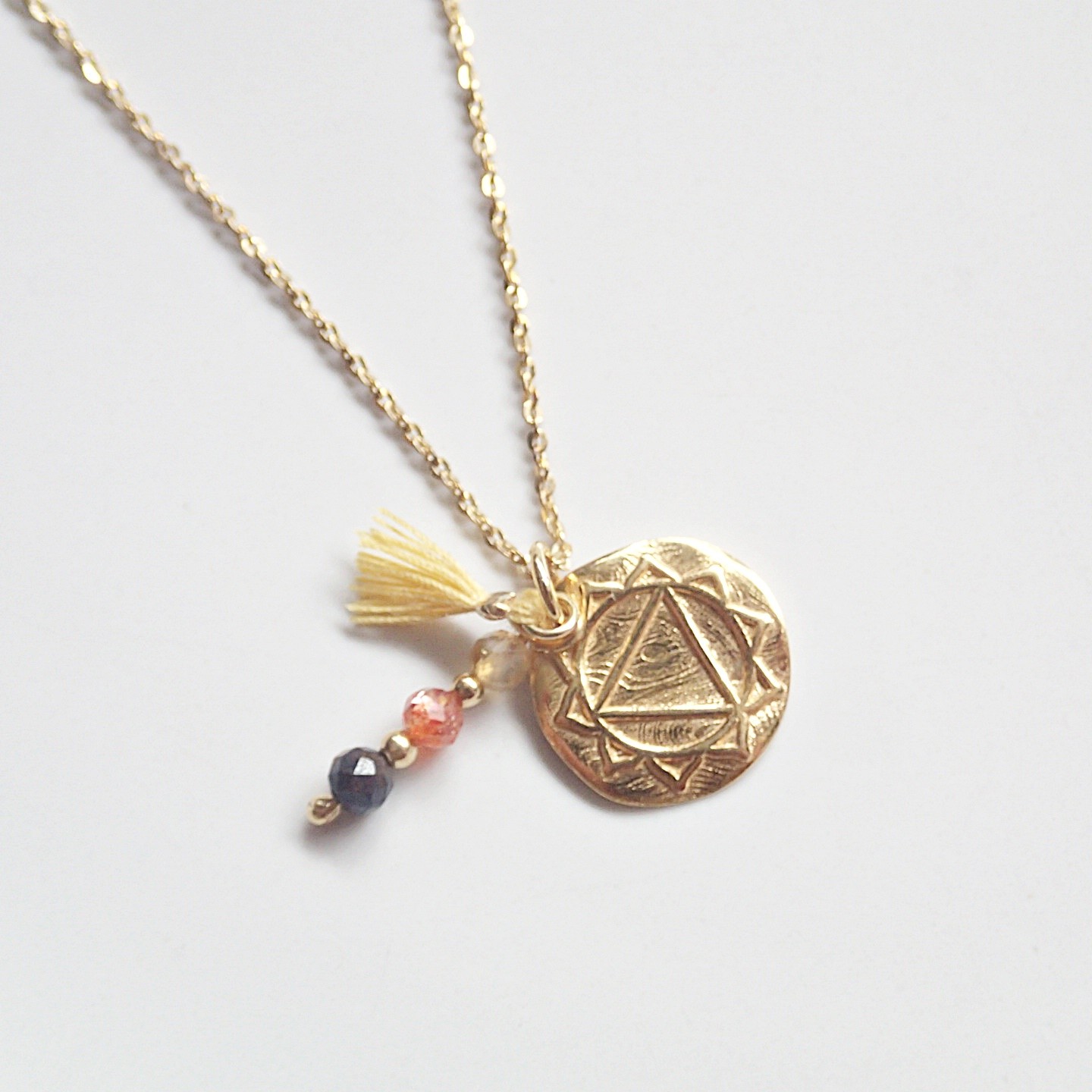 Halskette voller Symbolik. Mit einem Anhänger mit einem ausgewählten Chakra, Natursteinen und einer Mini-Quaste. Das Ganze ist aus vergoldetem Silber höchster Qualität gefertigt.