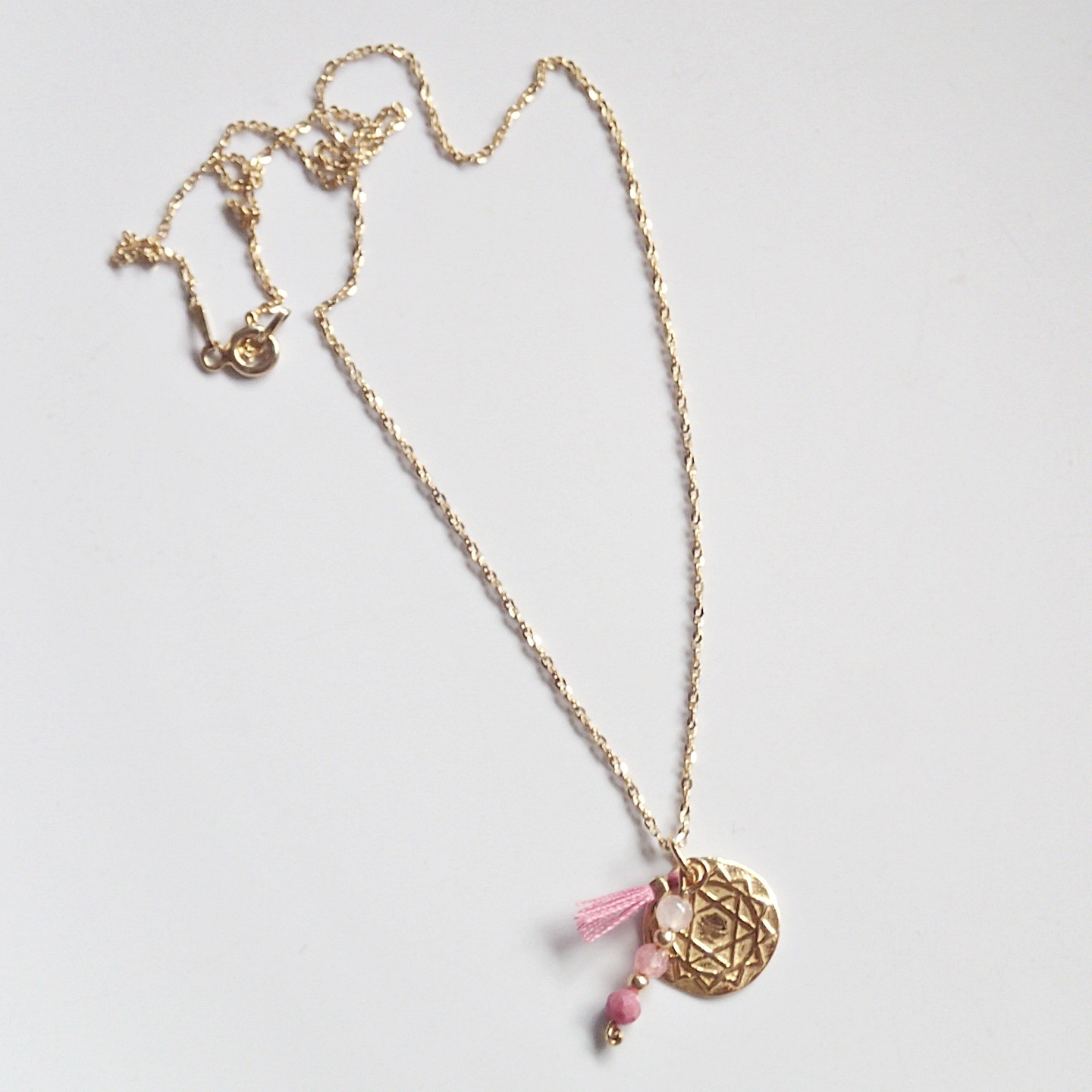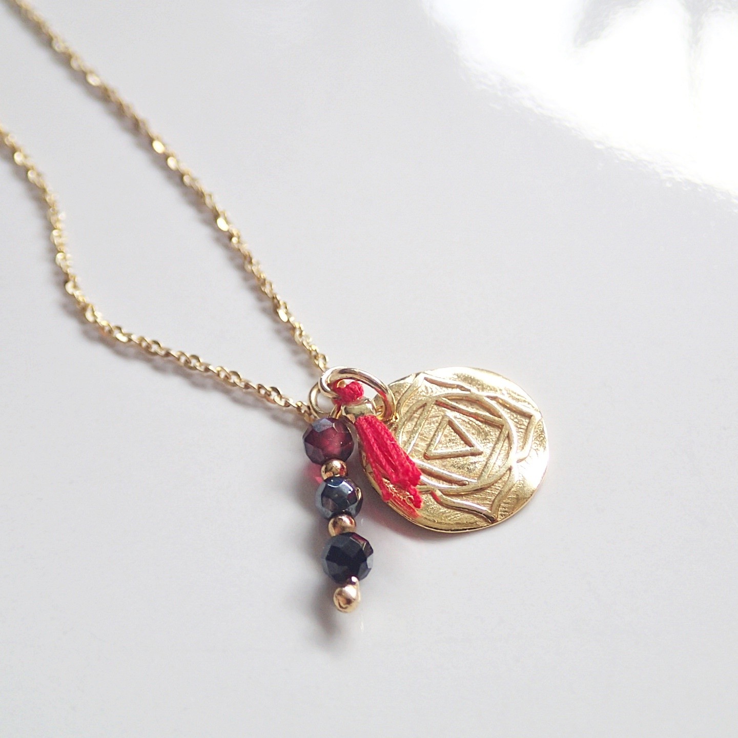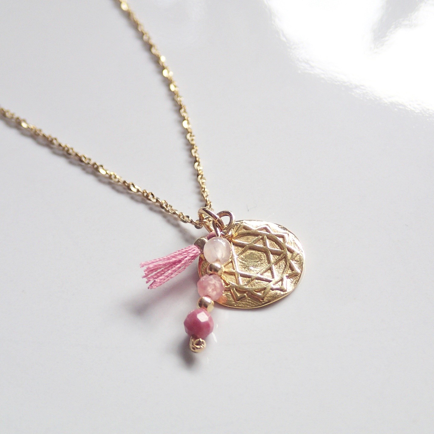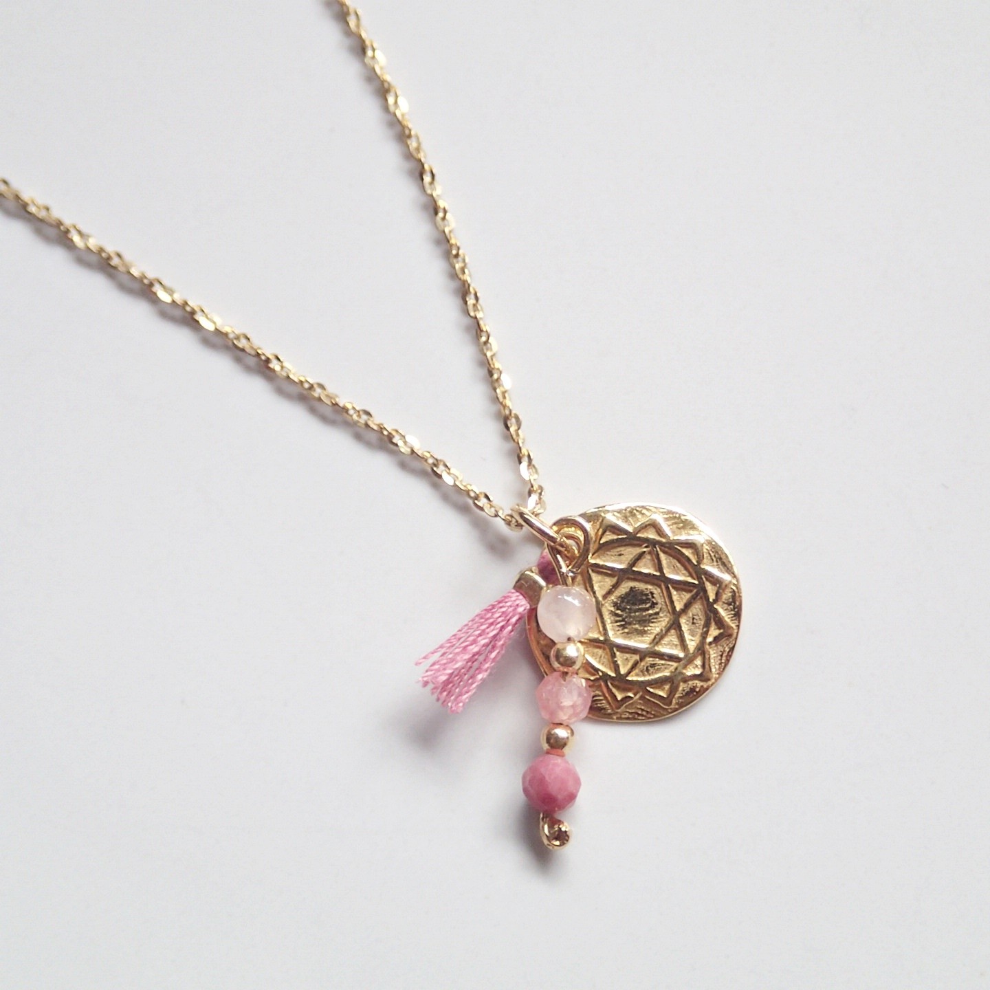 Halskette voller Symbolik. Mit einem Anhänger mit einem ausgewählten Chakra, Natursteinen und einer Mini-Quaste. Das Ganze ist aus vergoldetem Silber höchster Qualität gefertigt.
