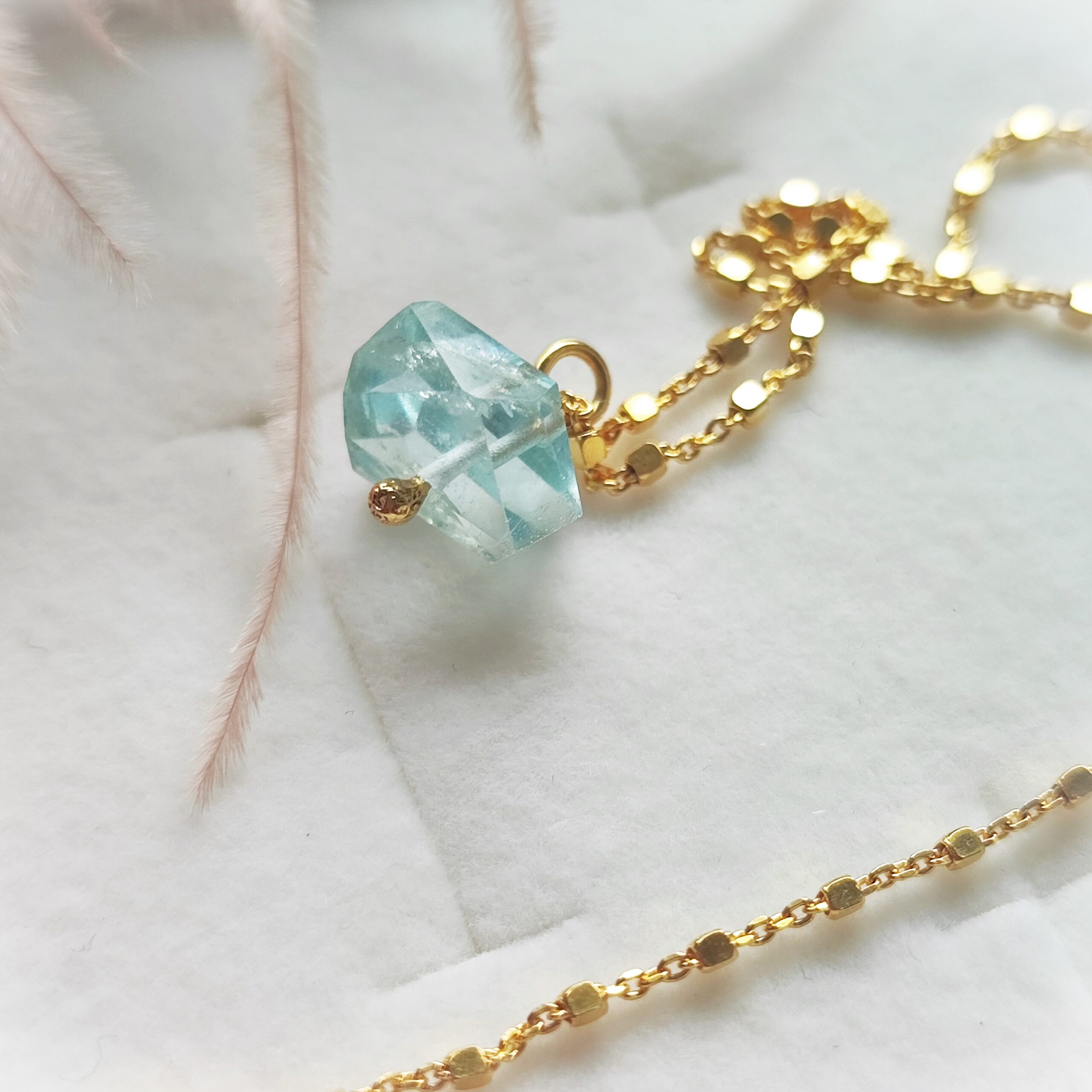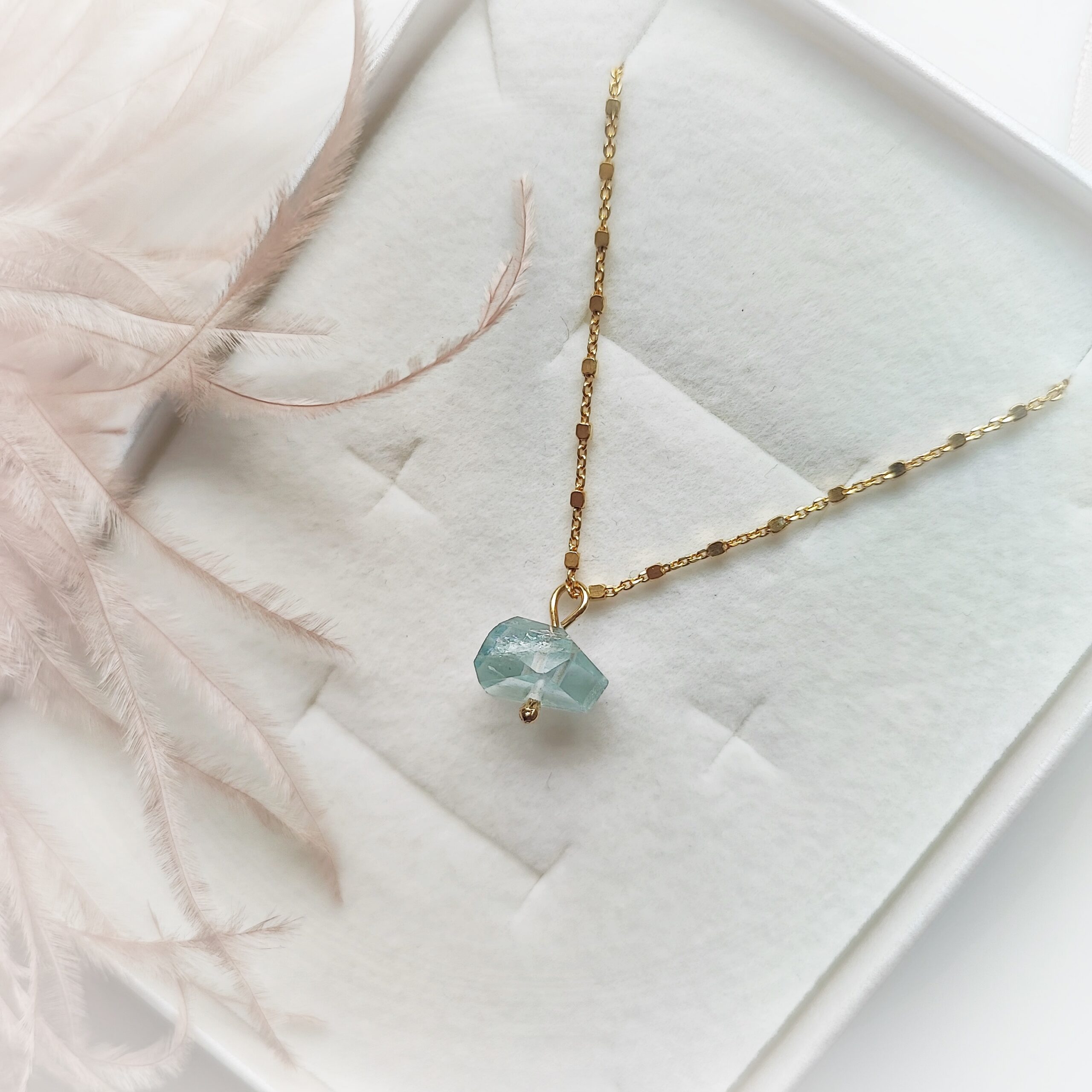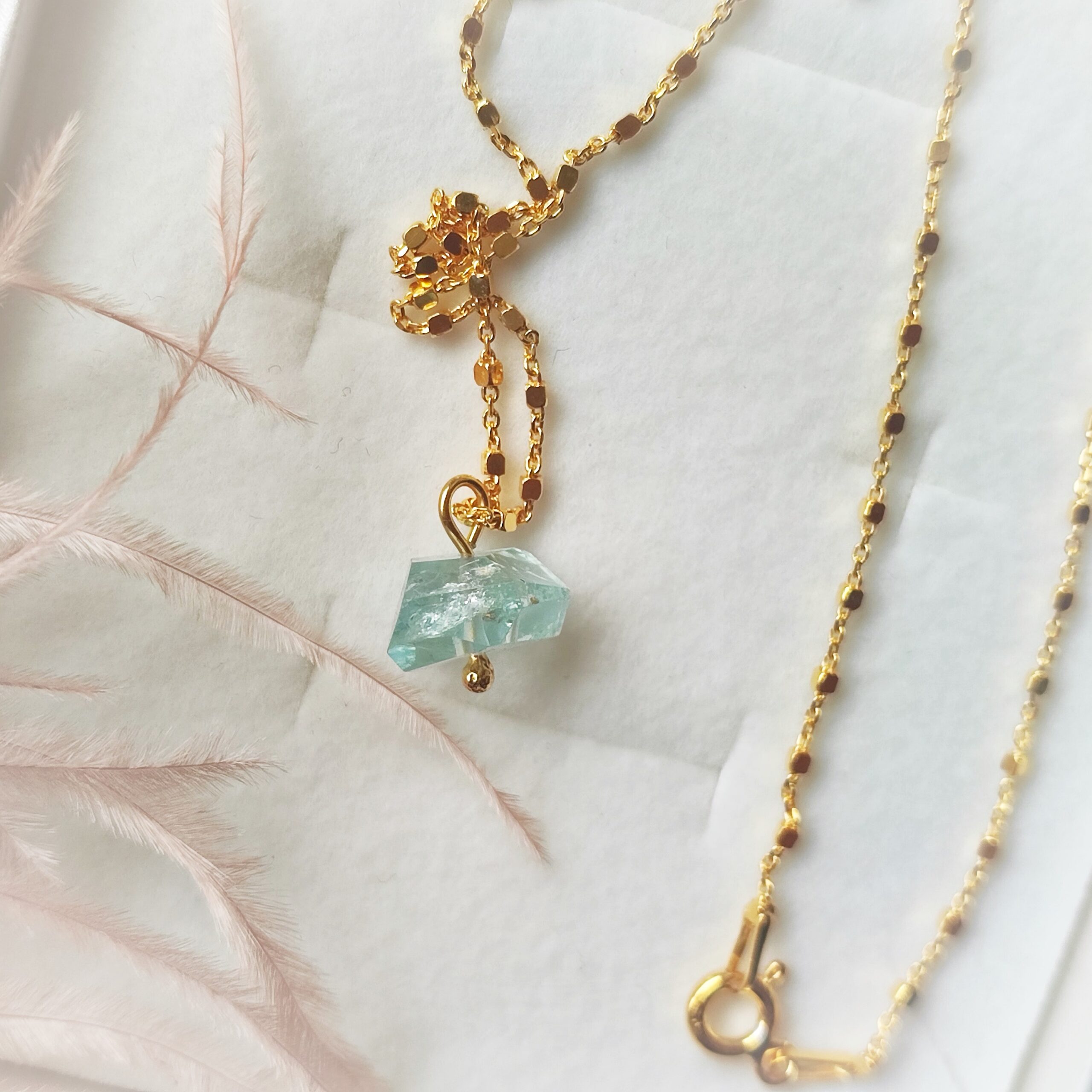 Halskette mit atemberaubendem edlen Aquamarin an einer silbernen (925), vergoldeten Kette mit kleinen Würfeln.