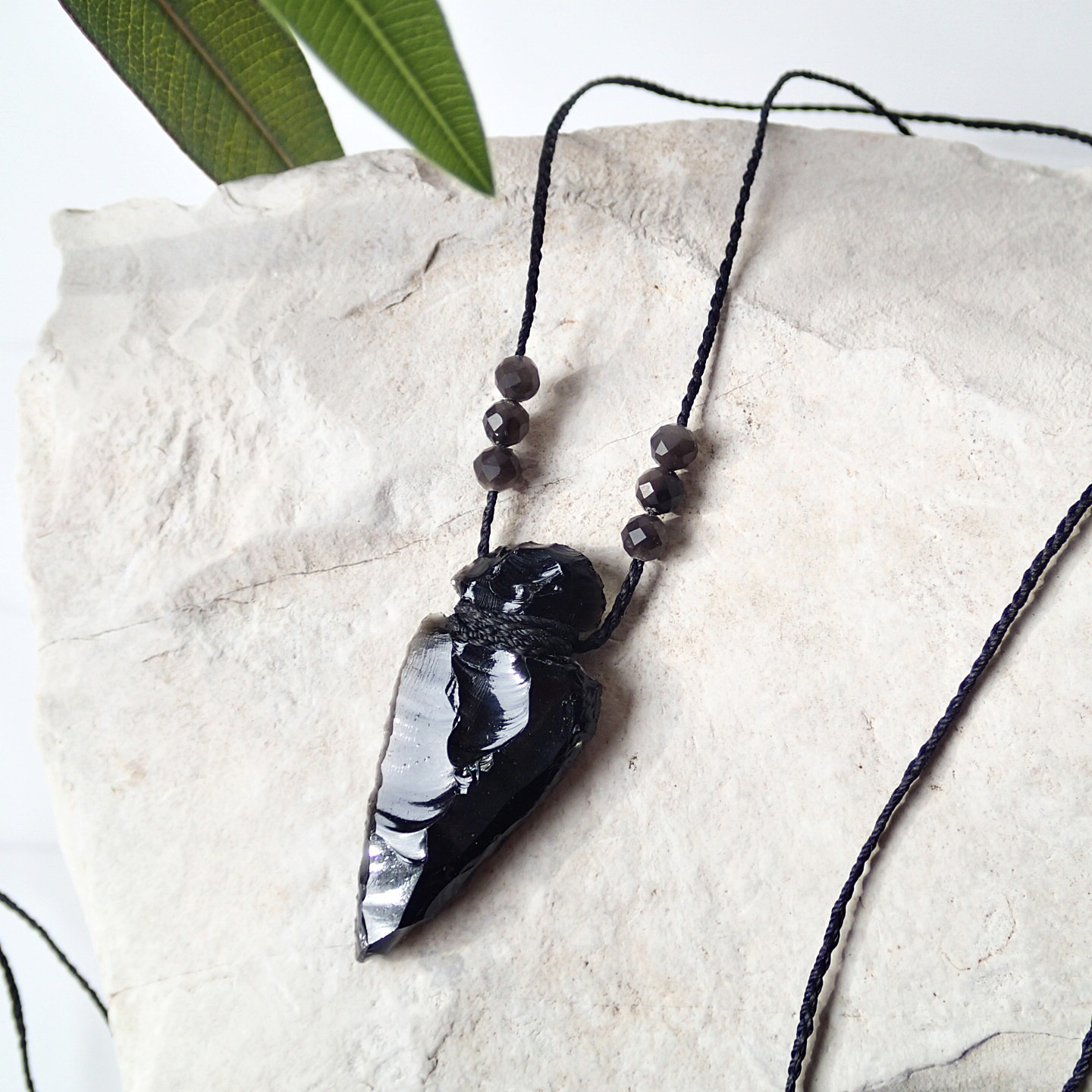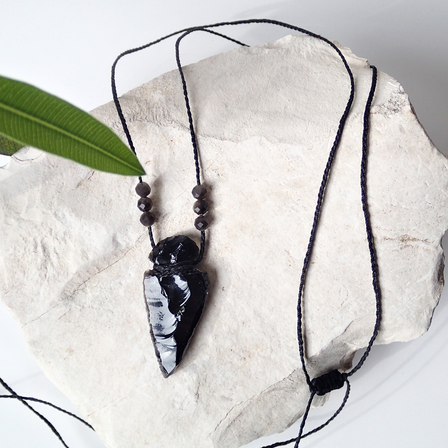 Steineigenschaften: Obsidian-Pfeilspitze ca. 40x20mm, facettierte silberfarbene Obsidiankugeln 4mm.