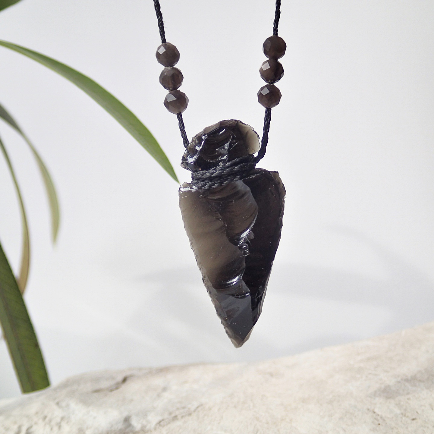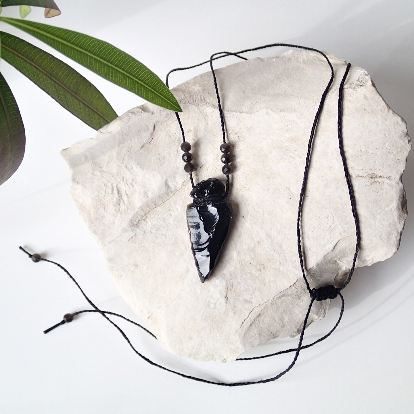 Handgefertigte, originelle Herrenhalskette. Natürlicher Obsidian, geschnitzter Pfeilspitzenanhänger sowie 6 Obsidiankugeln, die nach Belieben verschoben und angeordnet werden können.