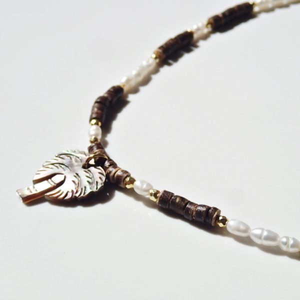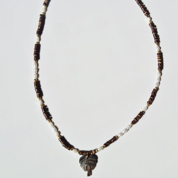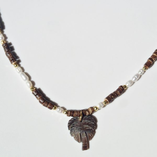 Eine handgefertigte Halskette in einem sehr festlichen, tropischen Stil aus natürlicher Kokosnussschale, Perlen und goldenem Hämatit. In der Mitte mit einer in Muscheln geschnitzten Palme verziert.