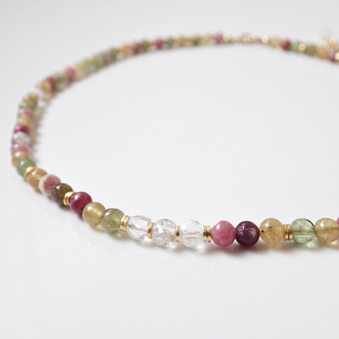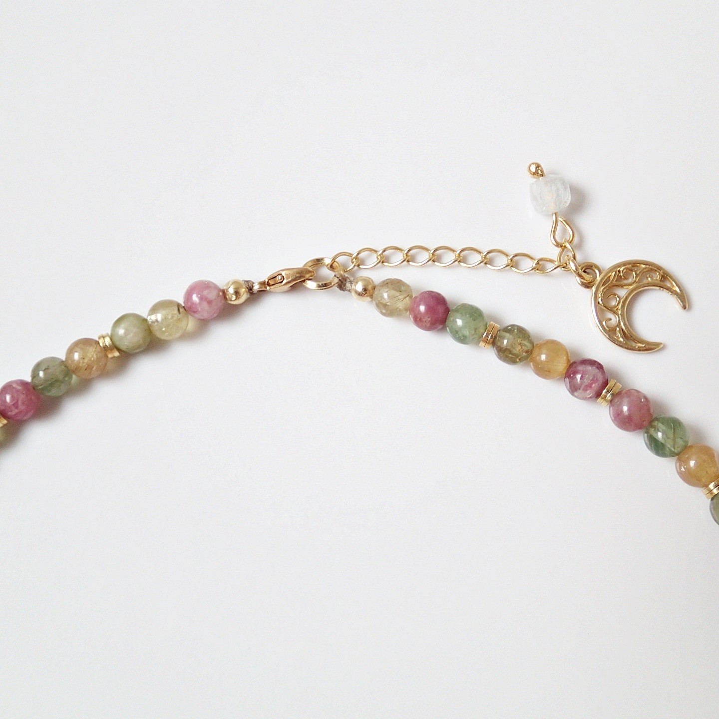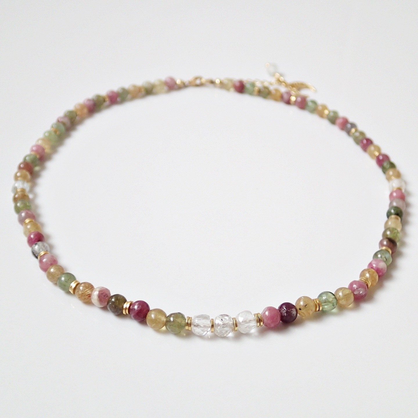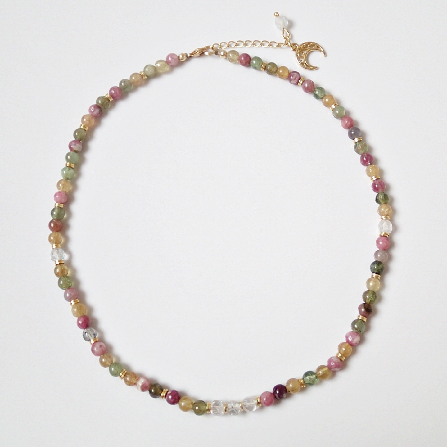 Handgefertigtes, einzigartiges Collier aus bunten, transparenten Natur-Edelsteinen – Turmaline und weißer, klarer Topas mit ungewöhnlicher Form. Das Ganze ist großzügig mit Silber (925) verziert, das mit 24 Karat Gold vergoldet ist. In den Steinen können Sie zahlreiche Einschlüsse, Glitzer und den Katzenaugeneffekt beobachten. Das Ende der Verschlussverlängerung ist mit einer Halbmond – Lunula und einem Topas-Würfel verziert