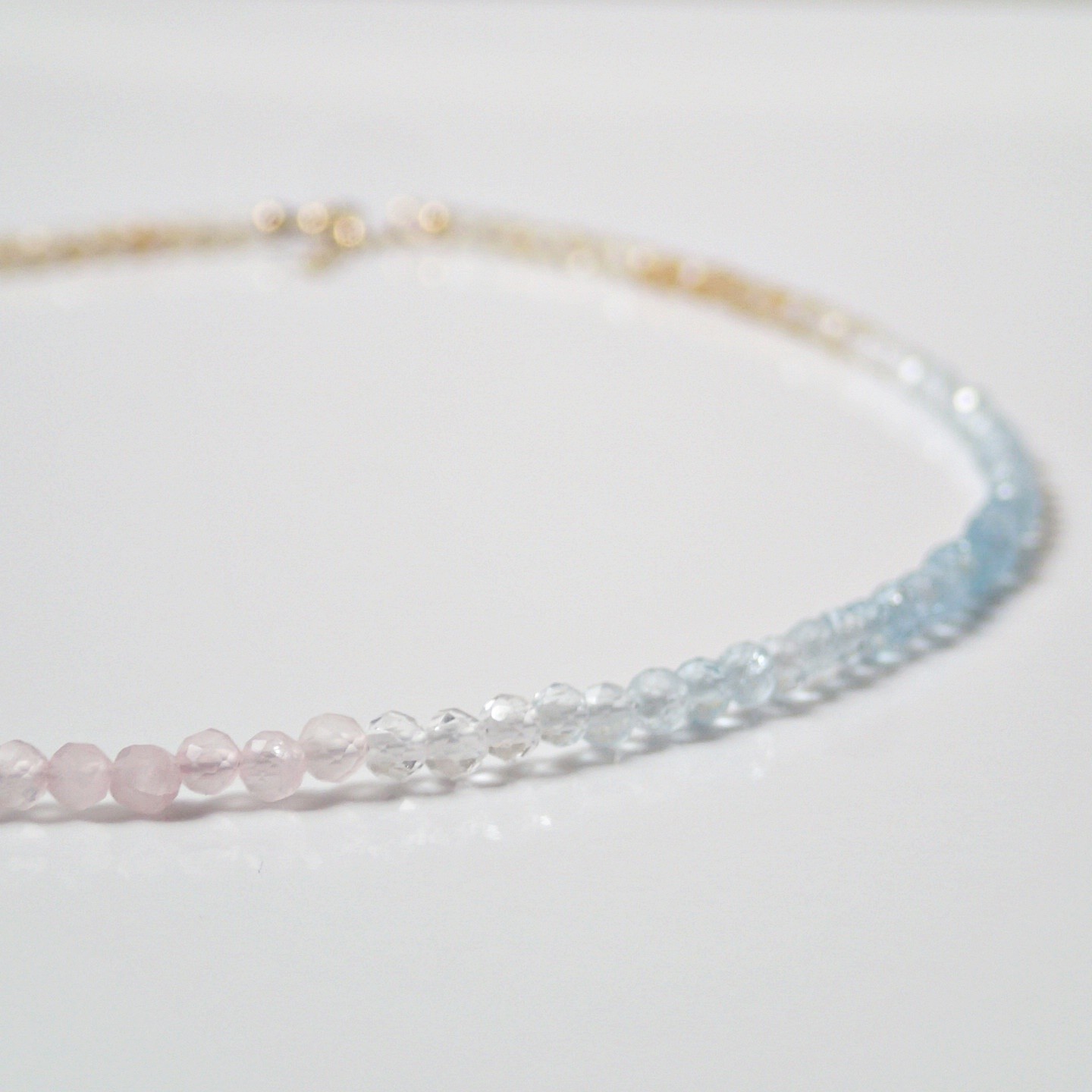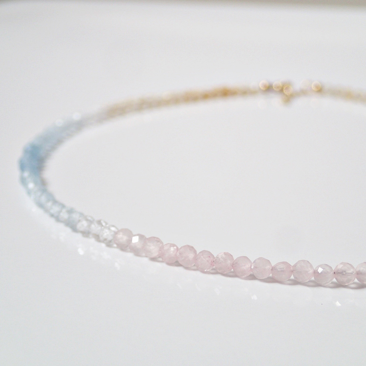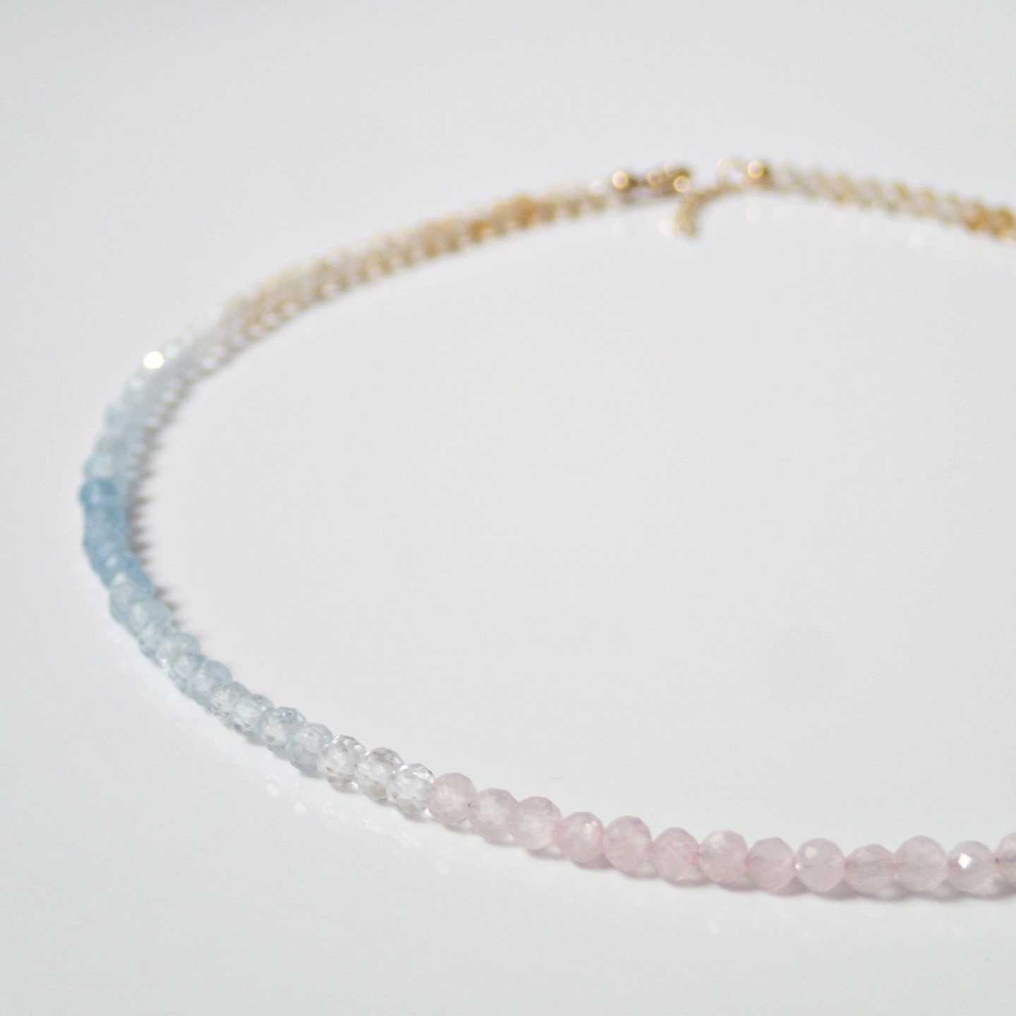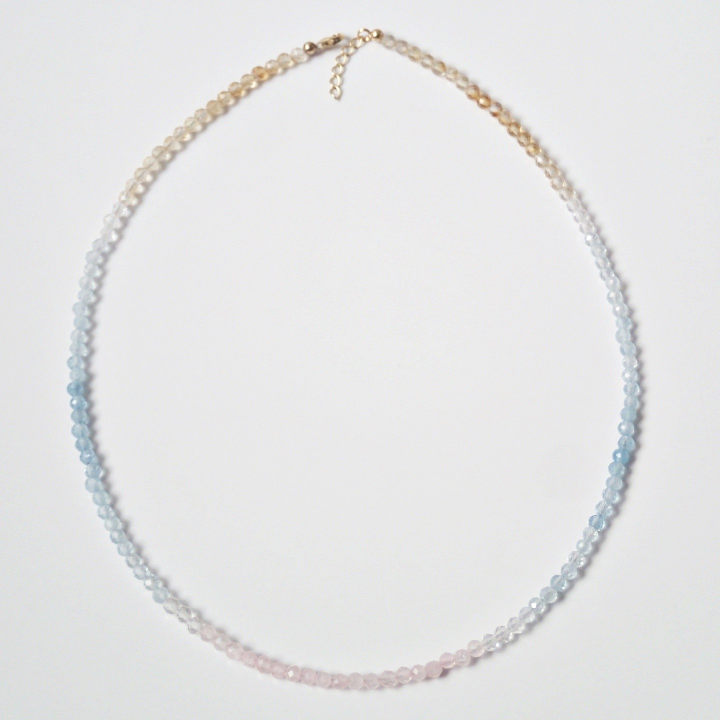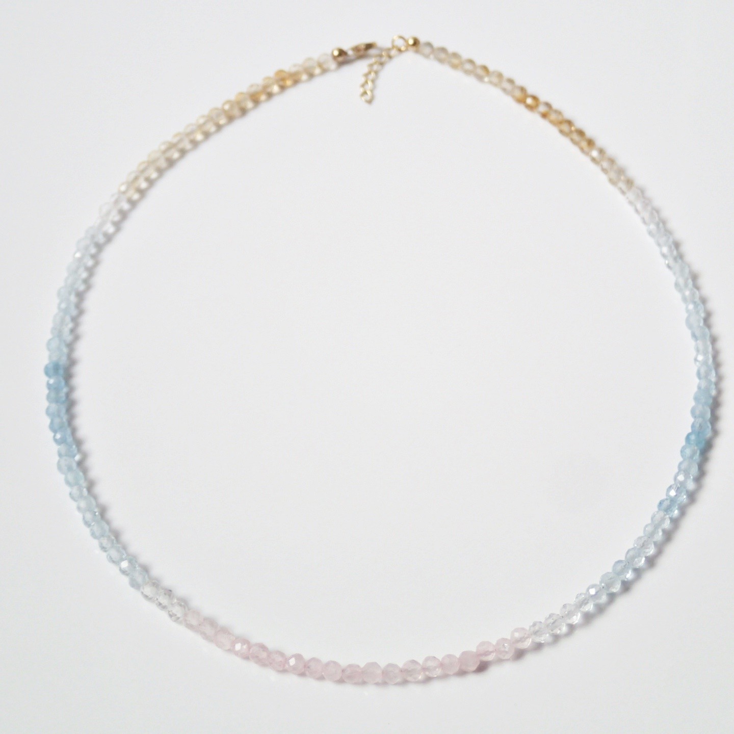 Eine wunderbare, einzigartige Halskette in Chokergröße. Hergestellt aus Natursteinen, die mit Farben gruppiert sind, so dass die Farben harmonisch fließen. Die verwendeten Steine sind Rosenquarz, weißer Topas, Aquamarin und Citrin. Die Farben sind 100% natürlich. Die Befestigungselemente sind aus vergoldetem Silber.