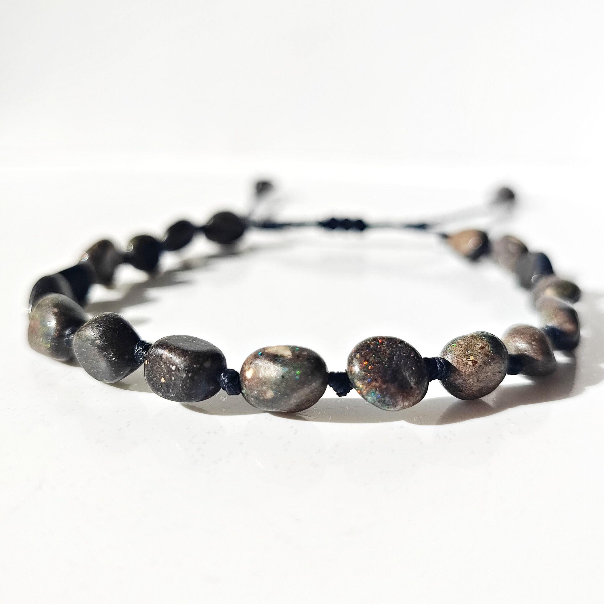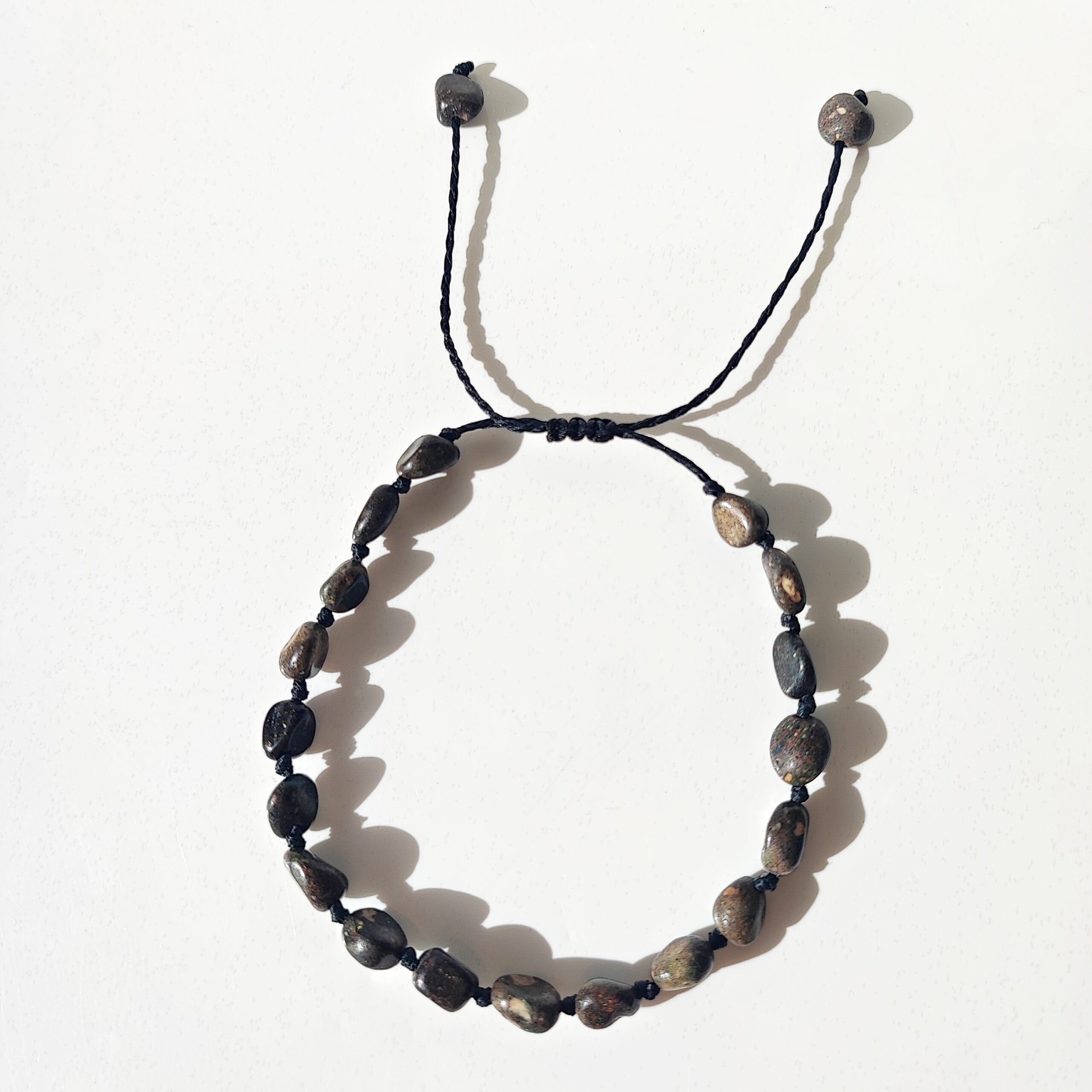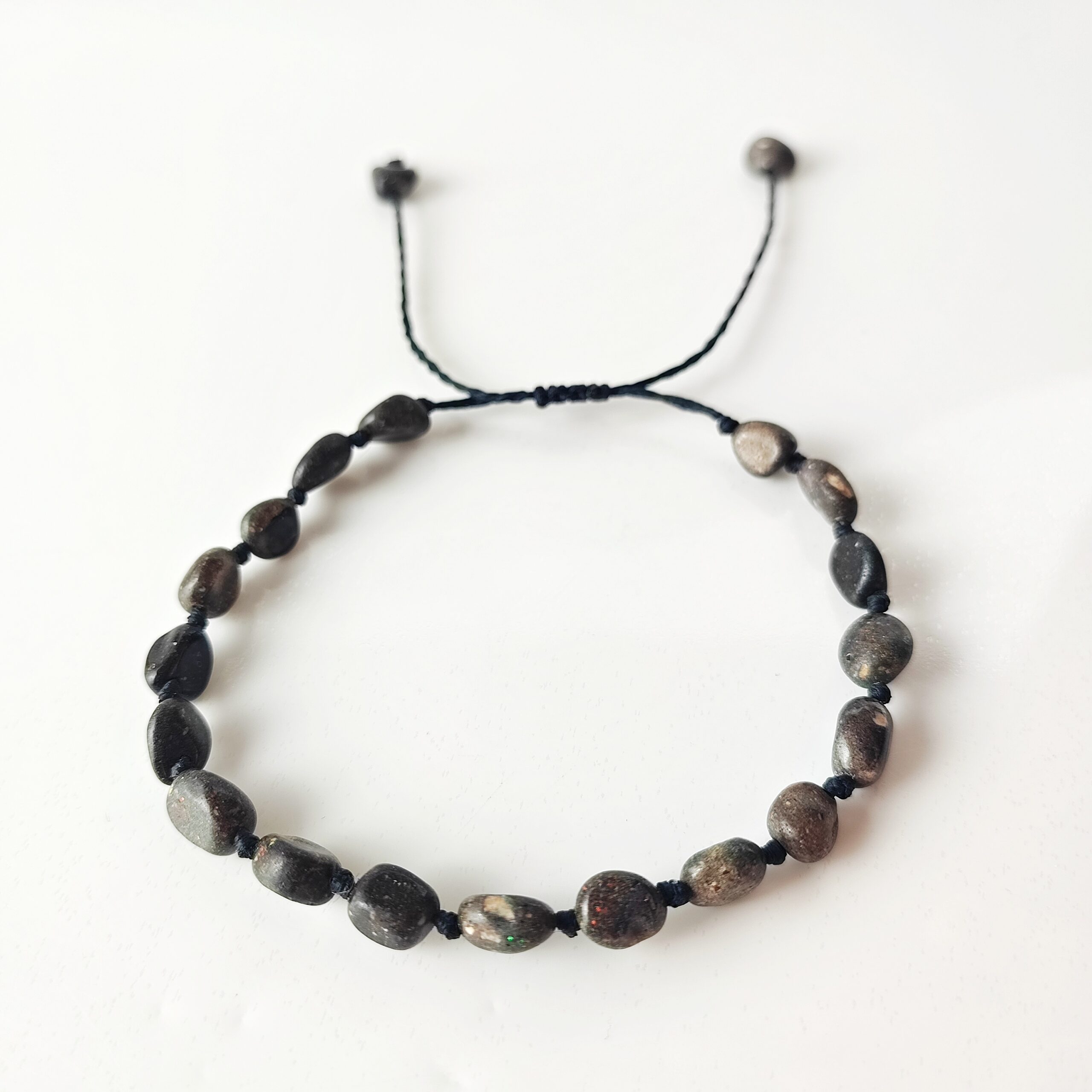 Das Armband ist auf einer robusten schwarzen Kordel gefertigt und durch ein verschiebbares Knotensystem größenverstellbar. So lässt es sich individuell an das Handgelenk anpassen und angenehm im Alltag tragen.