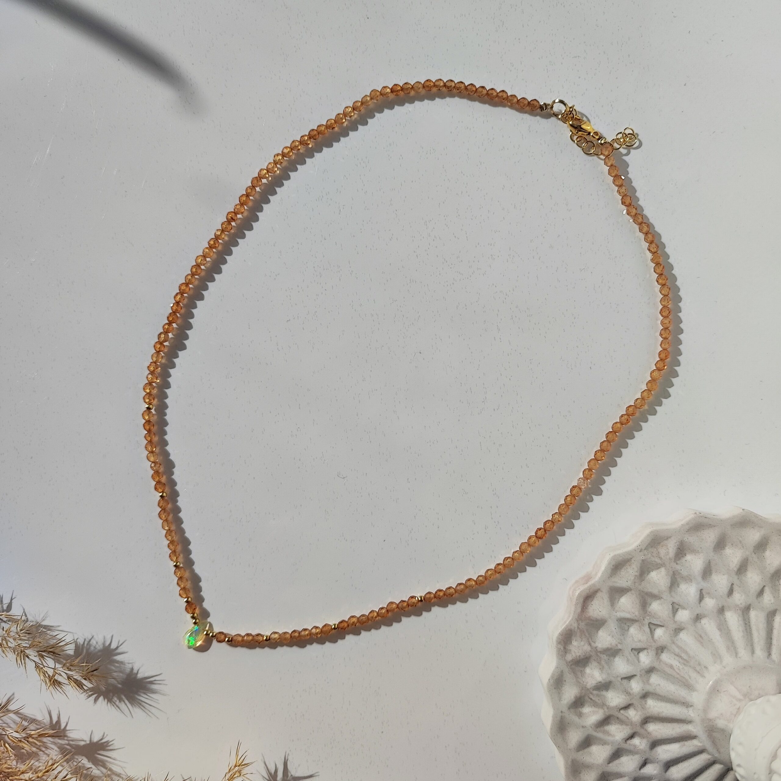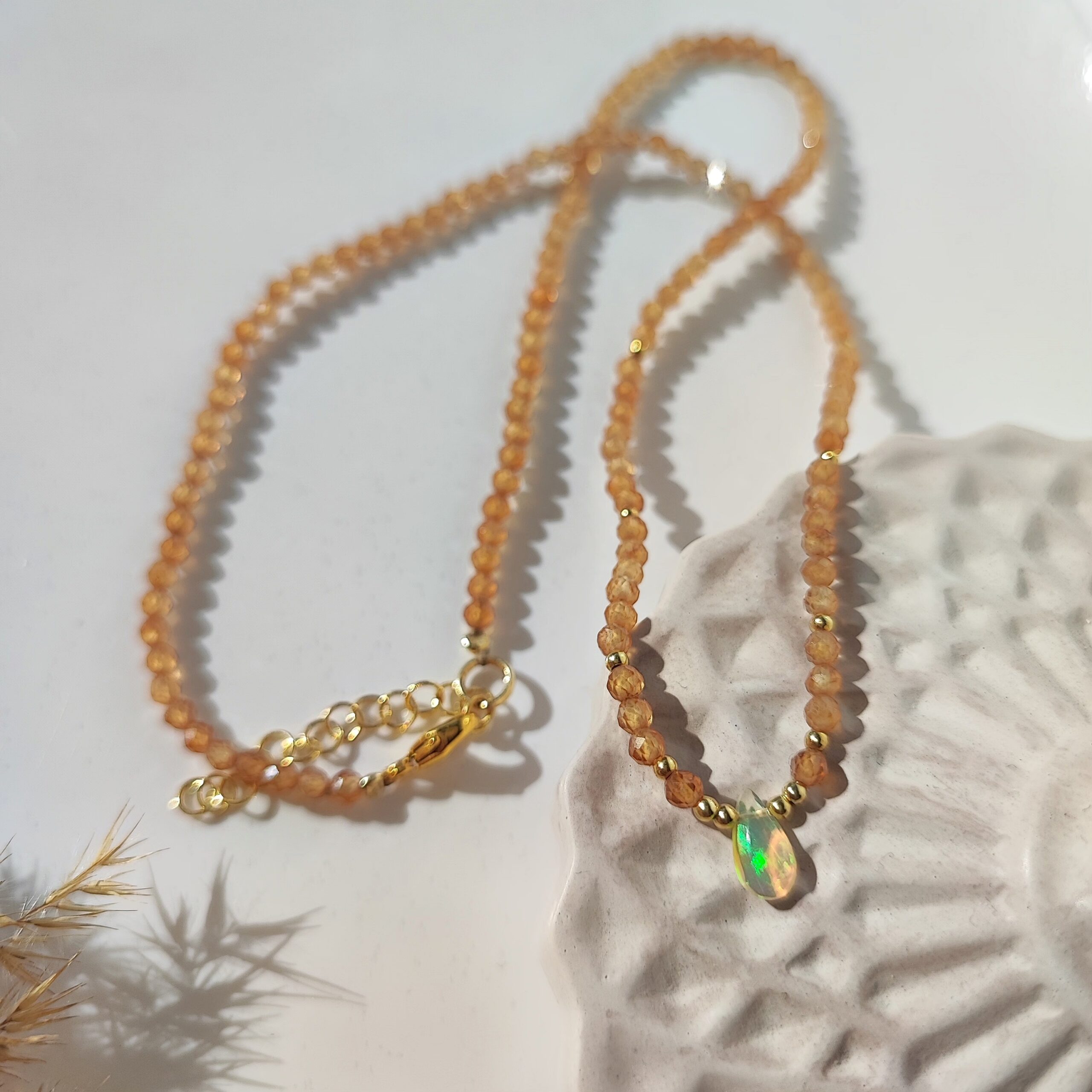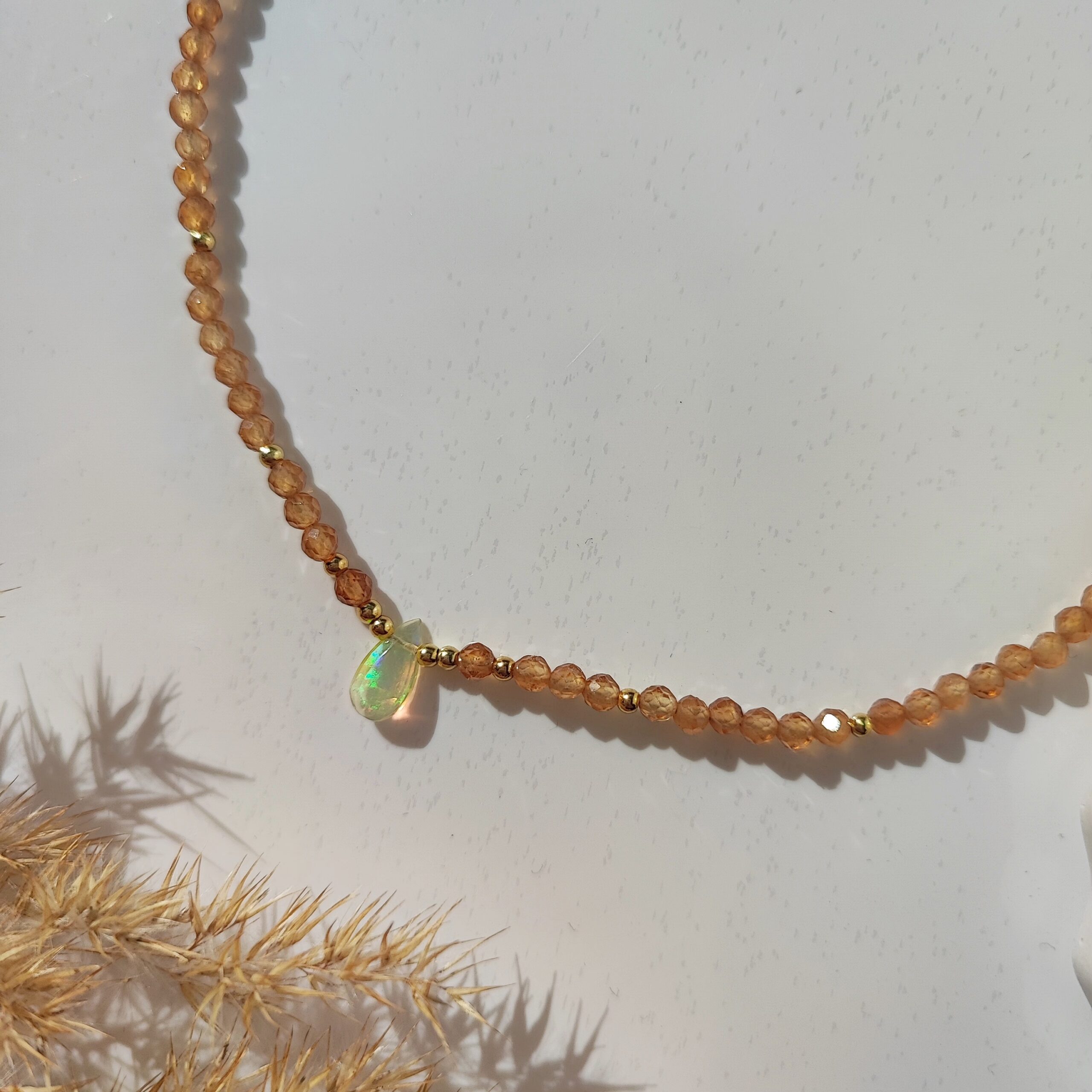 Handgefertigte, funkelnde Halskette aus natürlichen Steinen: Spessartin (Spessartin, orange Granat – kleine Perlen) und Welo-Opal (funkelnd in grün-orange – Stein in der Mitte). Die Halskette ist mit einem Verschluss und dekorativen Elementen aus 24-karätig vergoldetem Silber 925 versehen.