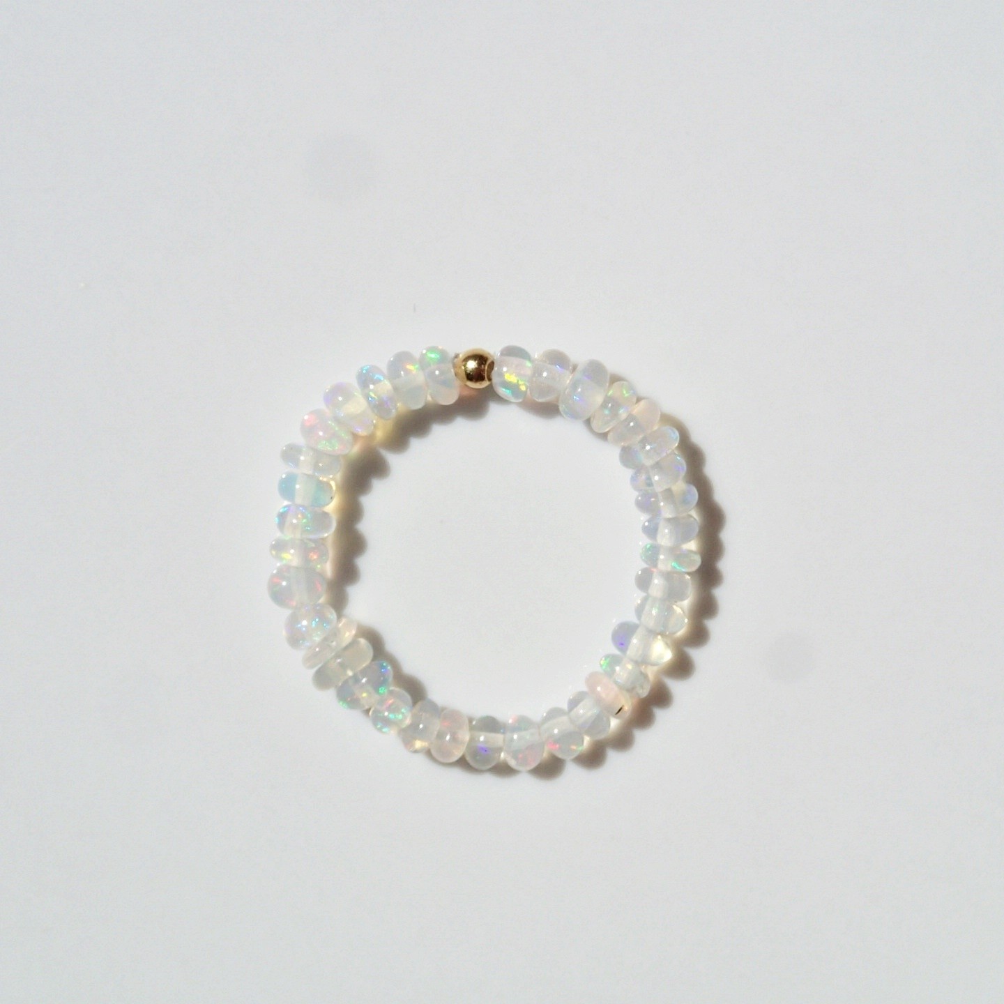 Ein handgefertigter Ring aus natürlichem, kostbarem Opal an einem dünnen elastischen Schmuckgummi. Verziert mit einer mit Silber (925) vergoldeten Perle.