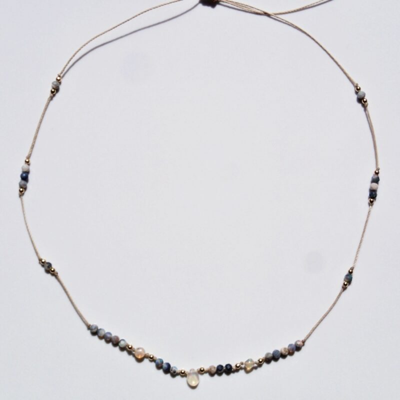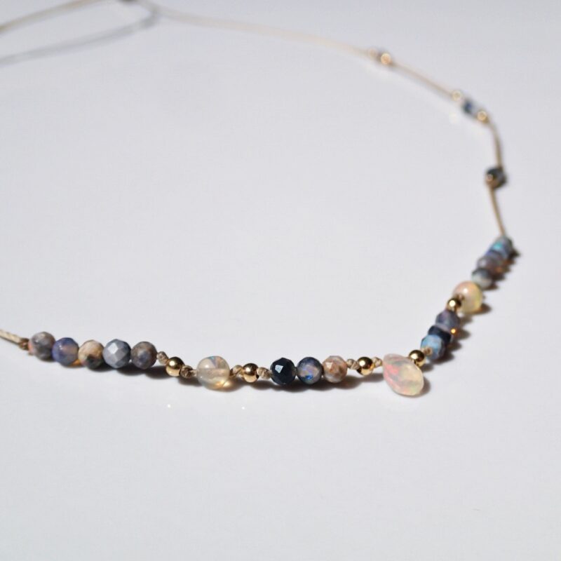 Merkmale der Steine: Mexikanischer Opal, facettierte Kugel 2 mm, Welo-Opal, glatte Kugel ca. 4 mm